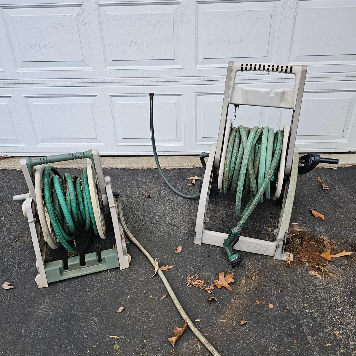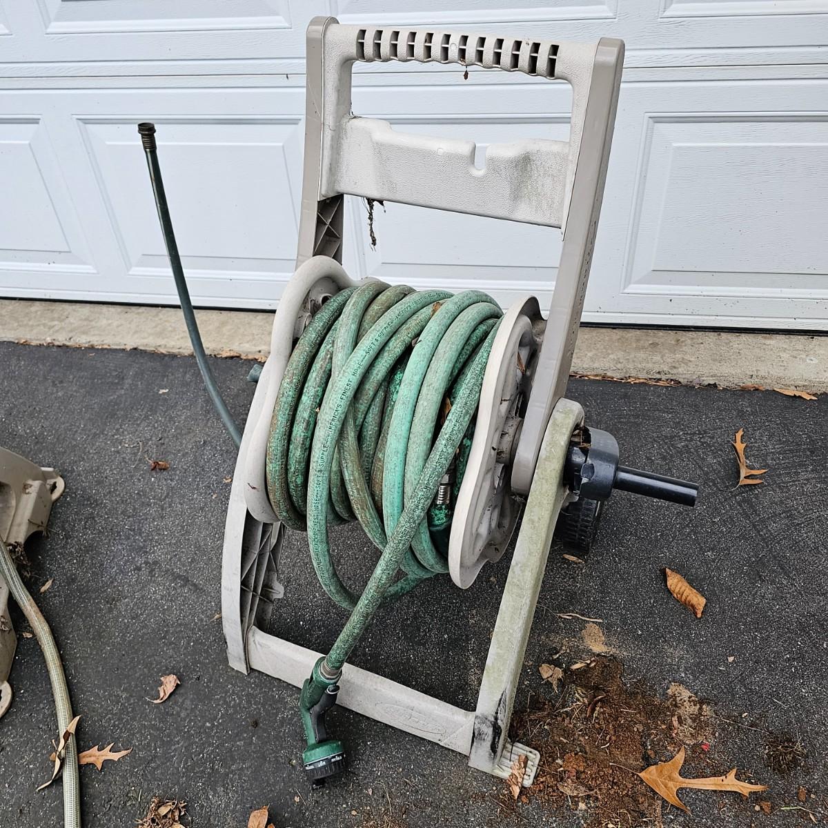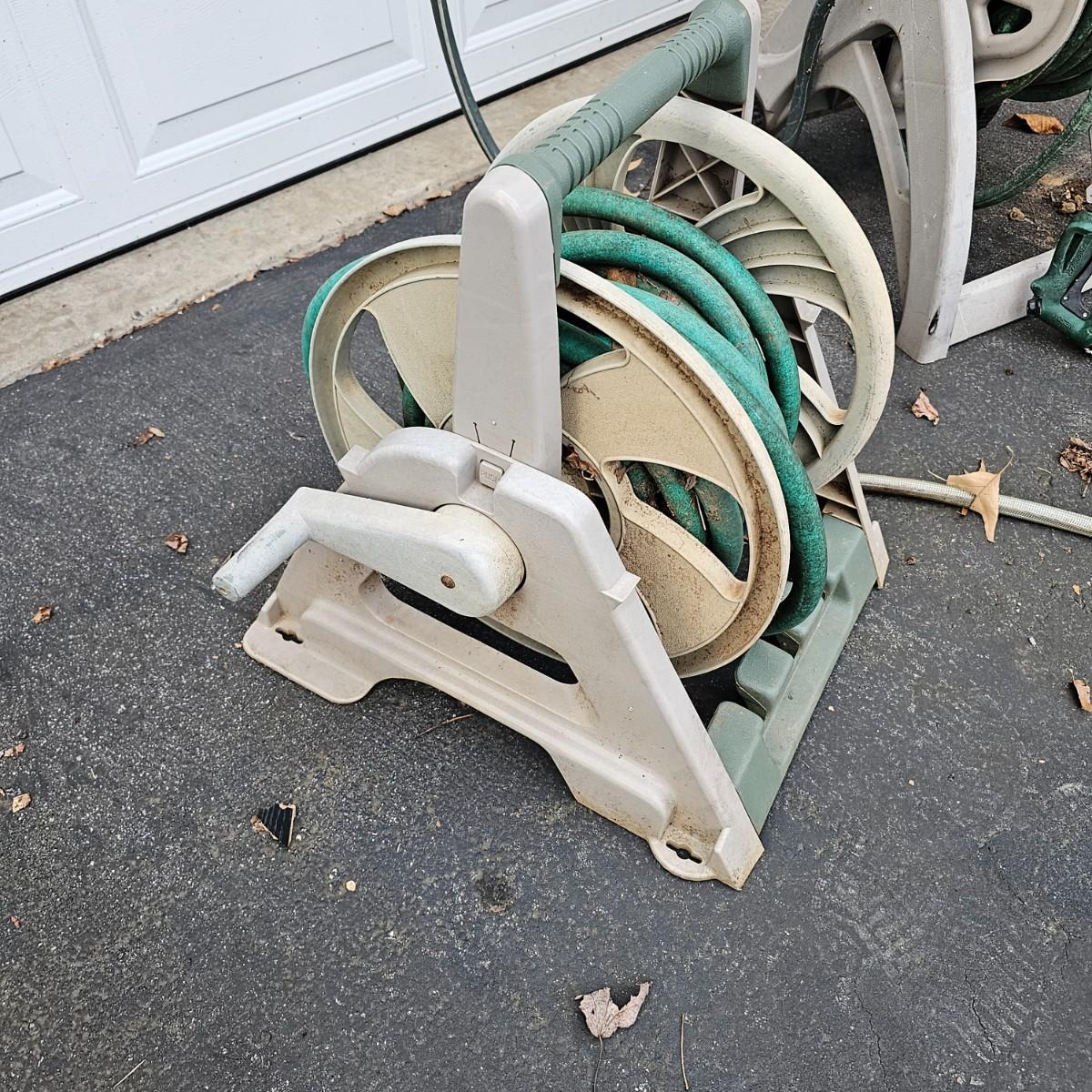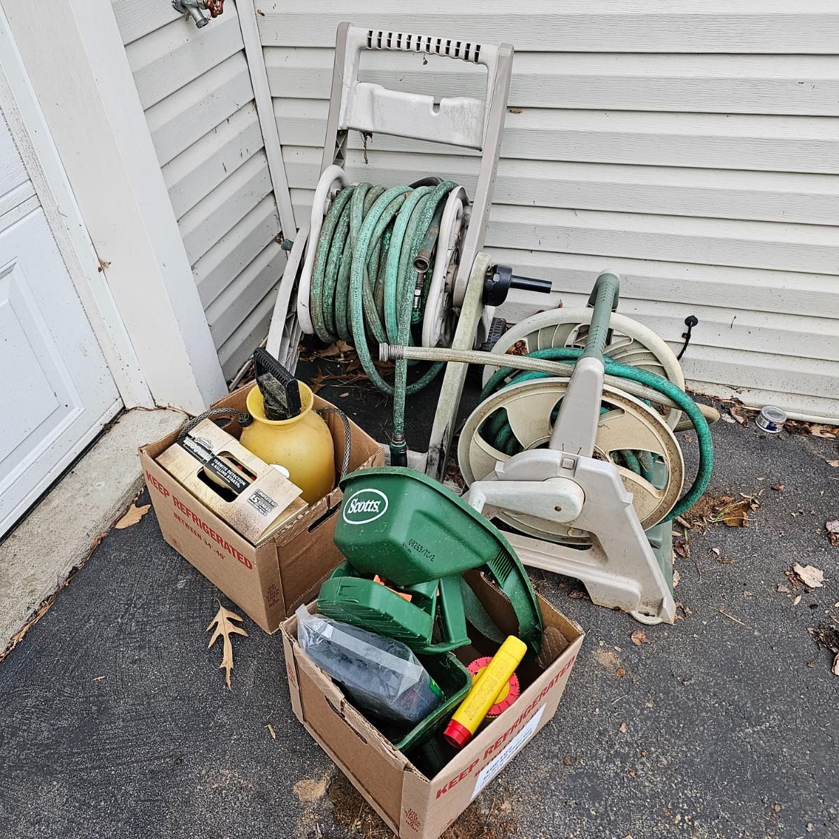 Two hose reel carts with hoses, some hand spreaders and more. Two Scotts hand spreaders, one 4 gal Roundup pump sprayer, faucet covers and a partial used termite treatment set. Hose reels measure 22" x 24" x 31" for the large one and 18" x 18" x 20" for the small one. See photos for details. Local pickup only.