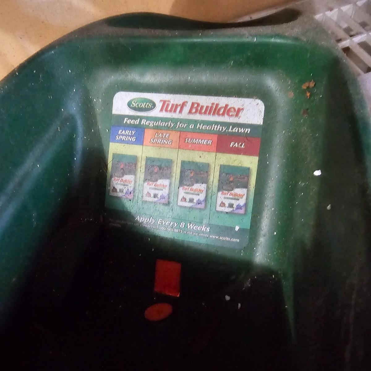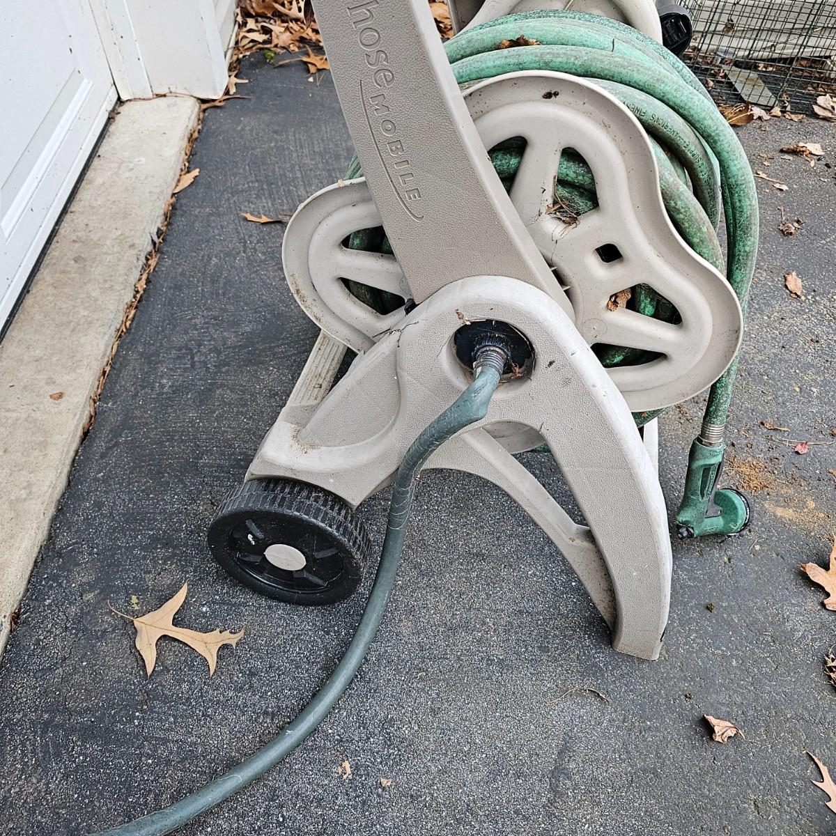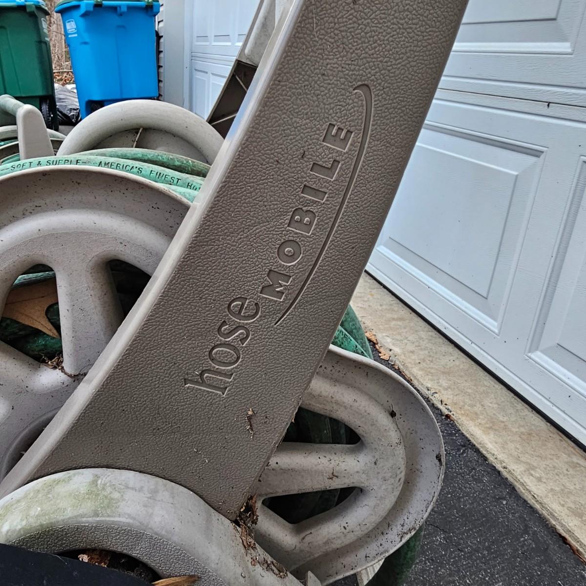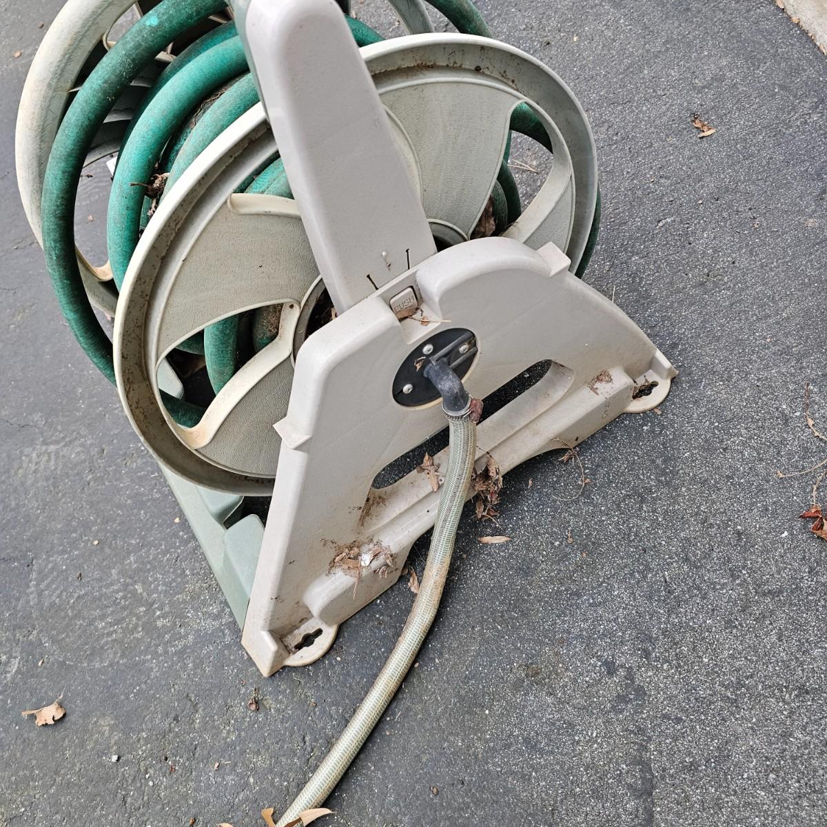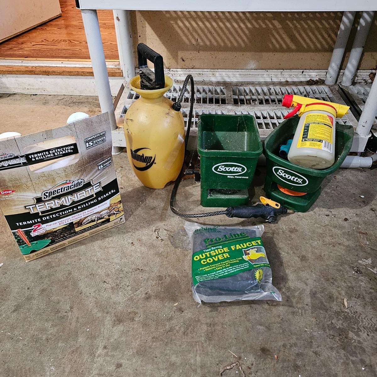 Two hose reel carts with hoses, some hand spreaders and more. Two Scotts hand spreaders, one 4 gal Roundup pump sprayer, faucet covers and a partial used termite treatment set. Hose reels measure 22" x 24" x 31" for the large one and 18" x 18" x 20" for the small one. See photos for details. Local pickup only.