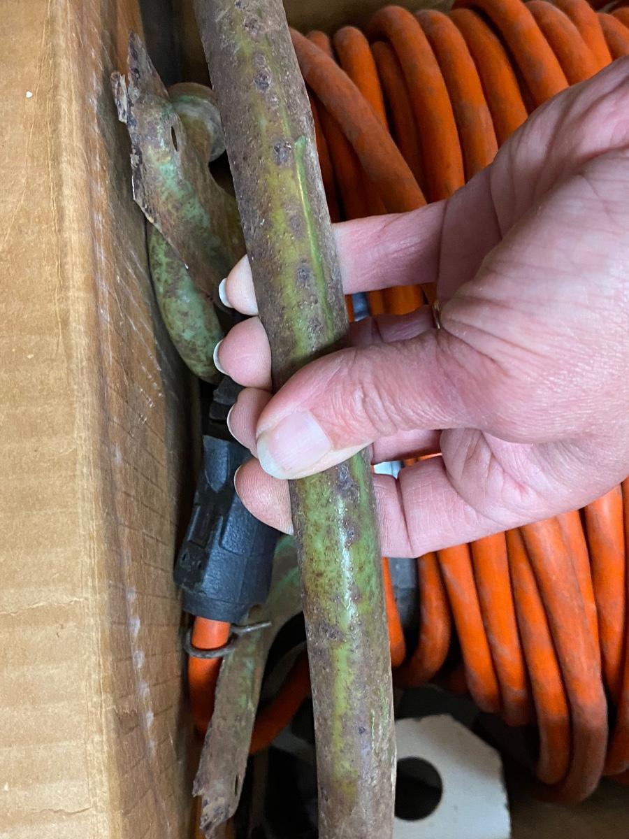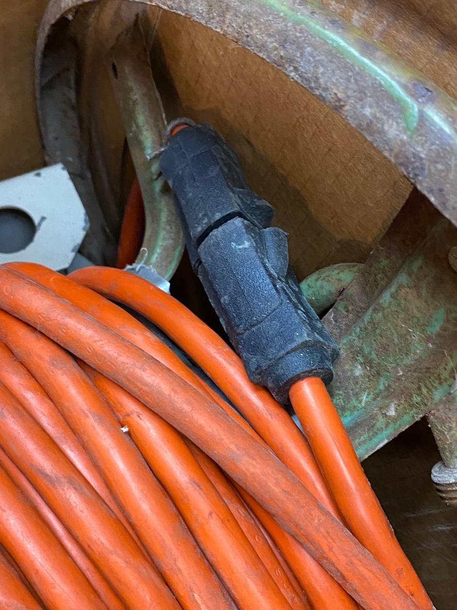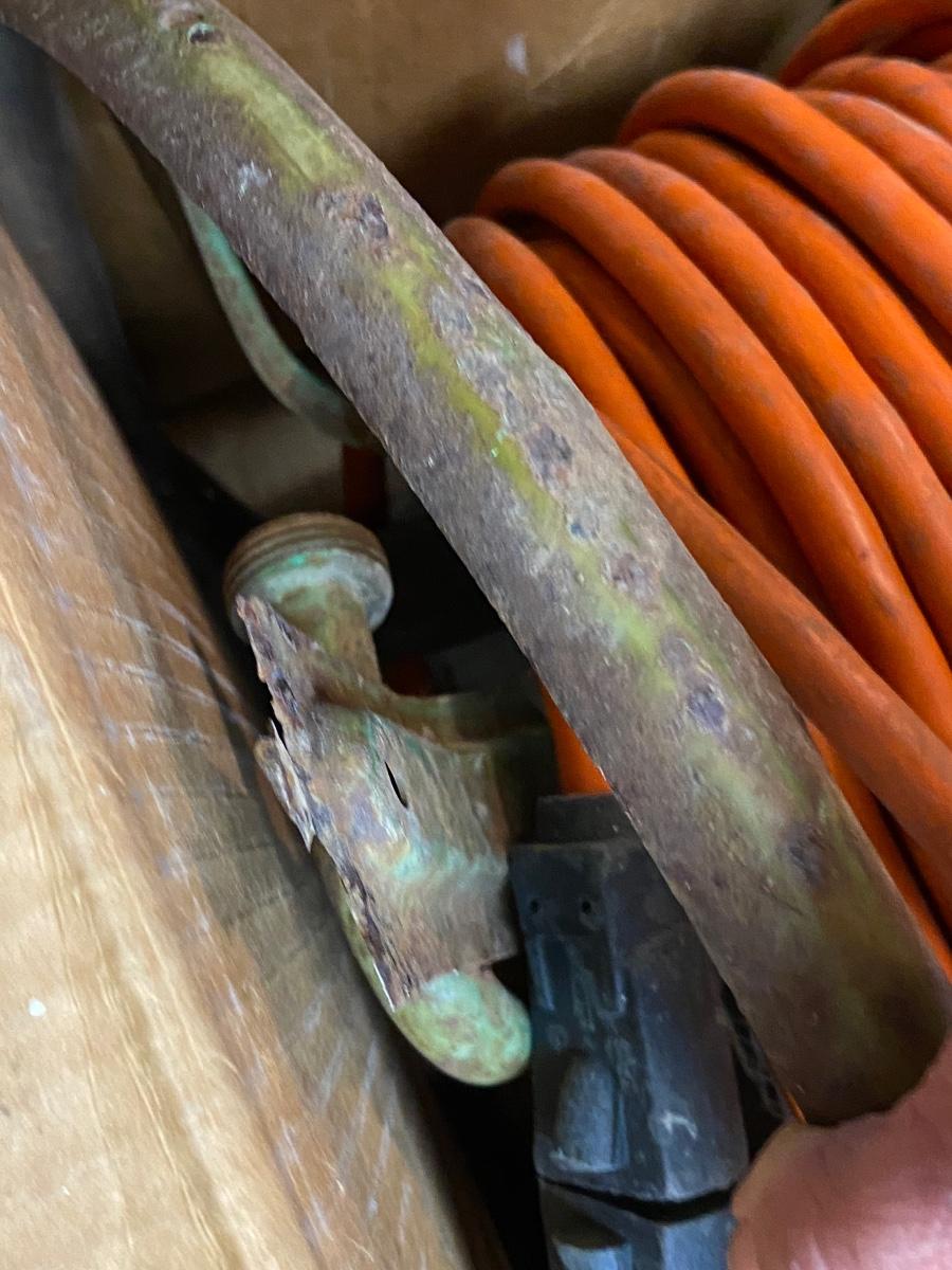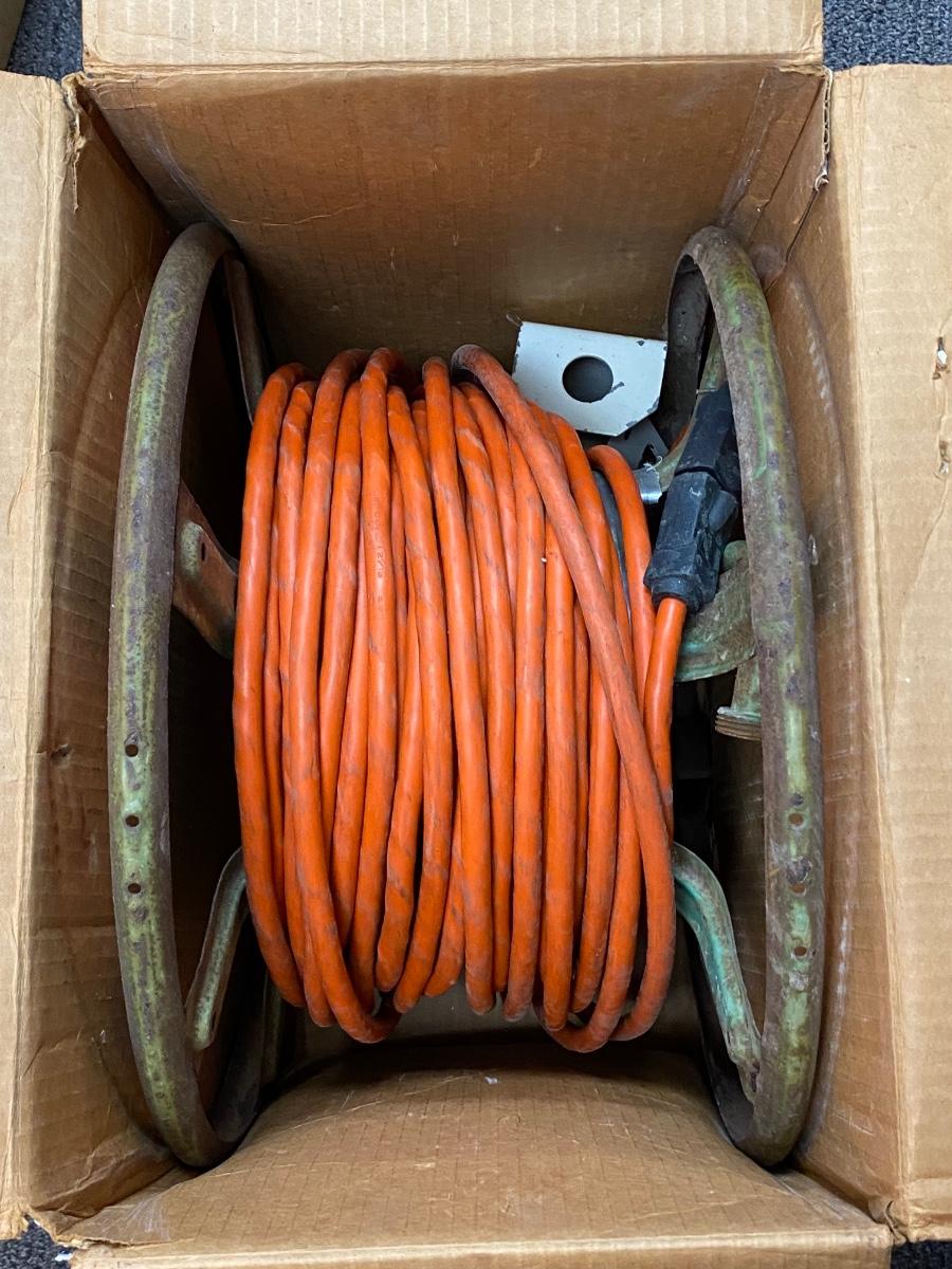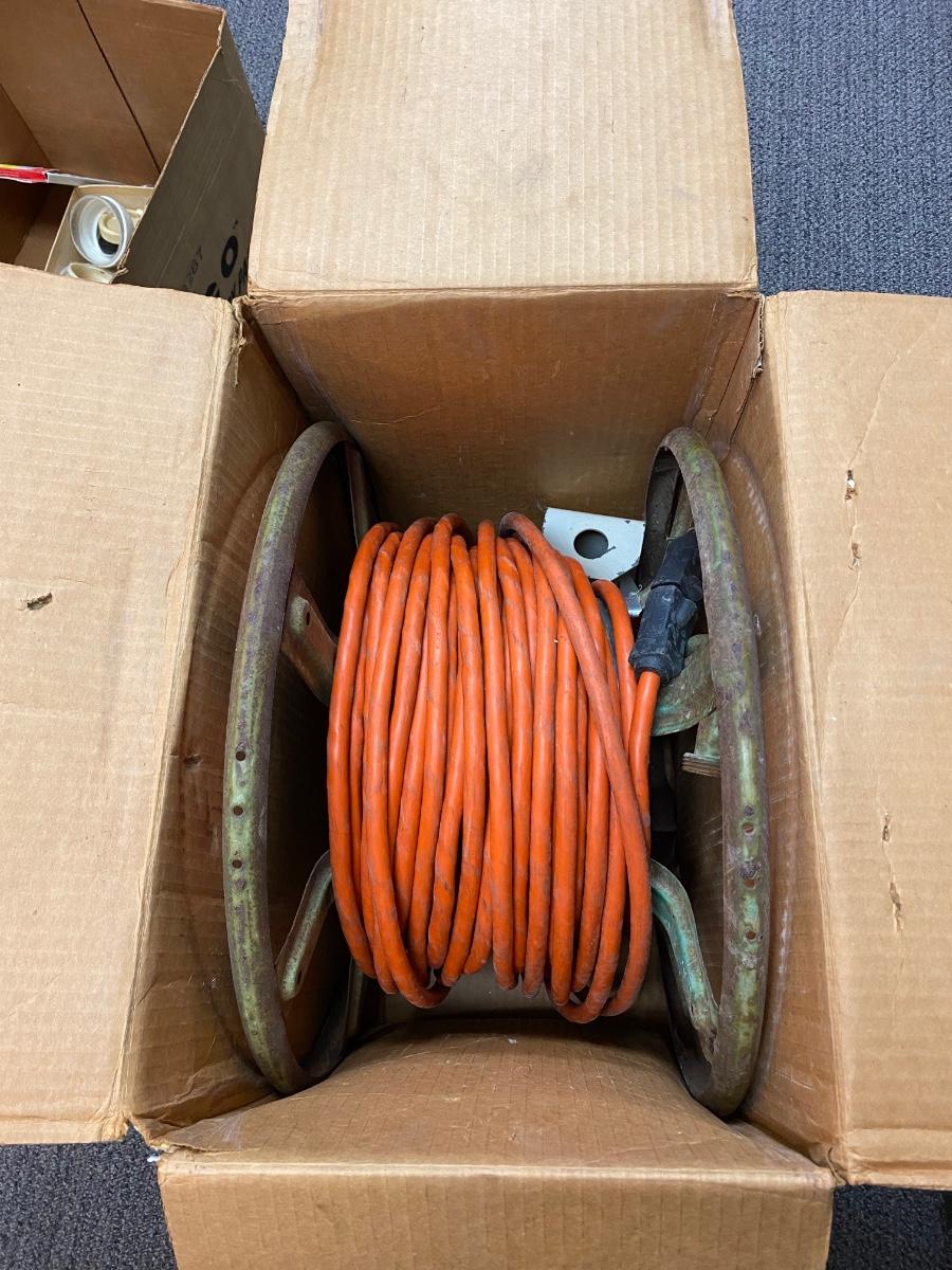 Old Metal Hose Winding Reel with Extra Long Extension Cord. Metal is falling apart on one side from age. Did not remove from box. Cord looks to be good length.