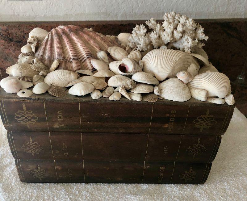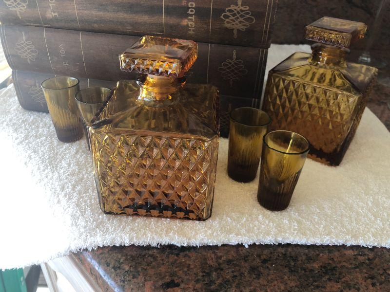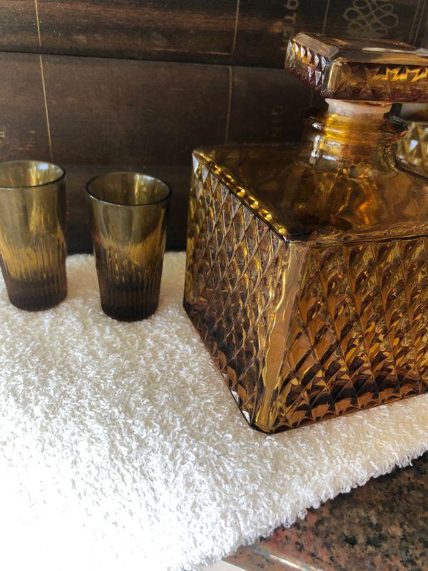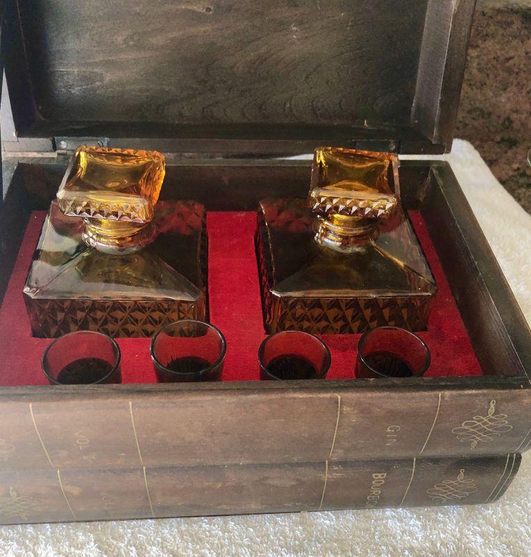 Vintage hidden decanter set. Looks like a couple stacked books. Amber colored glass. In good condition. YD# 022-0188