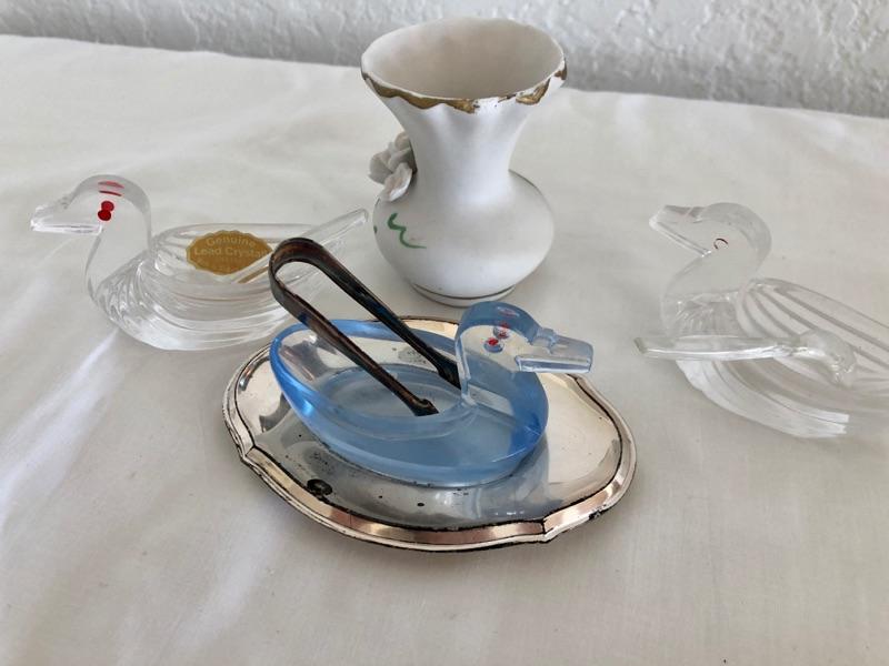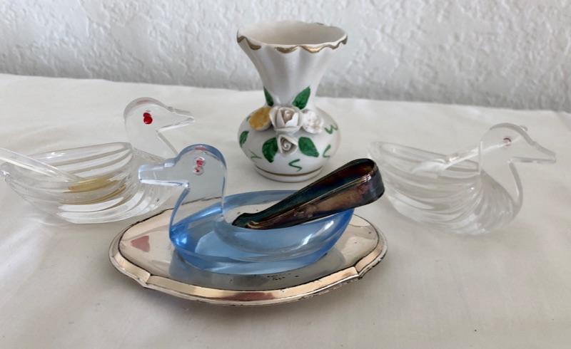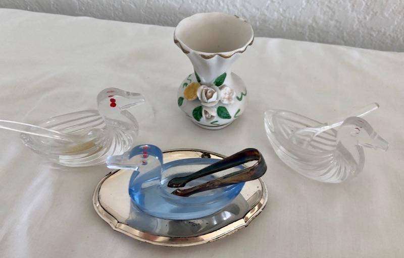 3 bird shaped salt cellars and a miniature porcelain vase. Good condition.