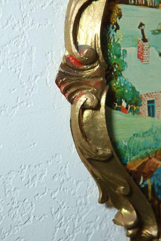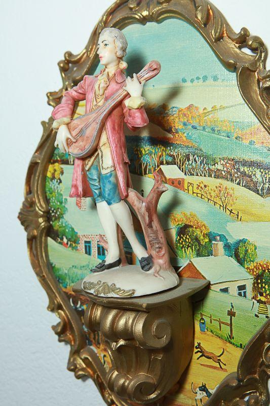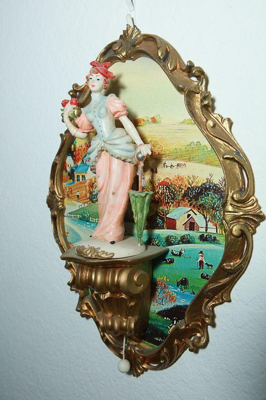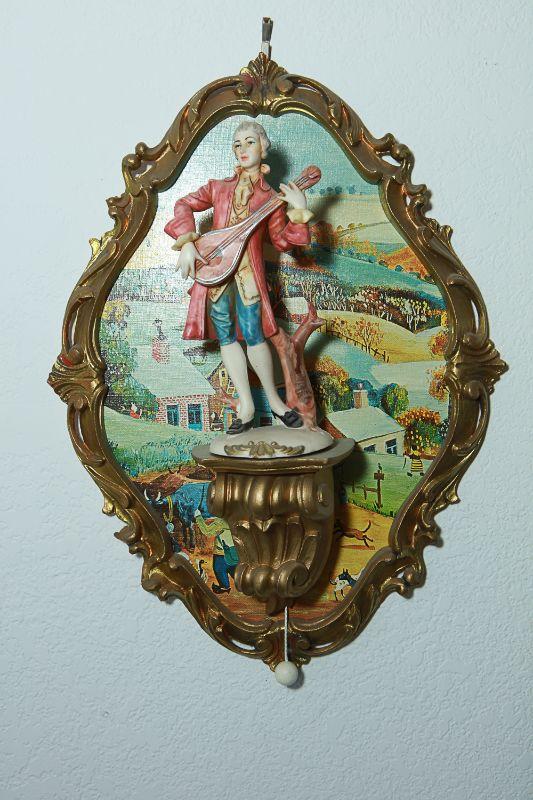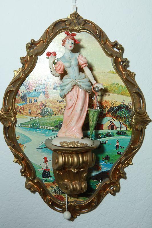Pair of Victorian style figurine wall art. Countryside printed background. Standing on a ledge is a Victorian man and woman. They both have a pull string to play music. Gold painted frames, made in Italy.
