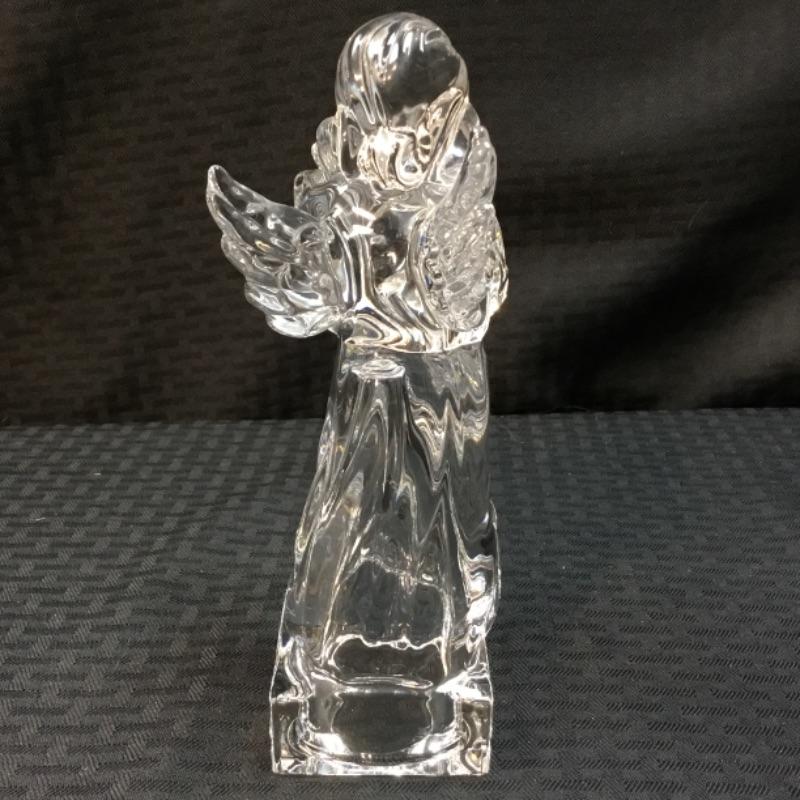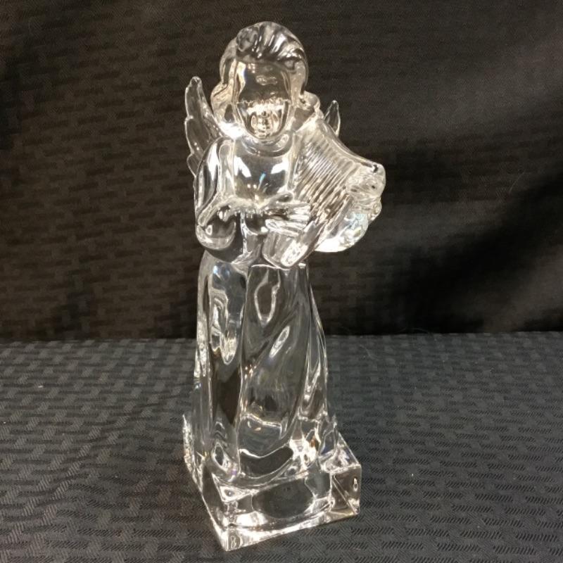 One glass figurine depicting an angel playing a harp standing on top a square pedestal. Stands 8.25“ tall. See pictures.