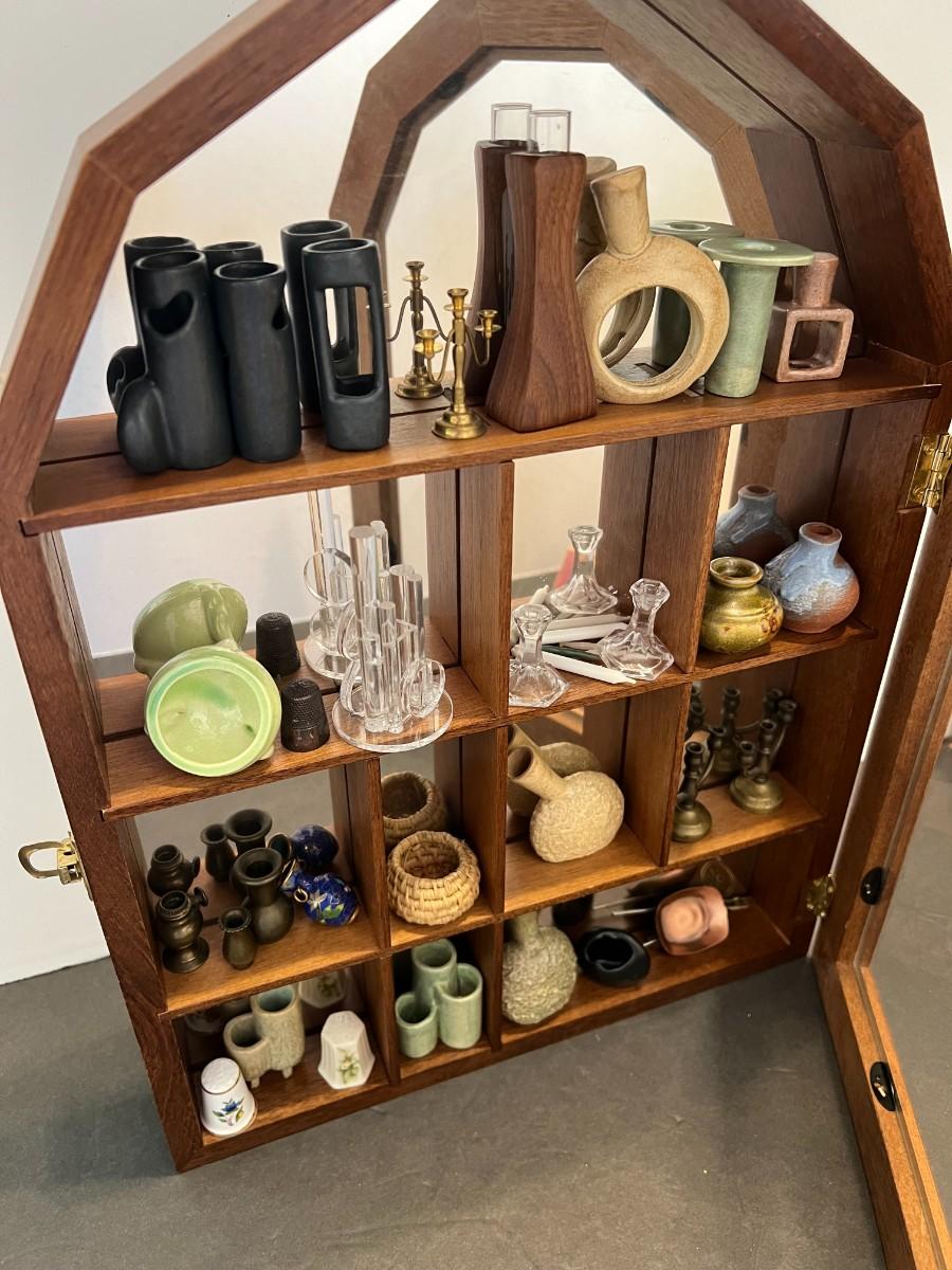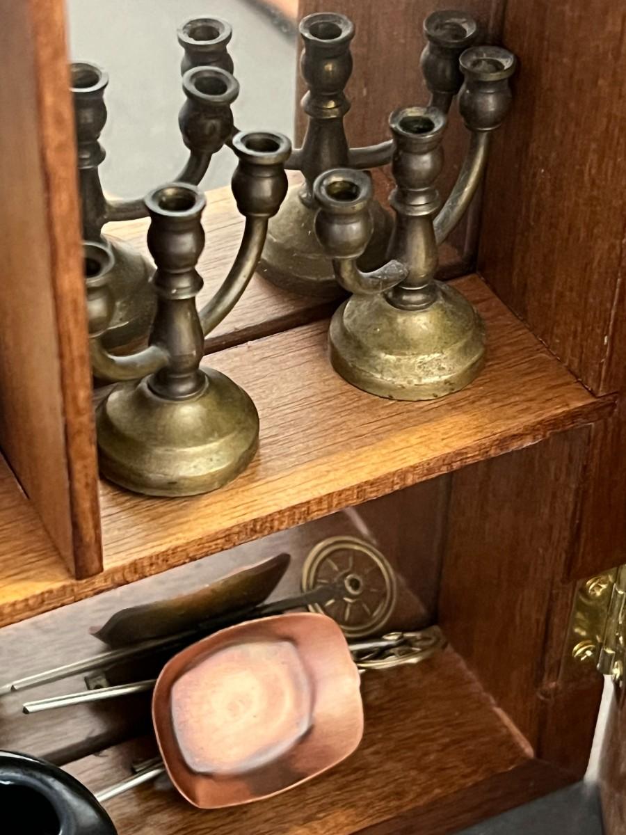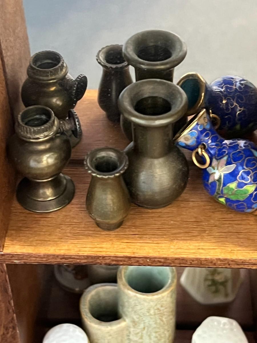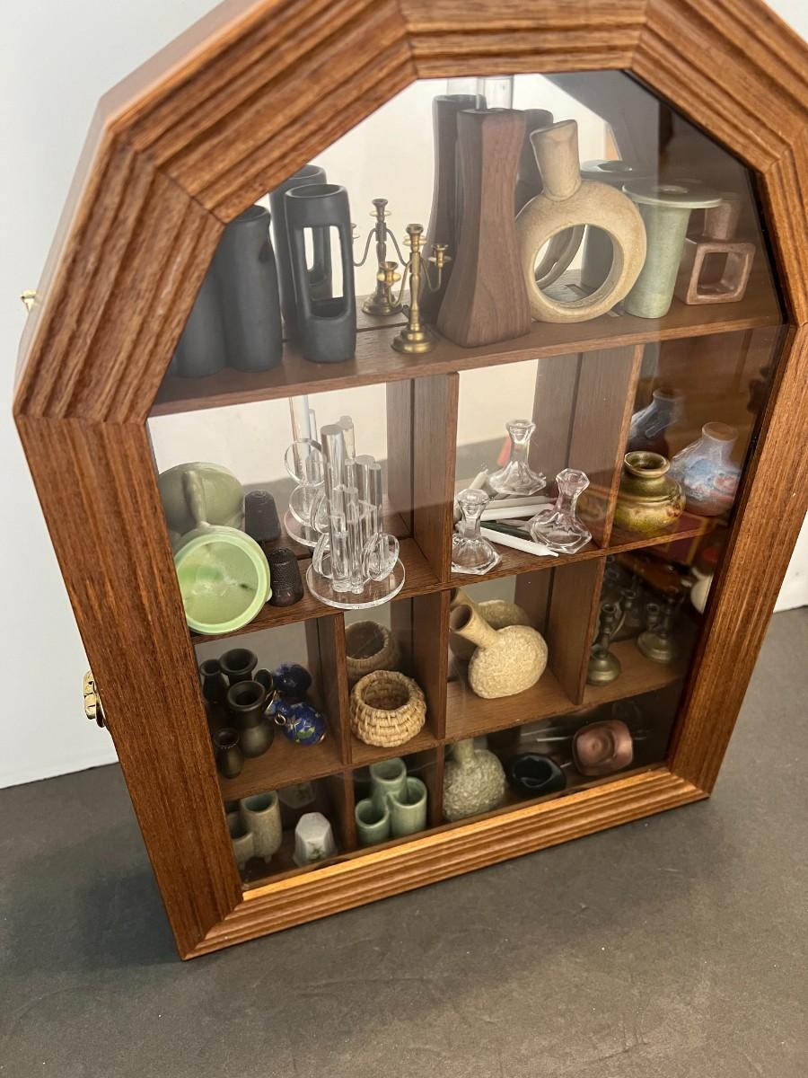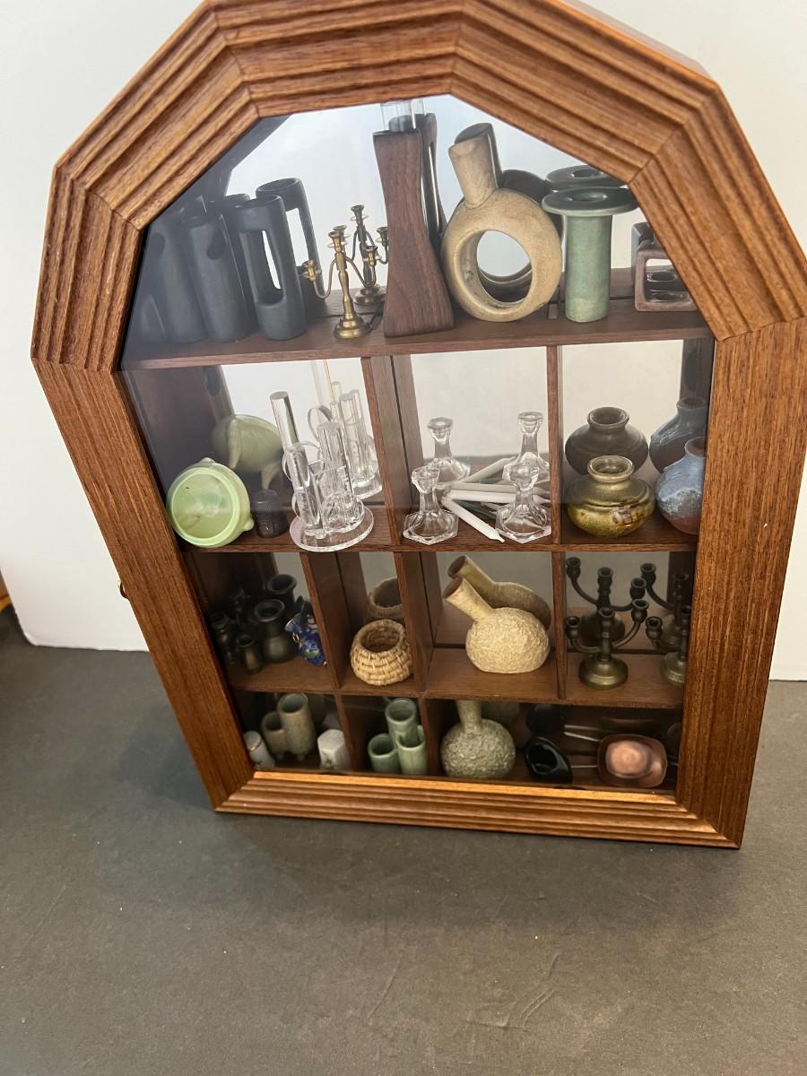 Mirrored wood with glass front curio cabinet with wall hangers. Front is hinged. Filled with miniature (1/2" to 1-1/2") pots, candlestick holders, and other miniature items.