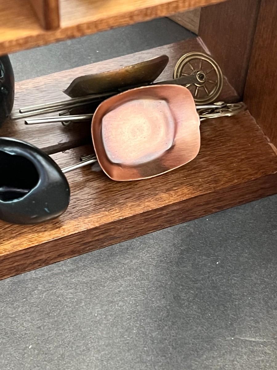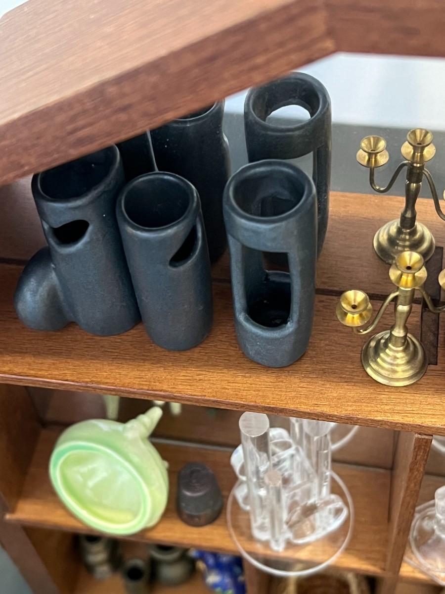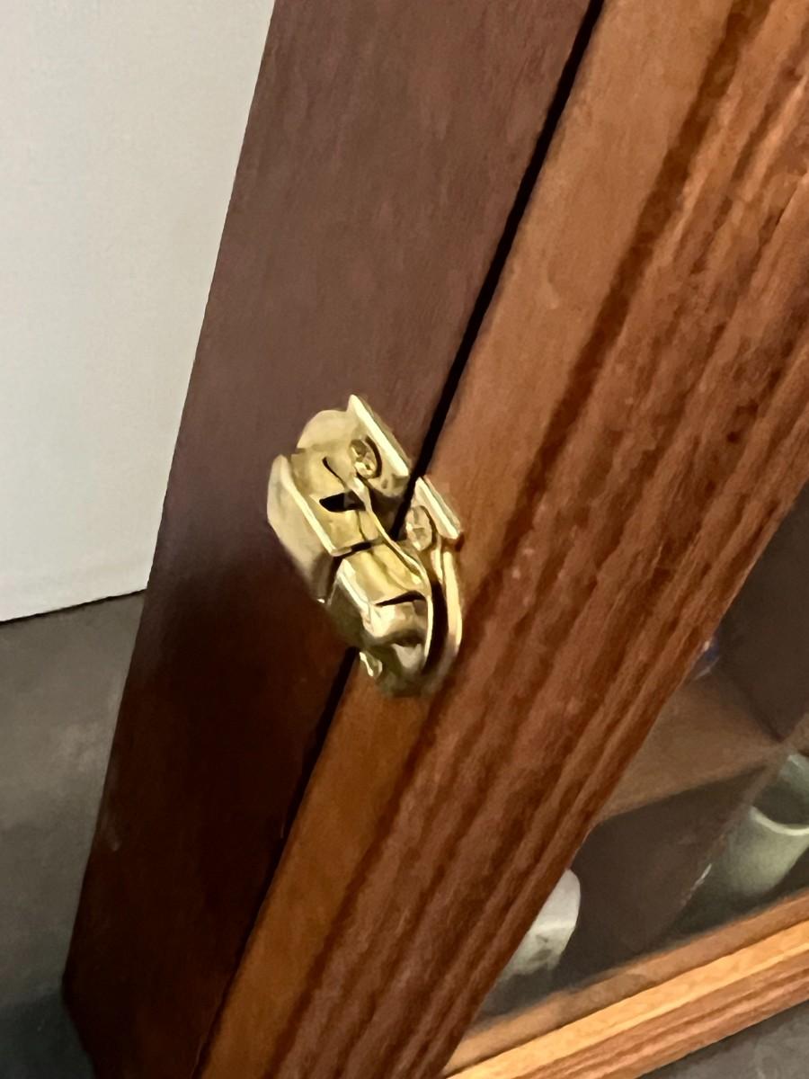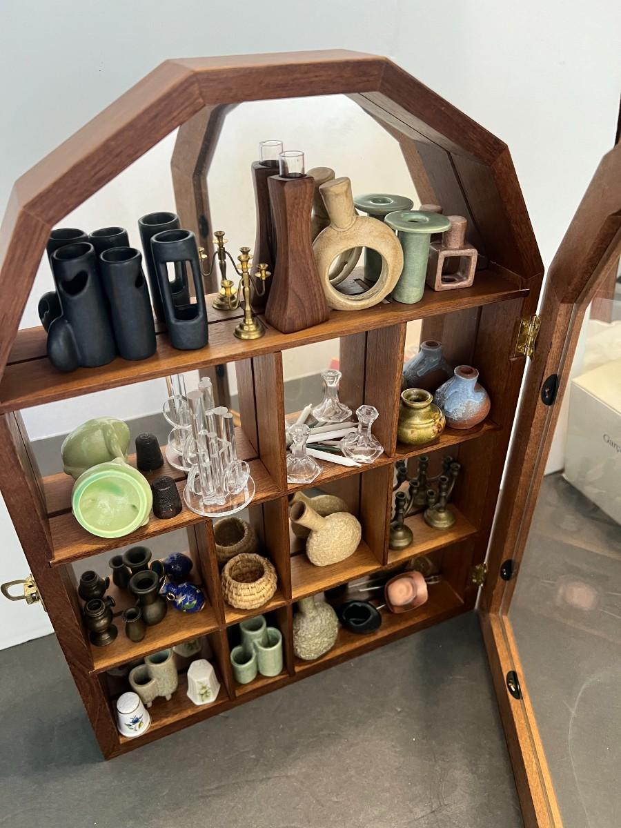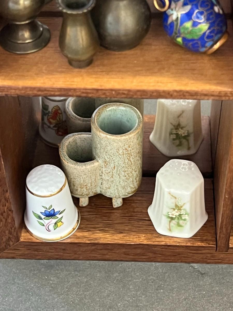 Mirrored wood with glass front curio cabinet with wall hangers. Front is hinged. Filled with miniature (1/2" to 1-1/2") pots, candlestick holders, and other miniature items.