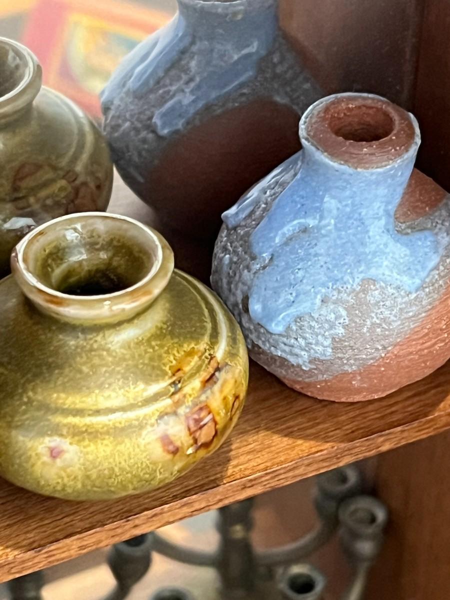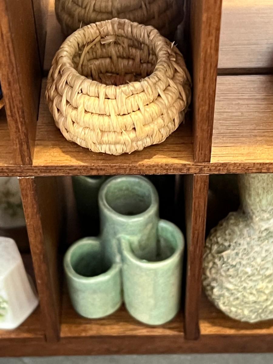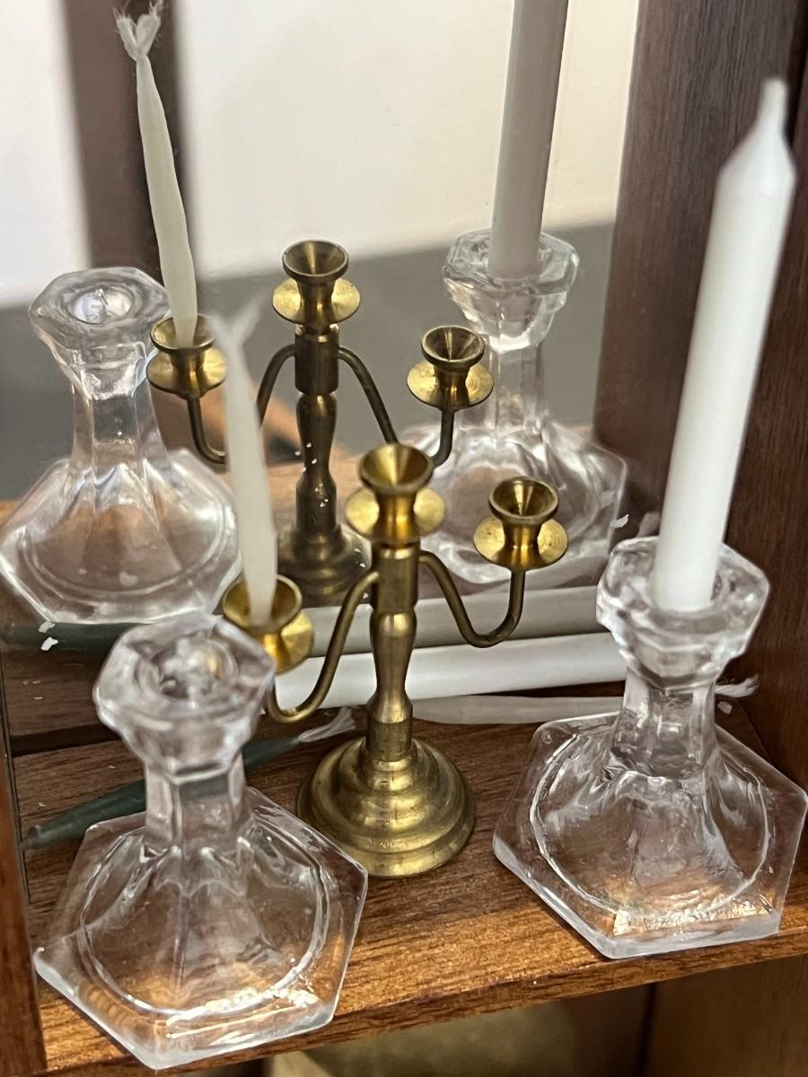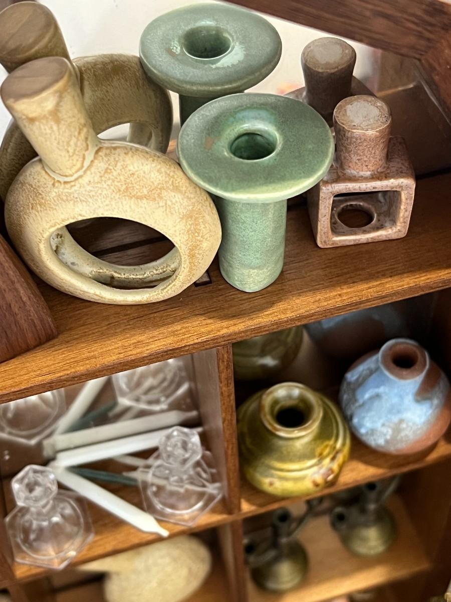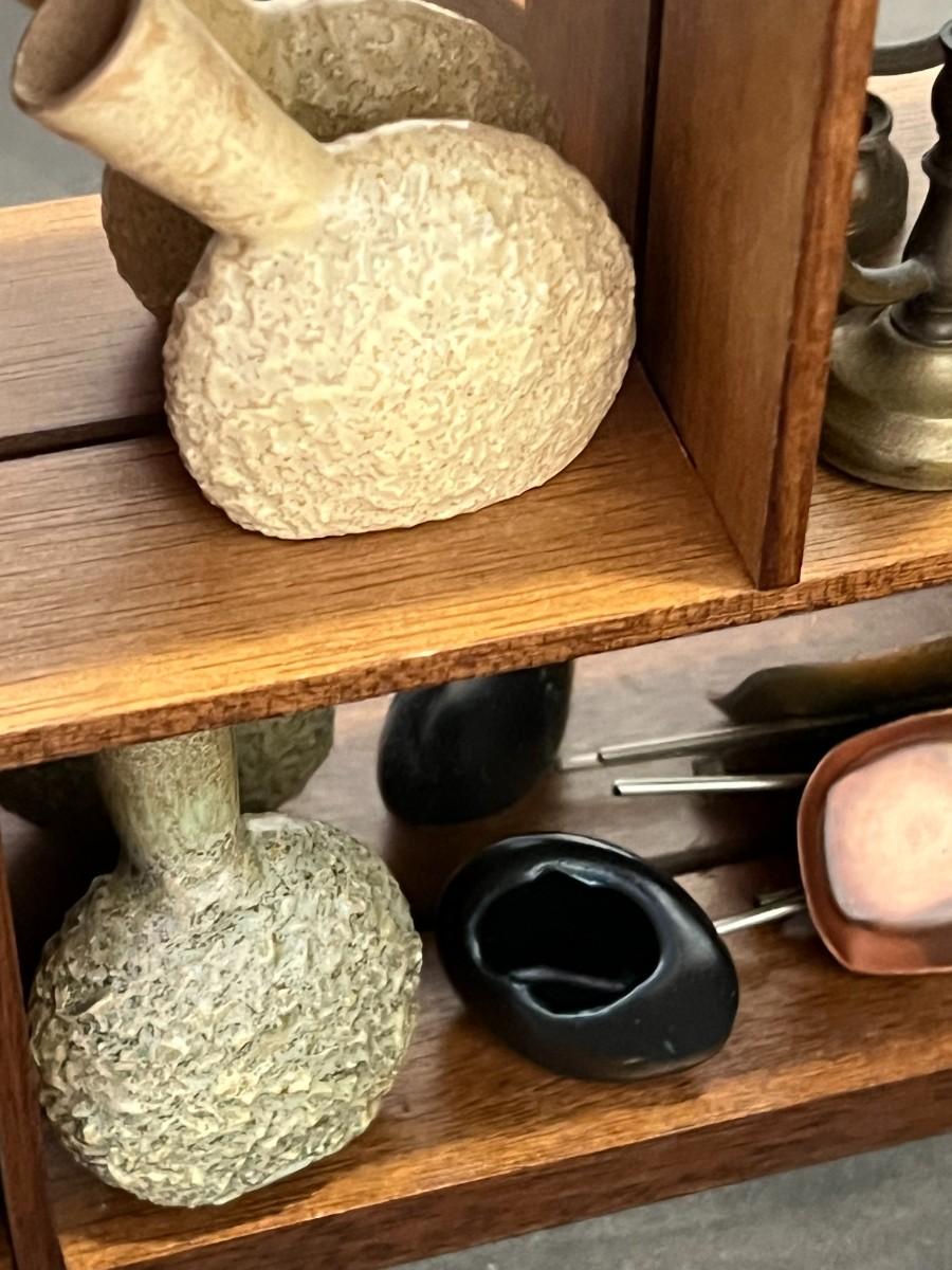Mirrored wood with glass front curio cabinet with wall hangers. Front is hinged. Filled with miniature (1/2" to 1-1/2") pots, candlestick holders, and other miniature items.