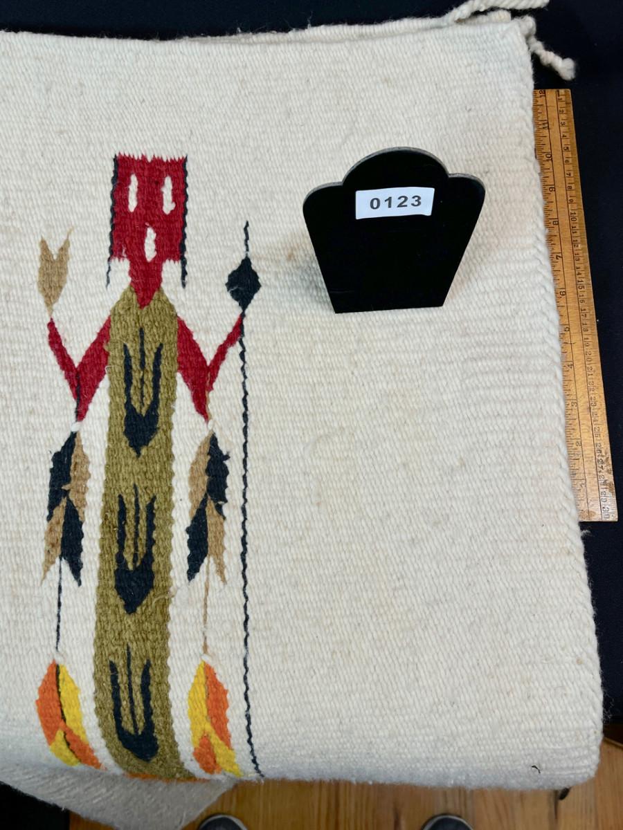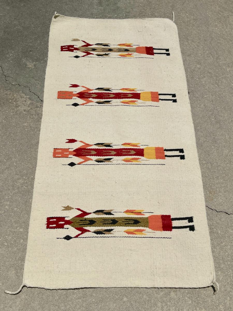 The subject item is a small area, hand woven, wool rug/wall hanging detailed with four brightly colored Yei Dance Figures, posed directly facing the viewer on a natural white surface. The rug exhibits no use / wear, and does not appear to have ever been washed, allowing it to retain its true colors. This rug is the real deal - not reproduced in Mexico.