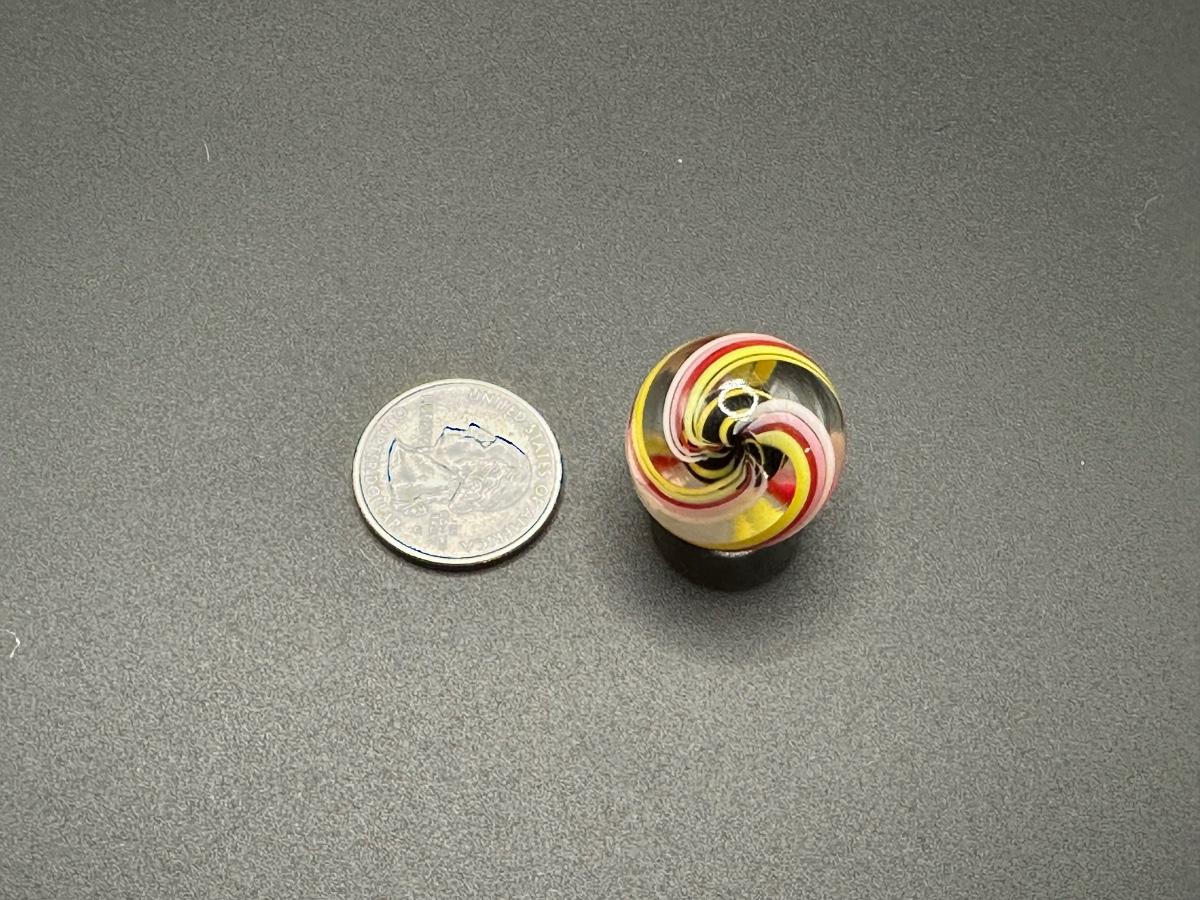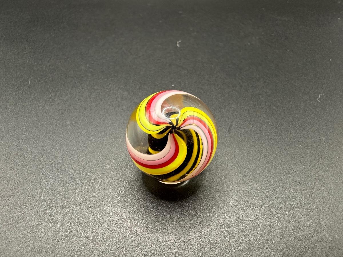 YELLOW AND BLACK STRIPED CORE MARBLE CAGED IN WHITE, PINK, RED AND YELLOW SWIRLS
