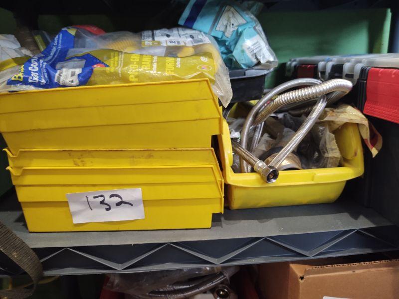 AS shown - Yellow bins of assorted plumbing parts, pro-grade range gas connector, brass clamps, flush valve washers, tank balls, asstd hoses, fittings etc.