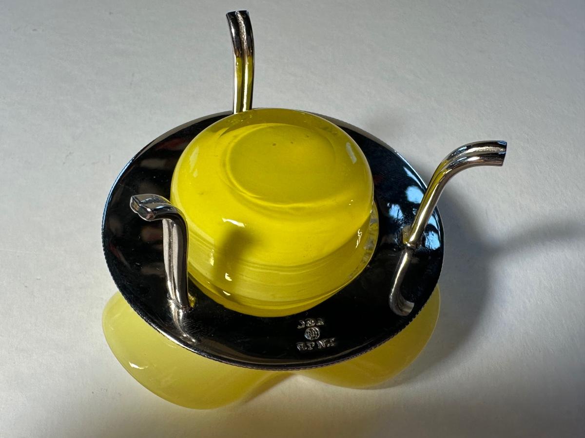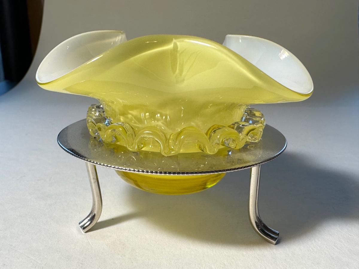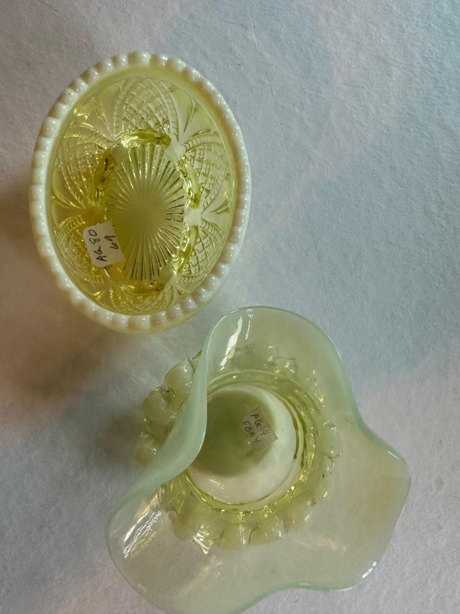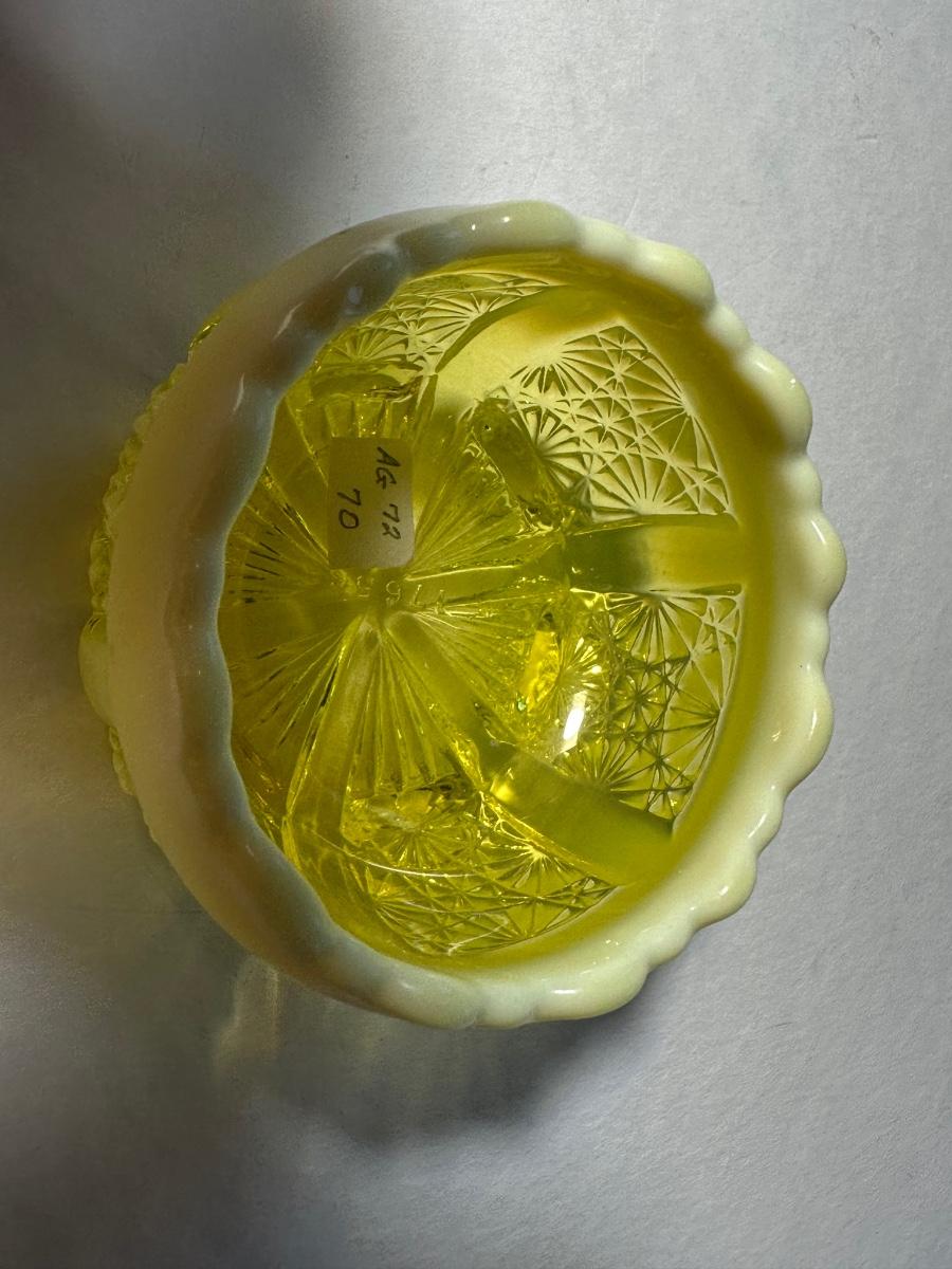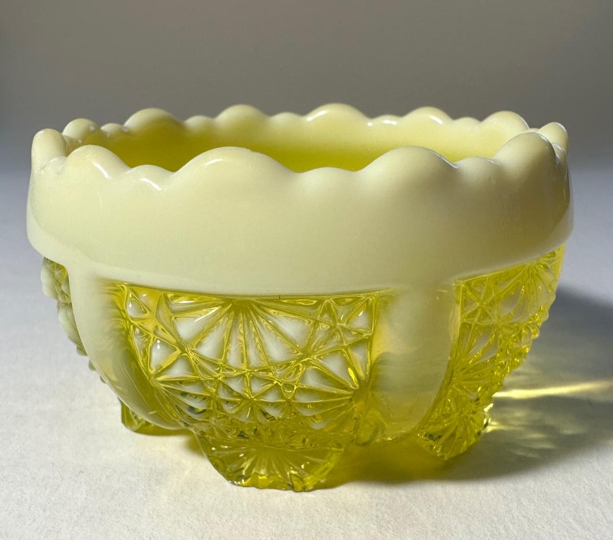 Yellow cased with white inside 3 big ruffles and filigree. Yellow Opalescent Chippendale English 1885 salts