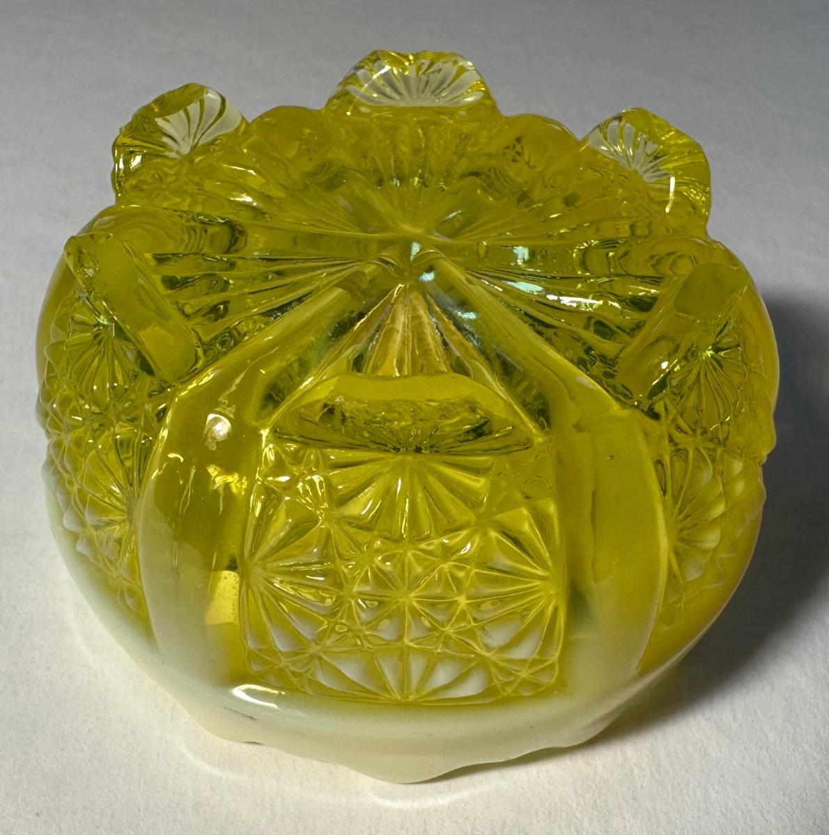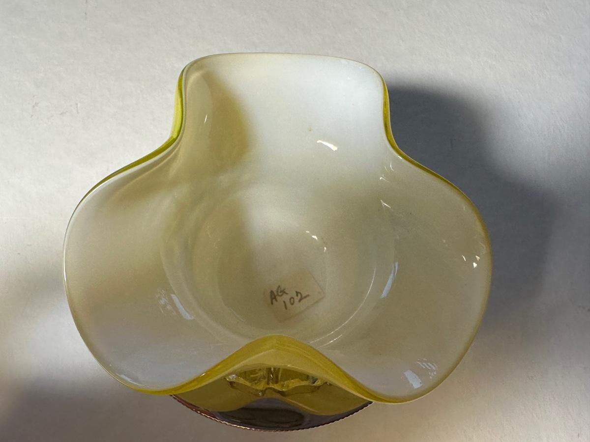 Yellow cased with white inside 3 big ruffles and filigree. Yellow Opalescent Chippendale English 1885