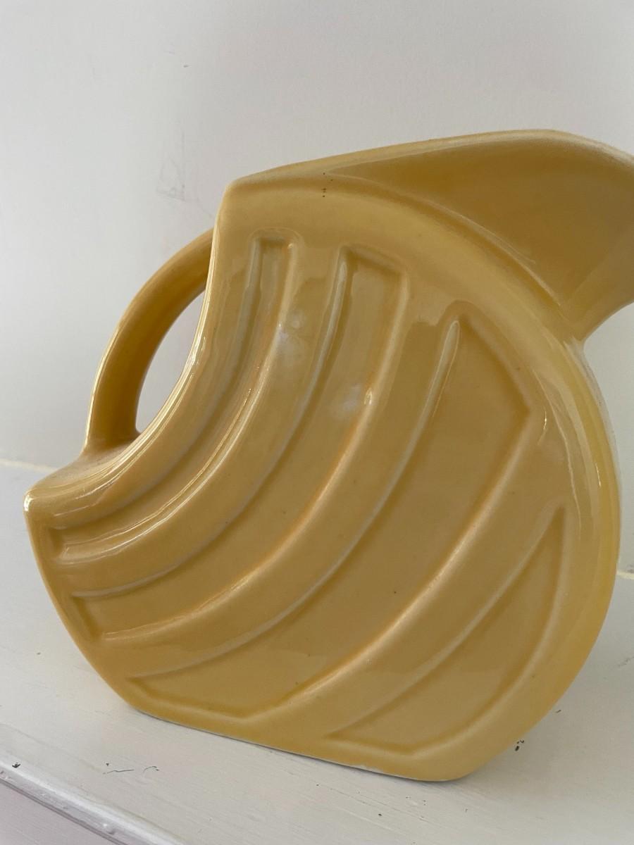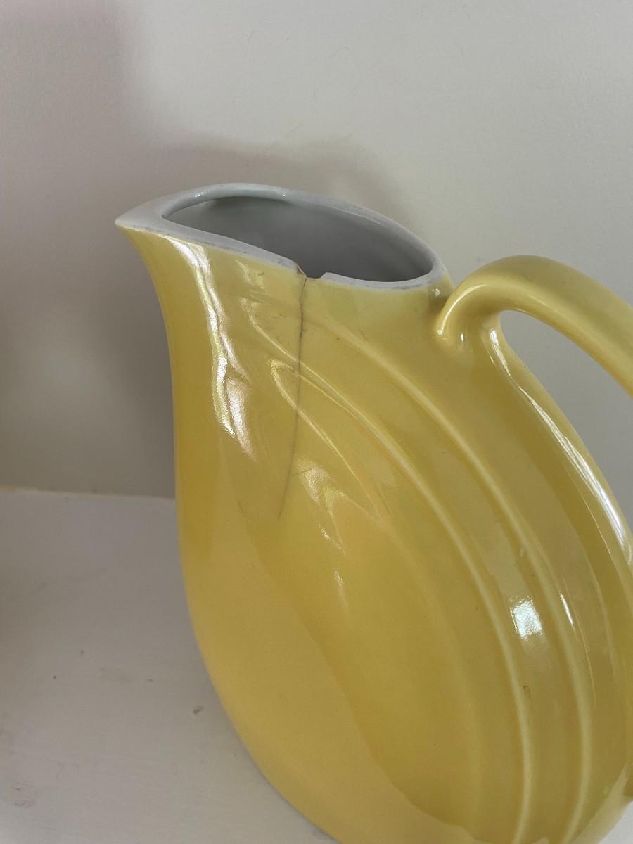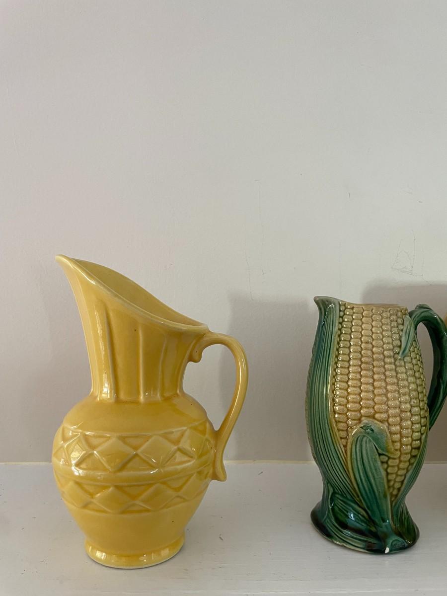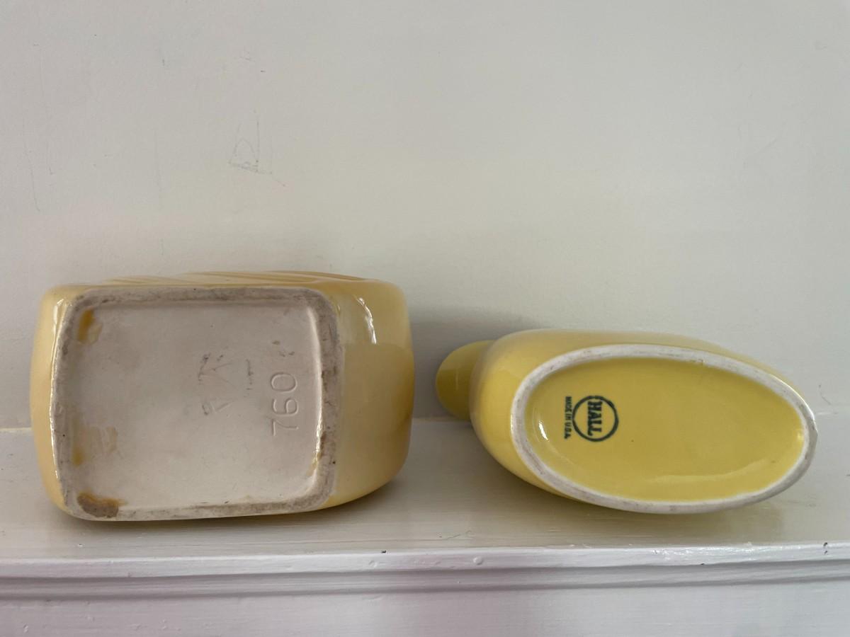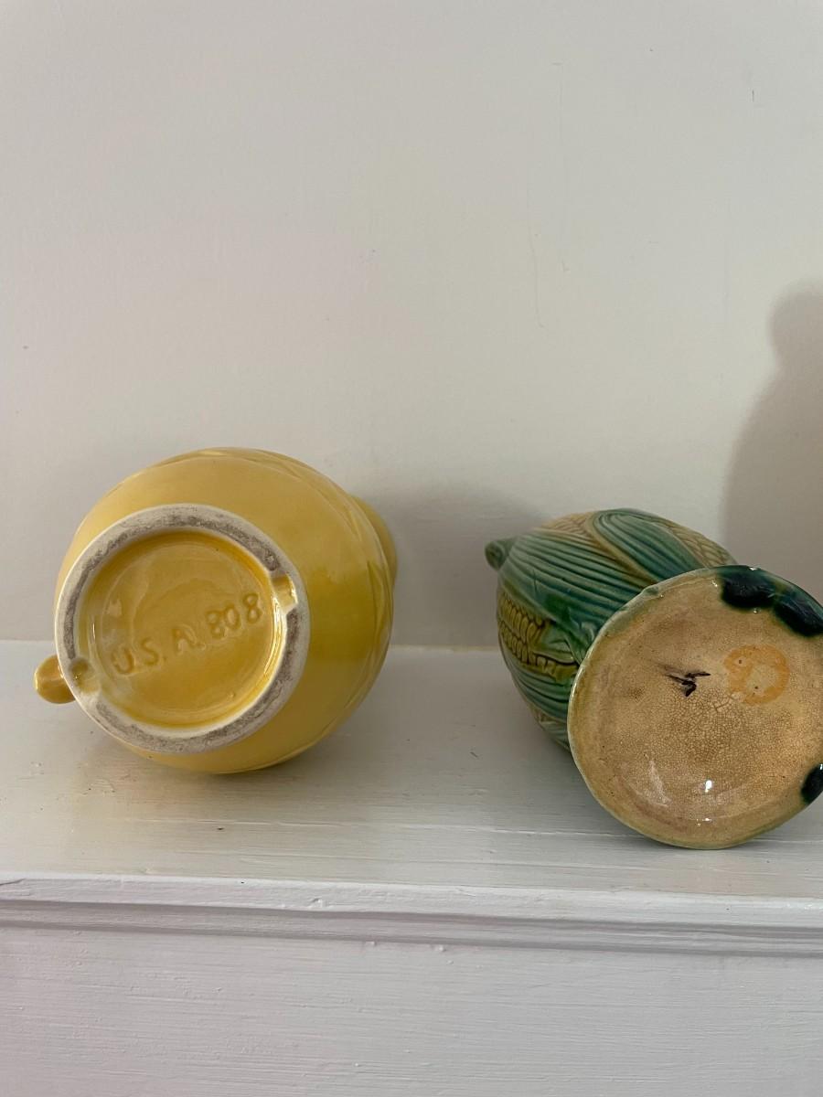 1 corn motif pitcher, 1 yellow pitcher marked USA 808, 1 Yellow Hall pitcher w/crack, 1 yellow pitcher w/blemishes marked 760