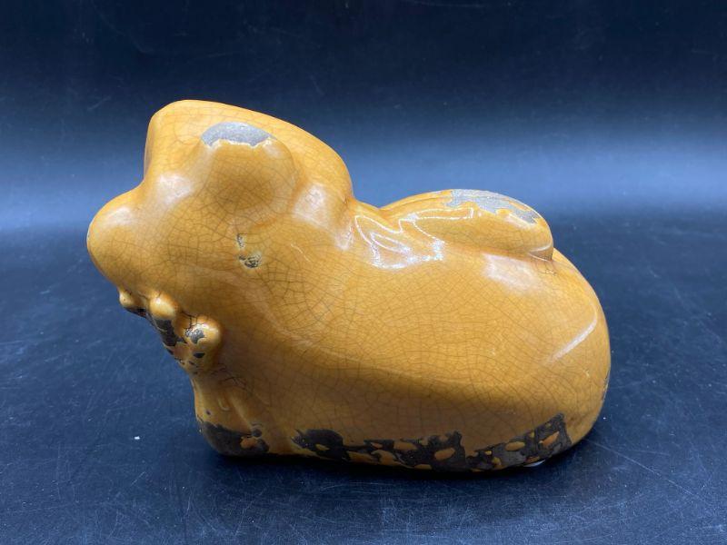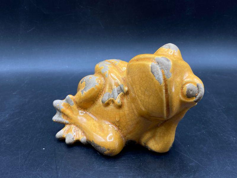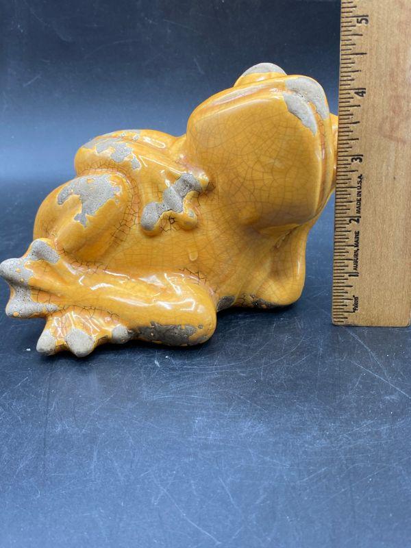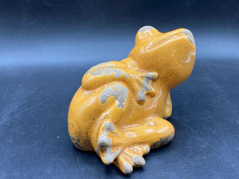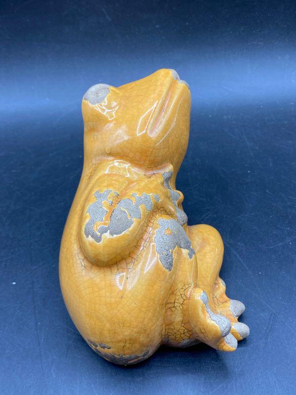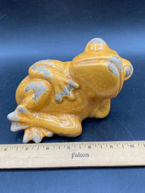 Yellow glazed finish pottery frog. Glaze has a worn crazed crackle look to the finish. In good condition. Would be great inside on a shelf or out in a garden. About 6.5" length.