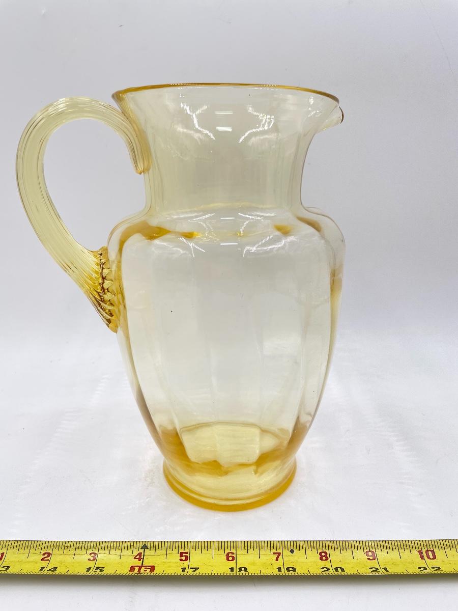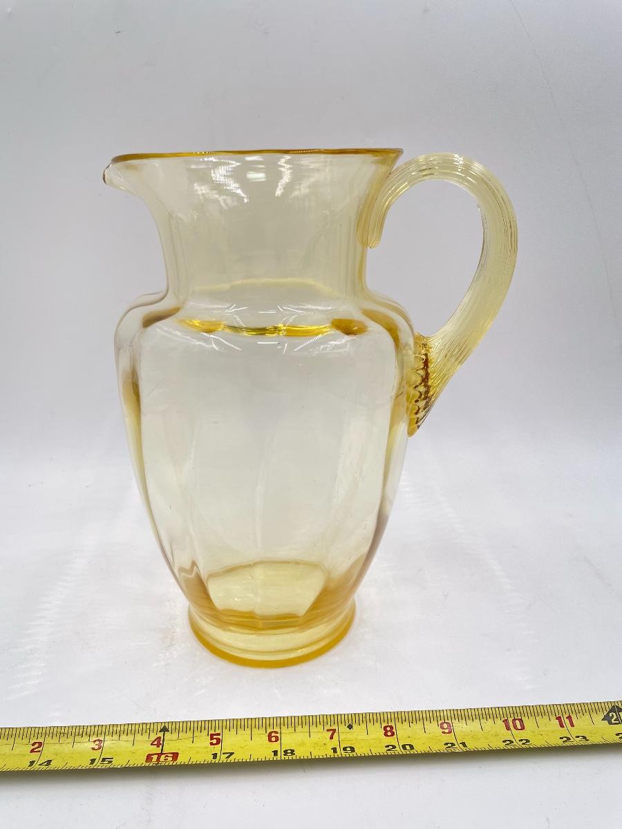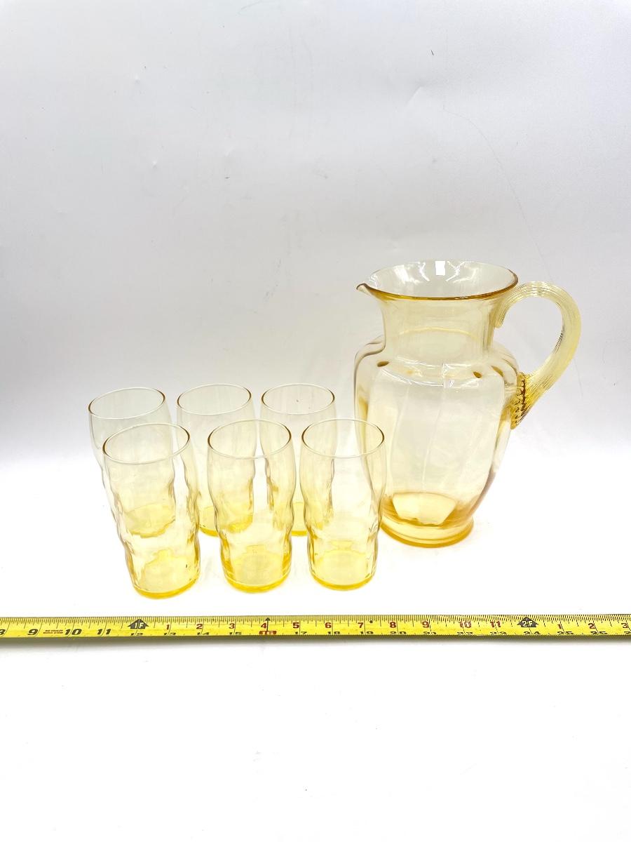 YELLOW DEPRESSION GLASS PITCHER AND 6 CUPS