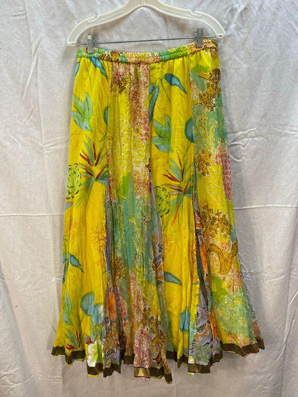 Yellow flowy maxi skirt by Soft Surroundings. Multi pattern floral panels create a colorful design. Elastic waist. Size Large. Good condition.