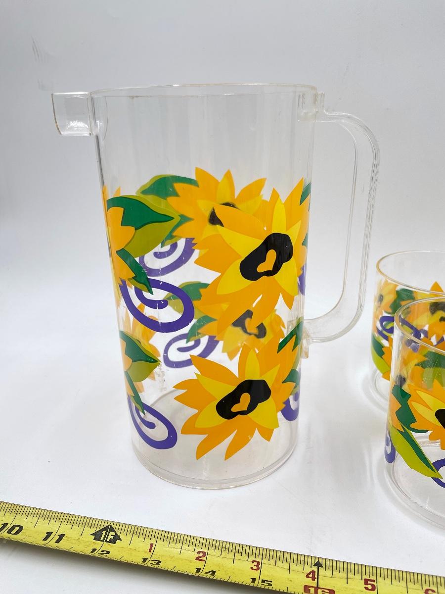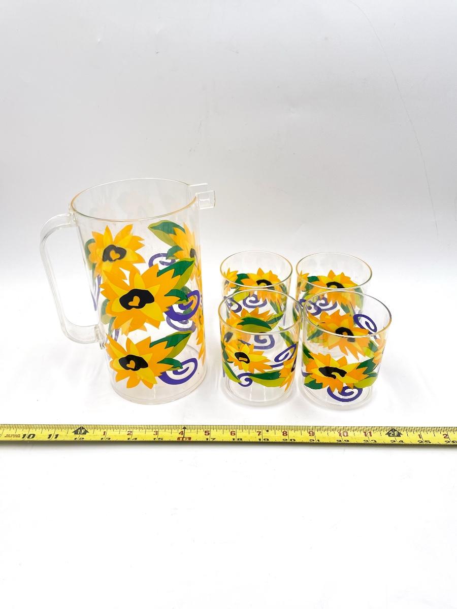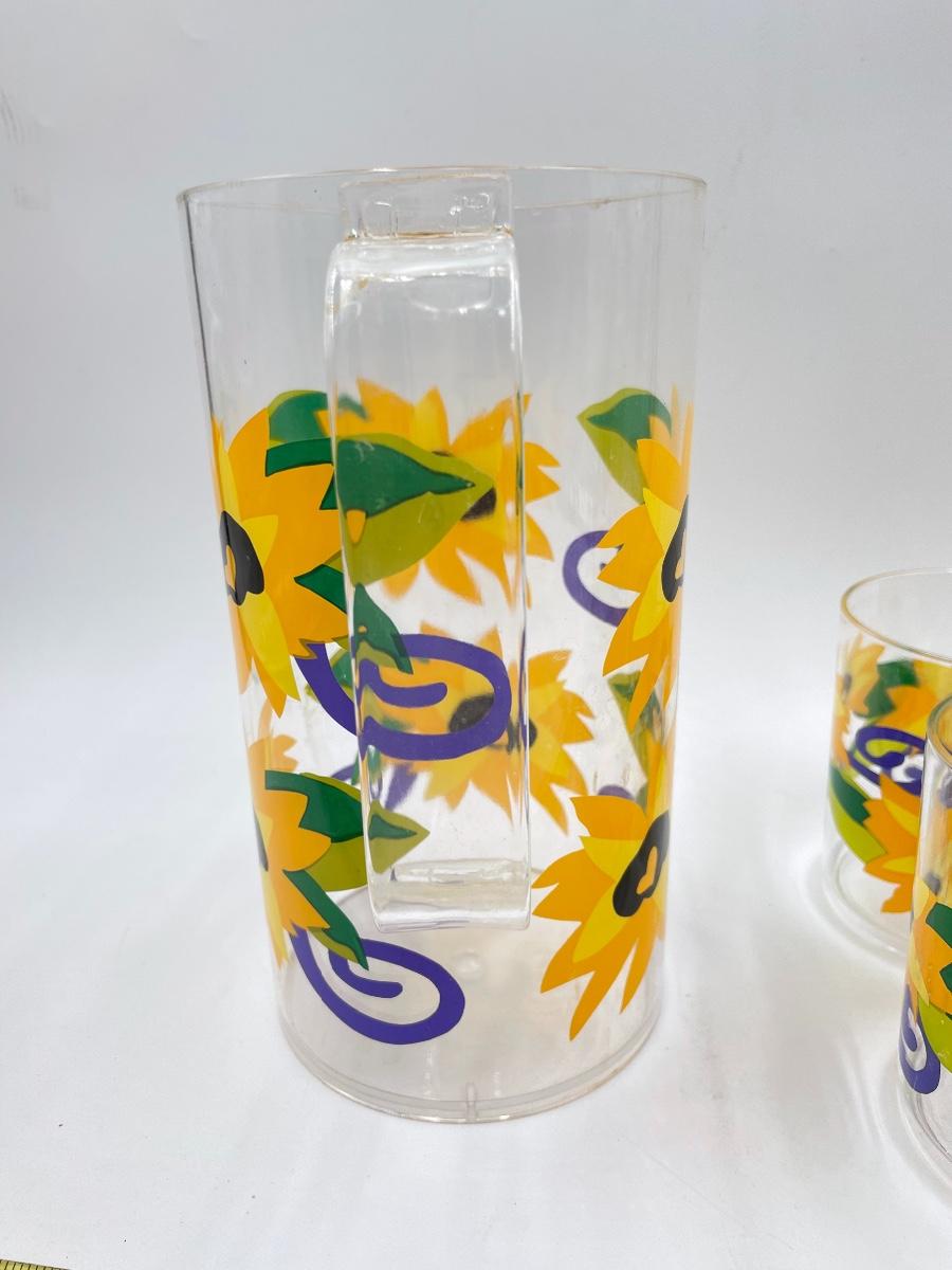 YELLOW FLOWER PLASTIC PITCHER AND 4 CUPS