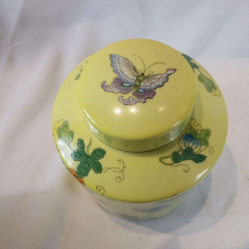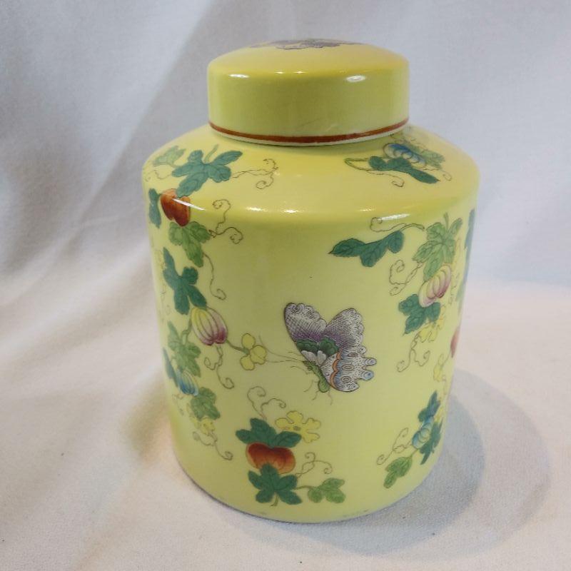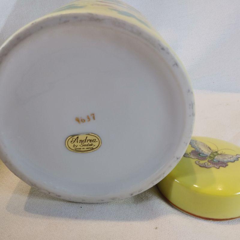 Yellow ginger jar by "Andrea by Sadek". Measures 4 1/2-inches in diameter x 6 -inches tall. Very good condition and would be great to hold q-tips or cotton balls in your boudoir.