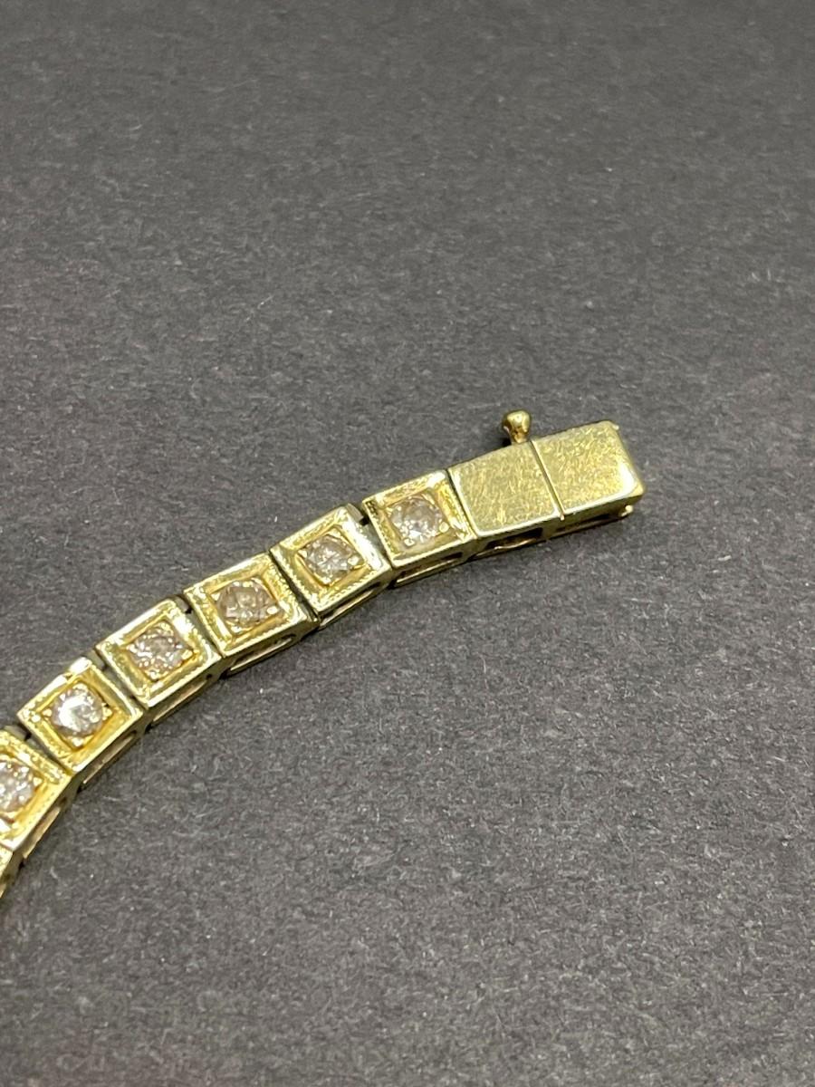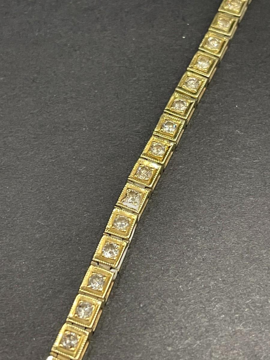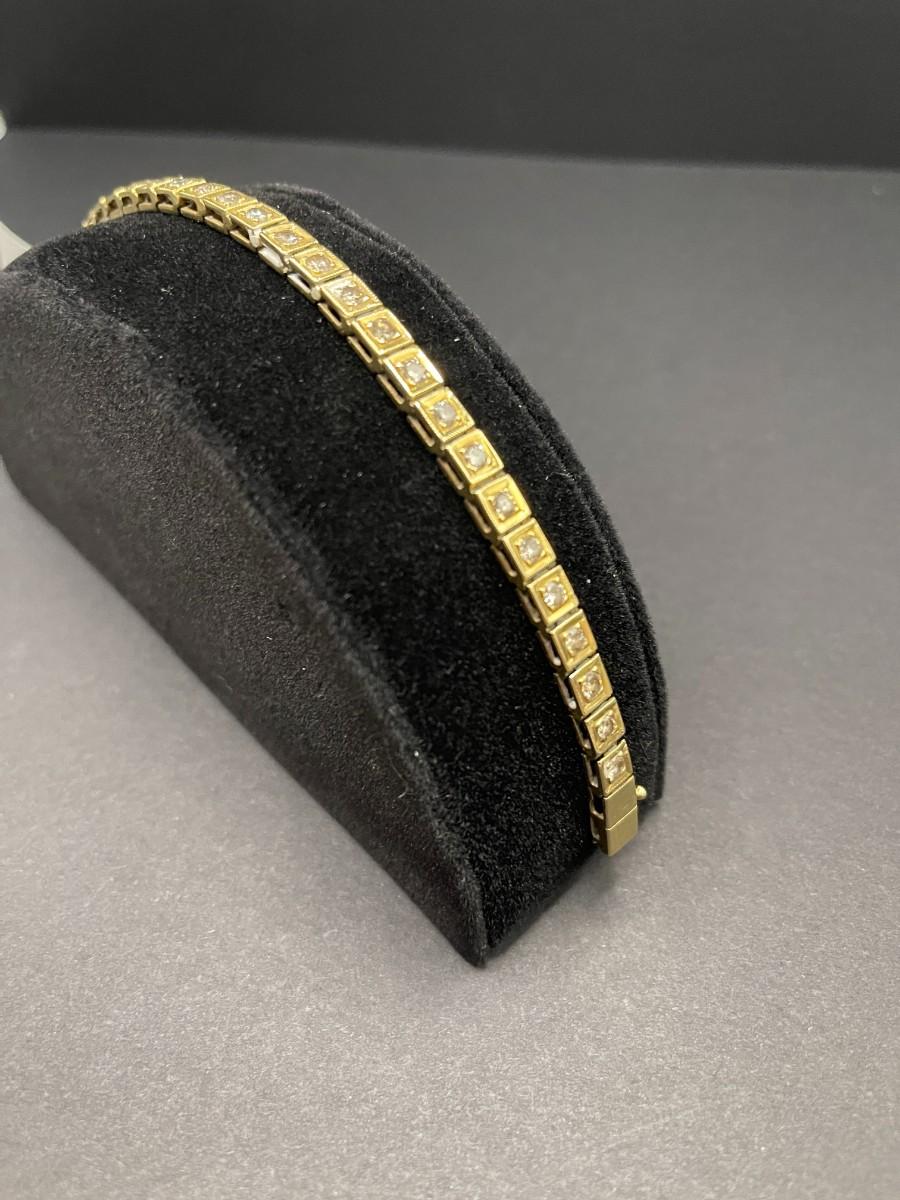 14K yellow gold tennis bracelet with round diamonds set in square settings. 2.32 cttw O-P I. 7 1/4" long. Shows some wear.