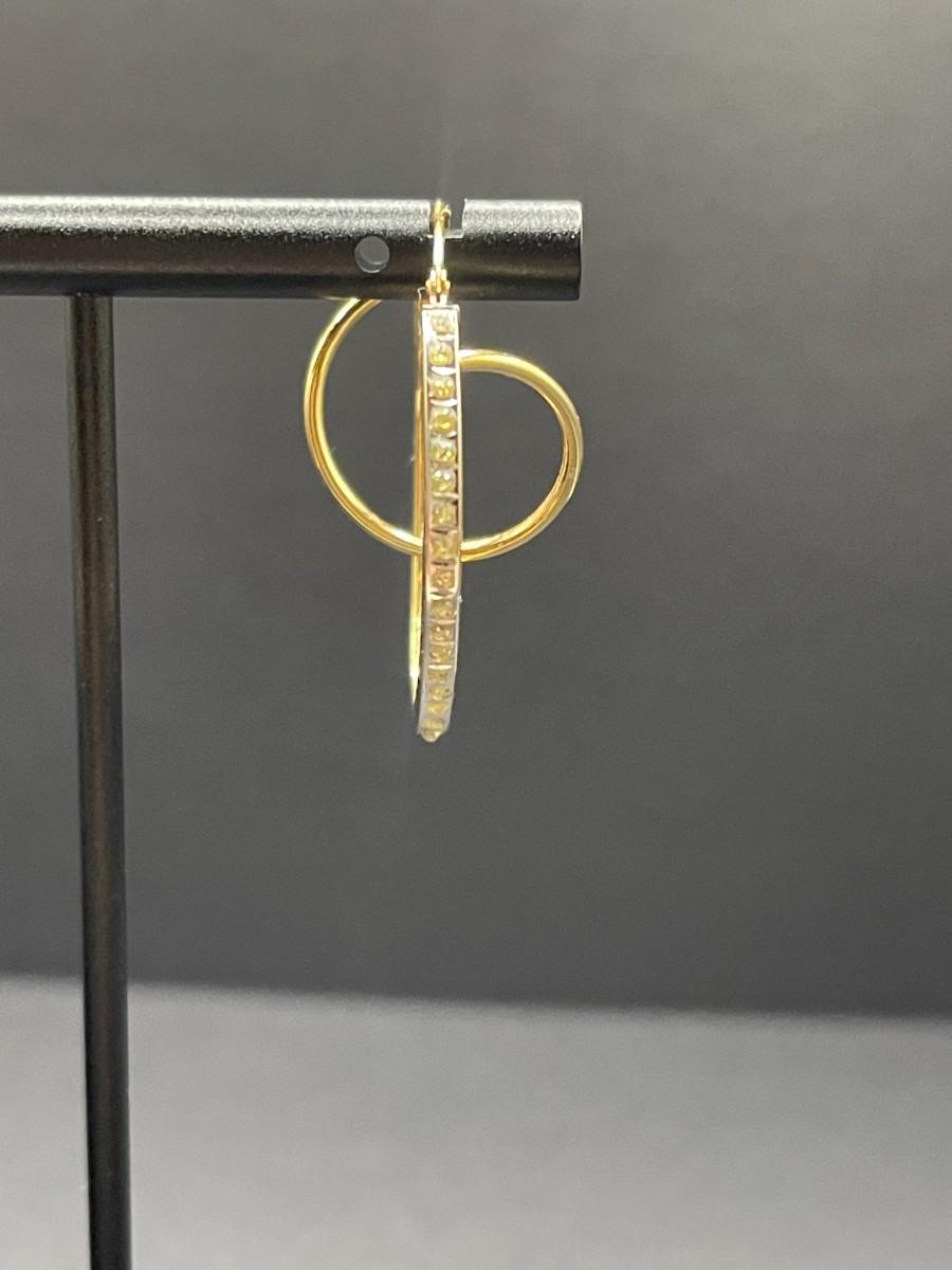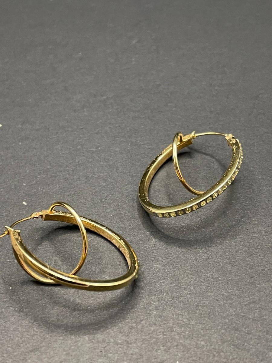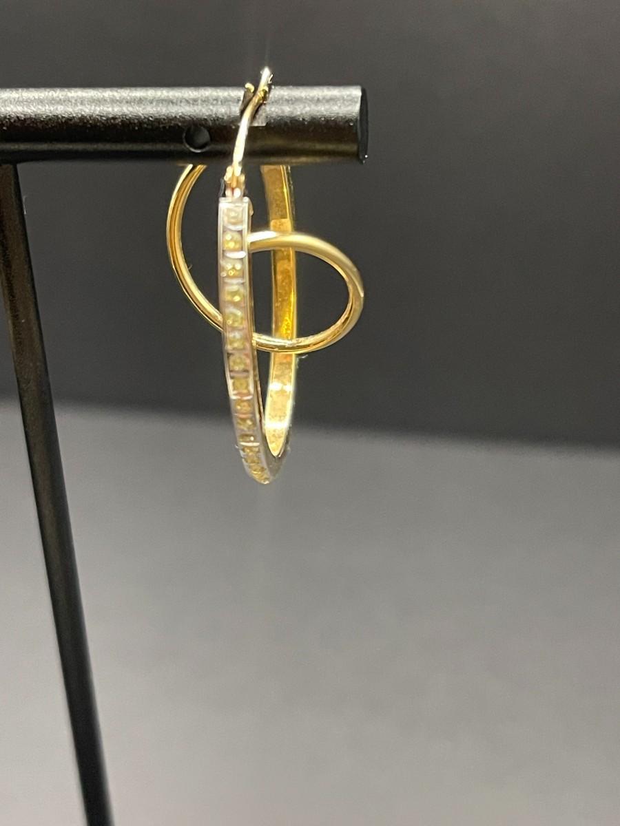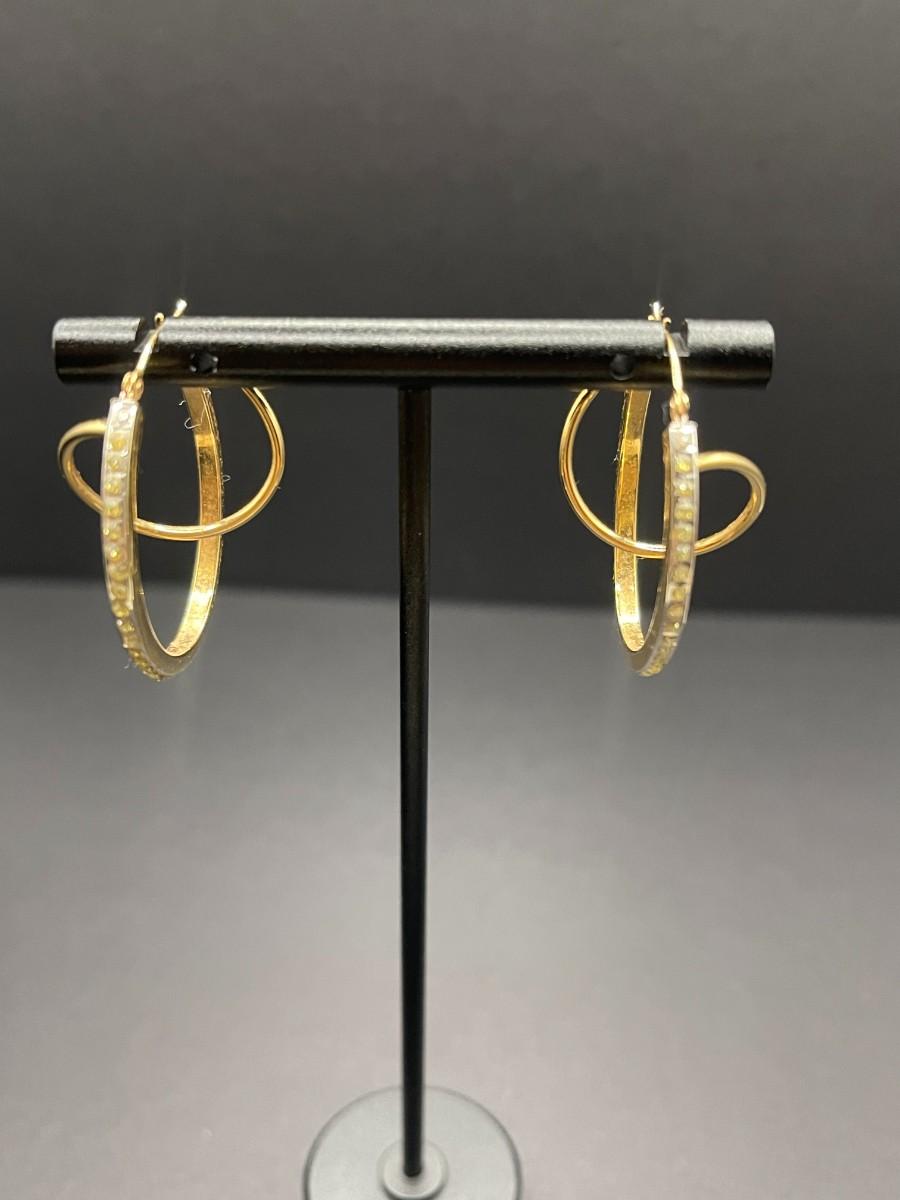 yellow gold hoop earrings with fake diamonds. Marked 14K. 2.17 grams.