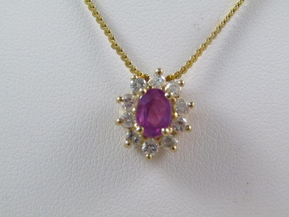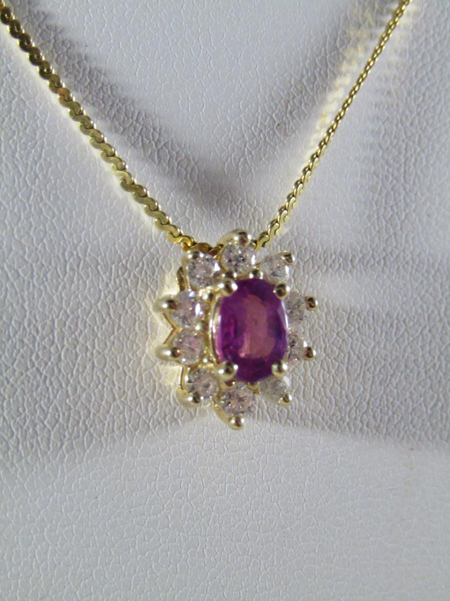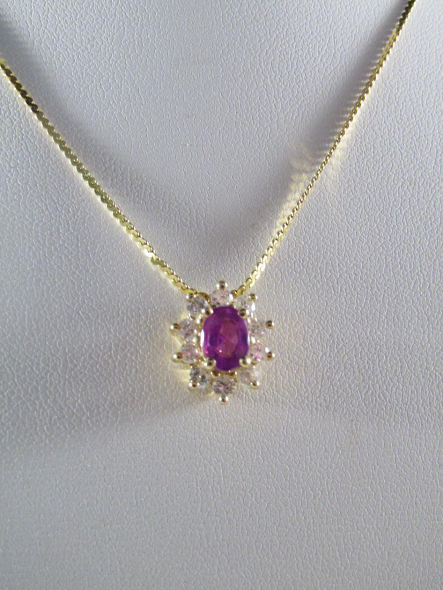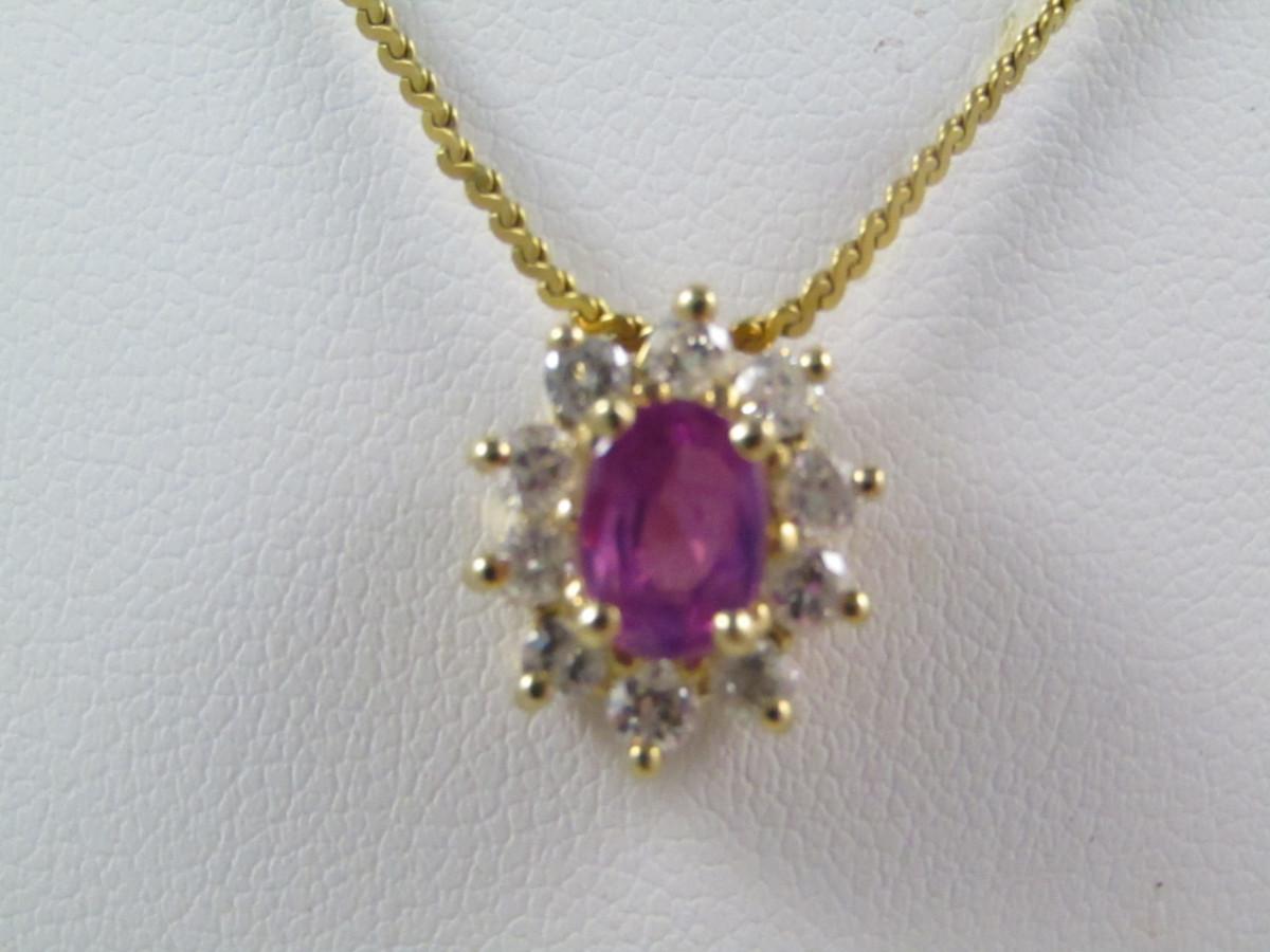 Yellow Gold Necklace with Pink Sapphire and Diamond Pendant- Approx Weight 2.6 dwt (#22). Necklace is 18Kt and measures approx 16 inches. Pendant is 14Kt. Please see attached assessment for carat weight of stones.