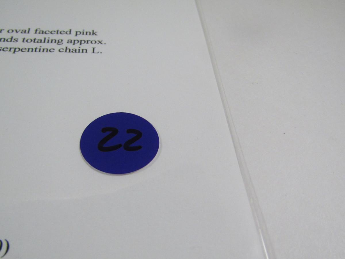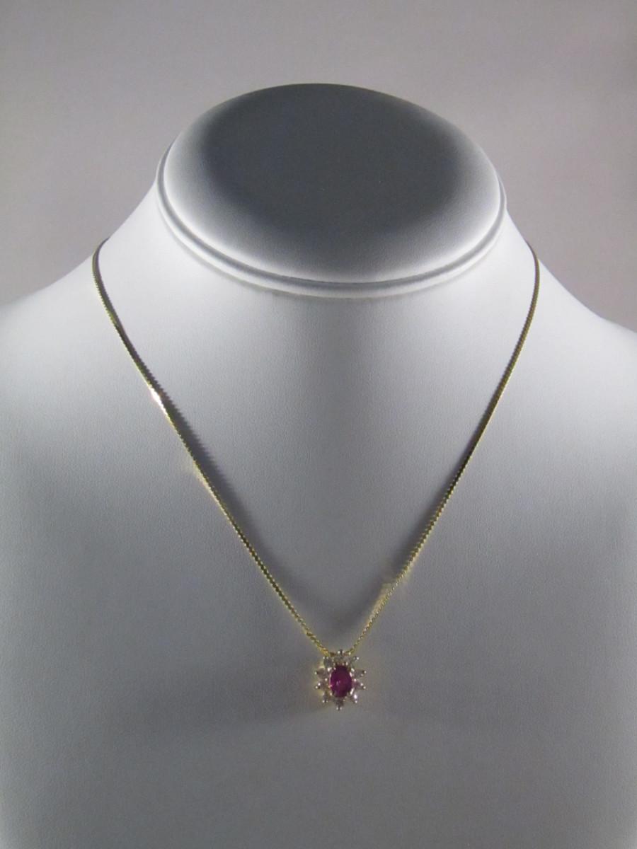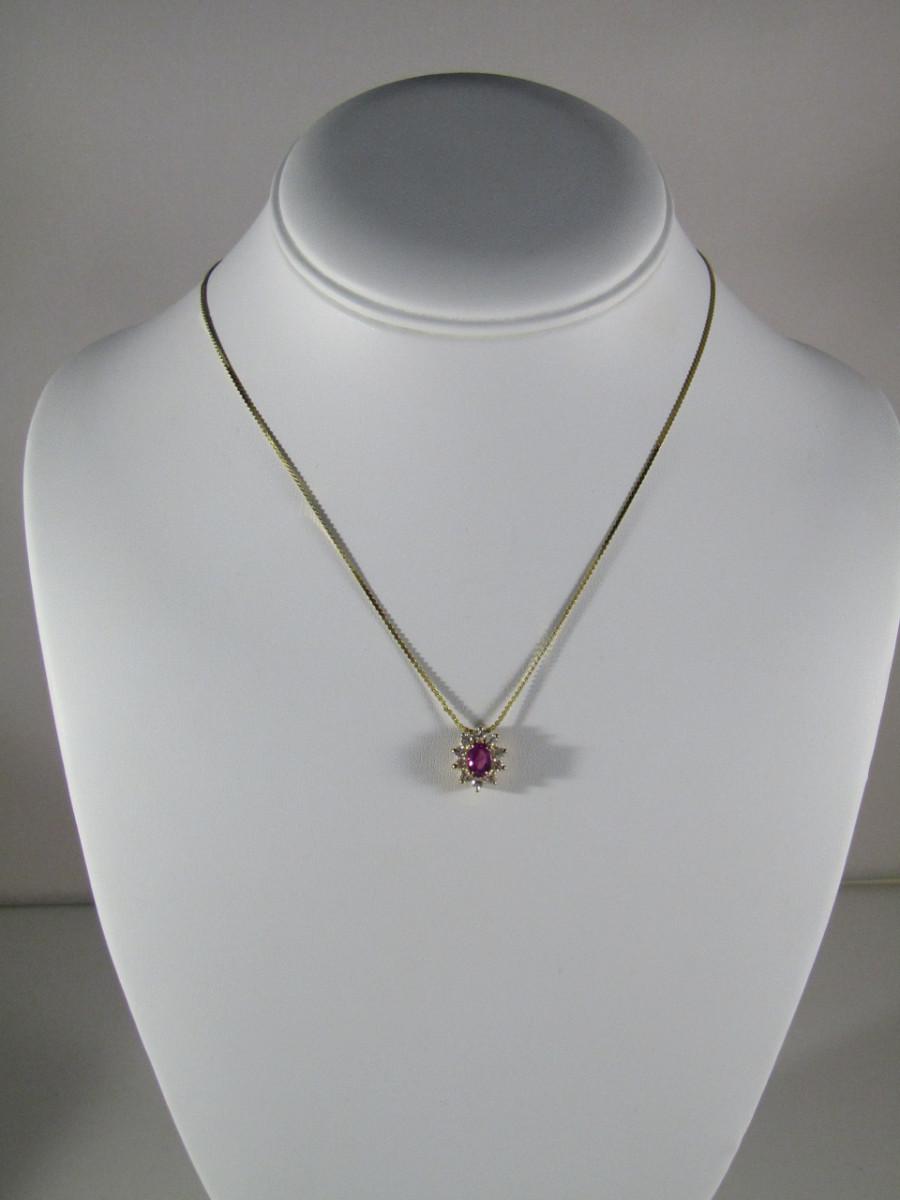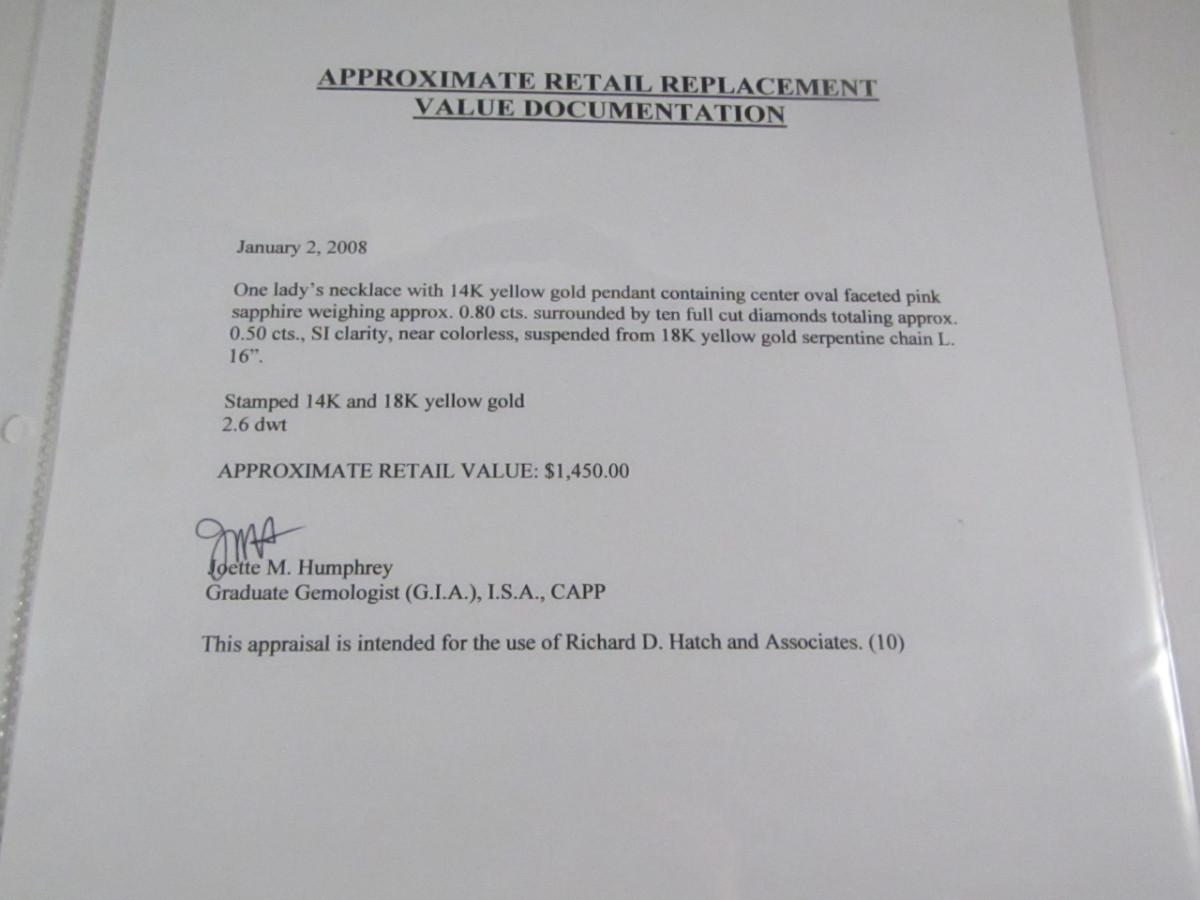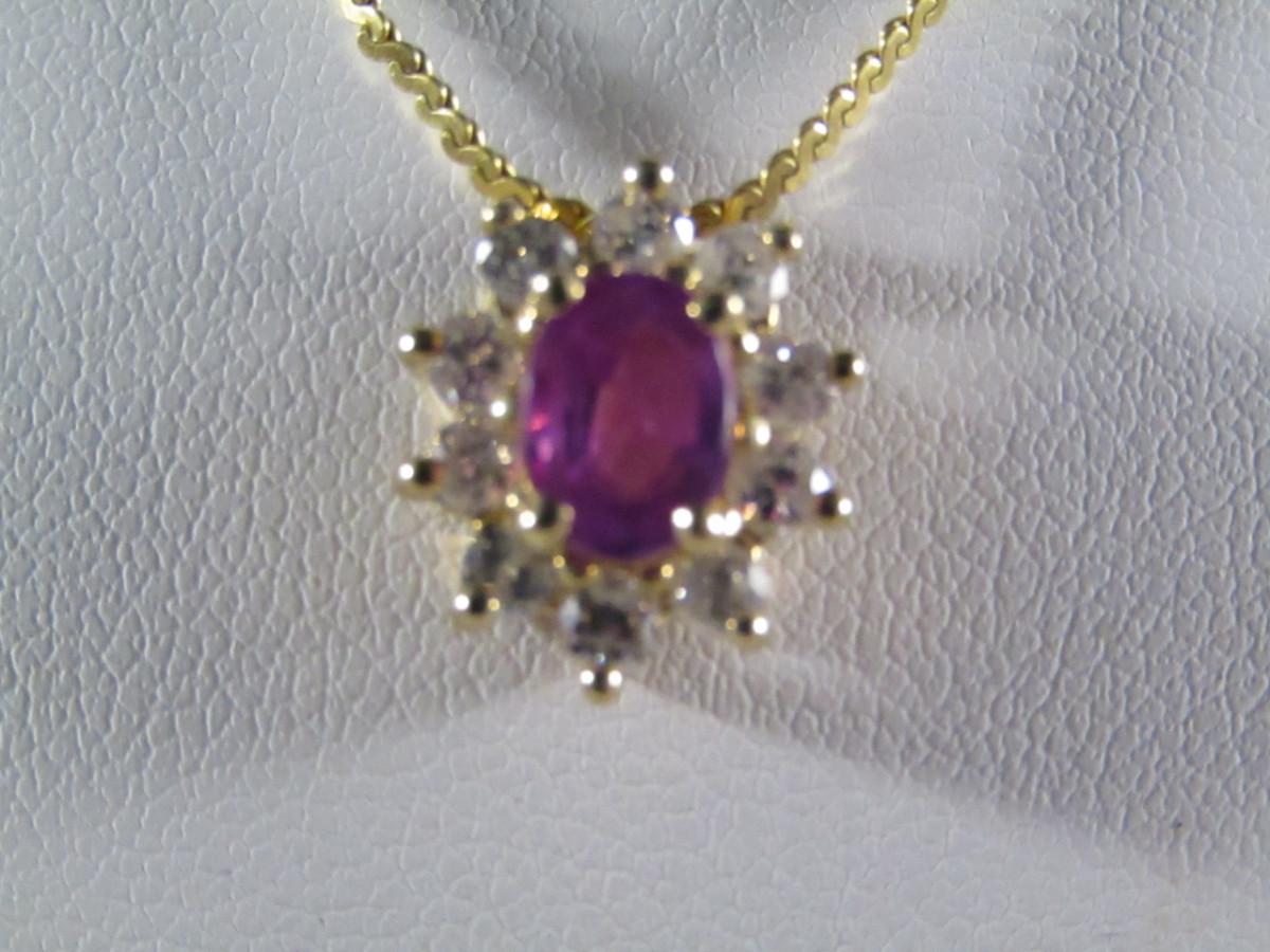 Yellow Gold Necklace with Pink Sapphire and Diamond Pendant- Approx Weight 2.6 dwt (#22). Necklace is 18Kt and measures approx 16 inches. Pendant is 14Kt. Please see attached assessment for carat weight of stones.