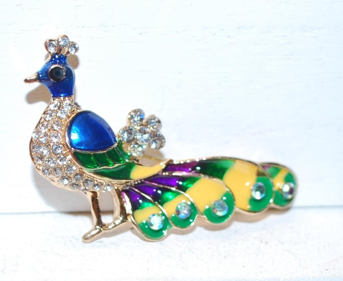 Yellow, Green & Blue Peacock BROOCH (2" x 1¼") on a Gold Tone Setting