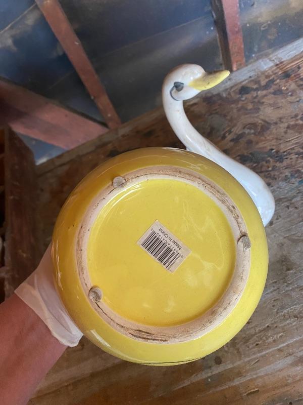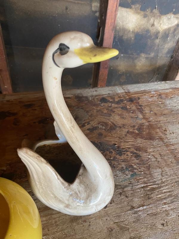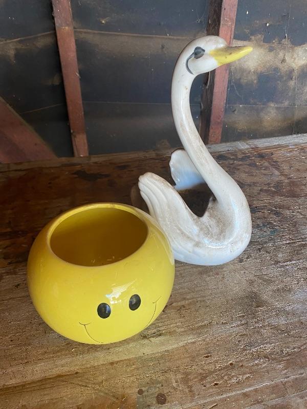 Bright yellow happy face planter and a long neck swan planter. Both are ceramic. A little dusty/ webby from garage. Did not notice any chips, The swan does have crazing in the glaze.