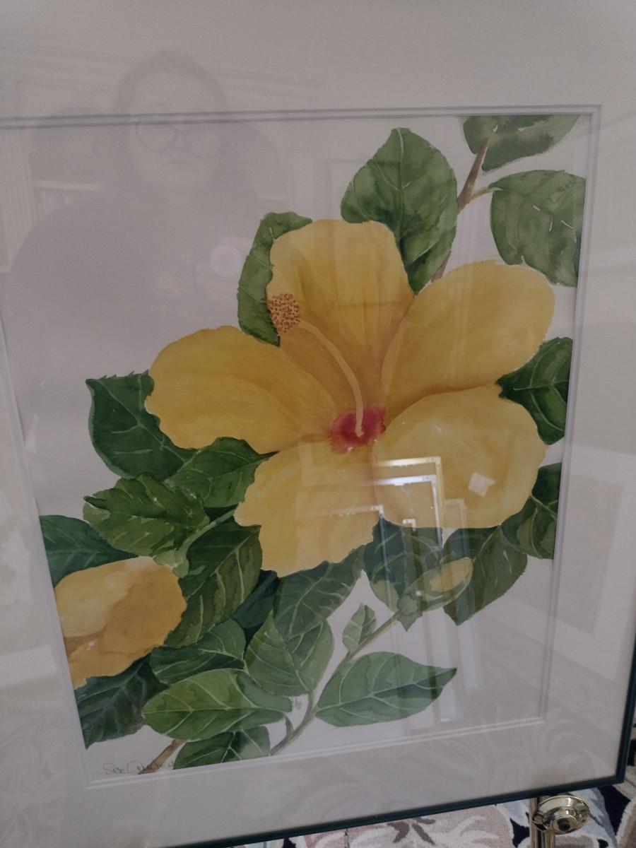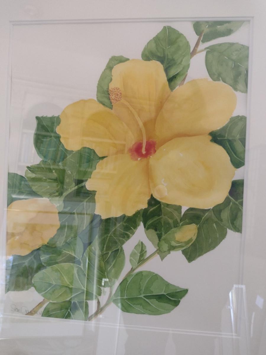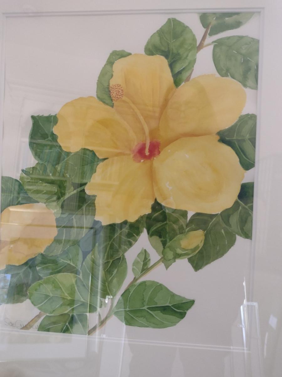 'Yellow Hibiscus' Original Framed Watercolor by Nationally Recognized Artist Susan Anderson (#18). Item is framed under plexiglass.