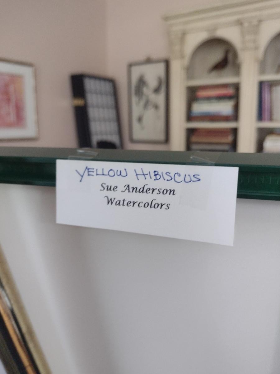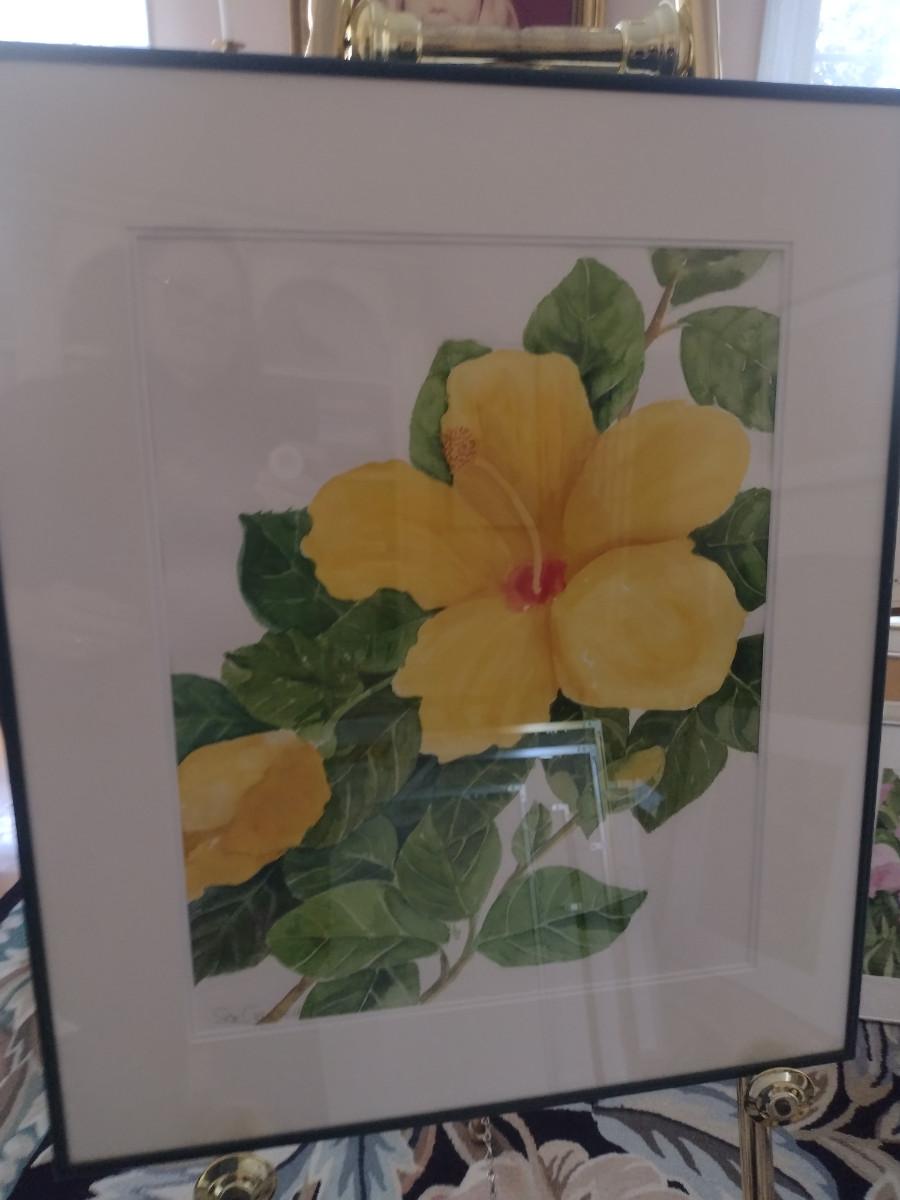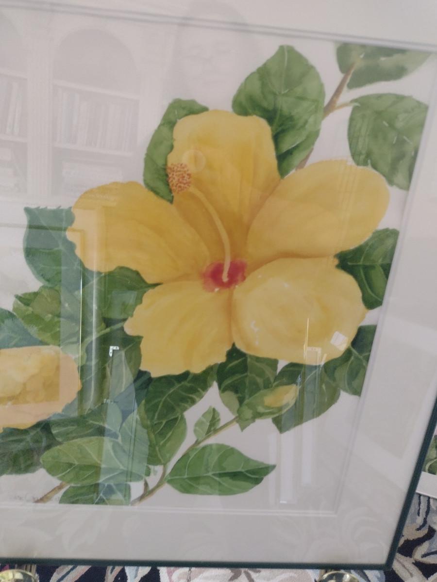 'Yellow Hibiscus' Original Framed Watercolor by Nationally Recognized Artist Susan Anderson (#18). Item is framed under plexiglass.