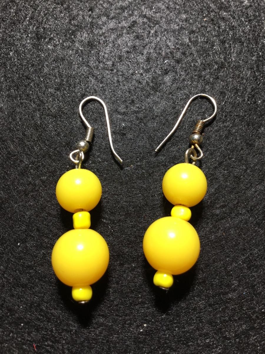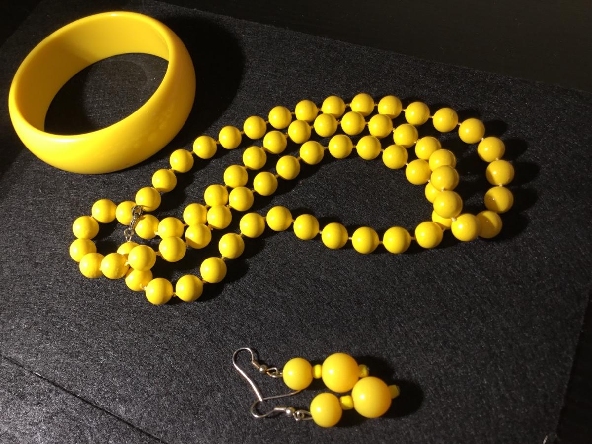 Yellow lemon color beaded fashion necklace and earrings and fashion bangle bracelet