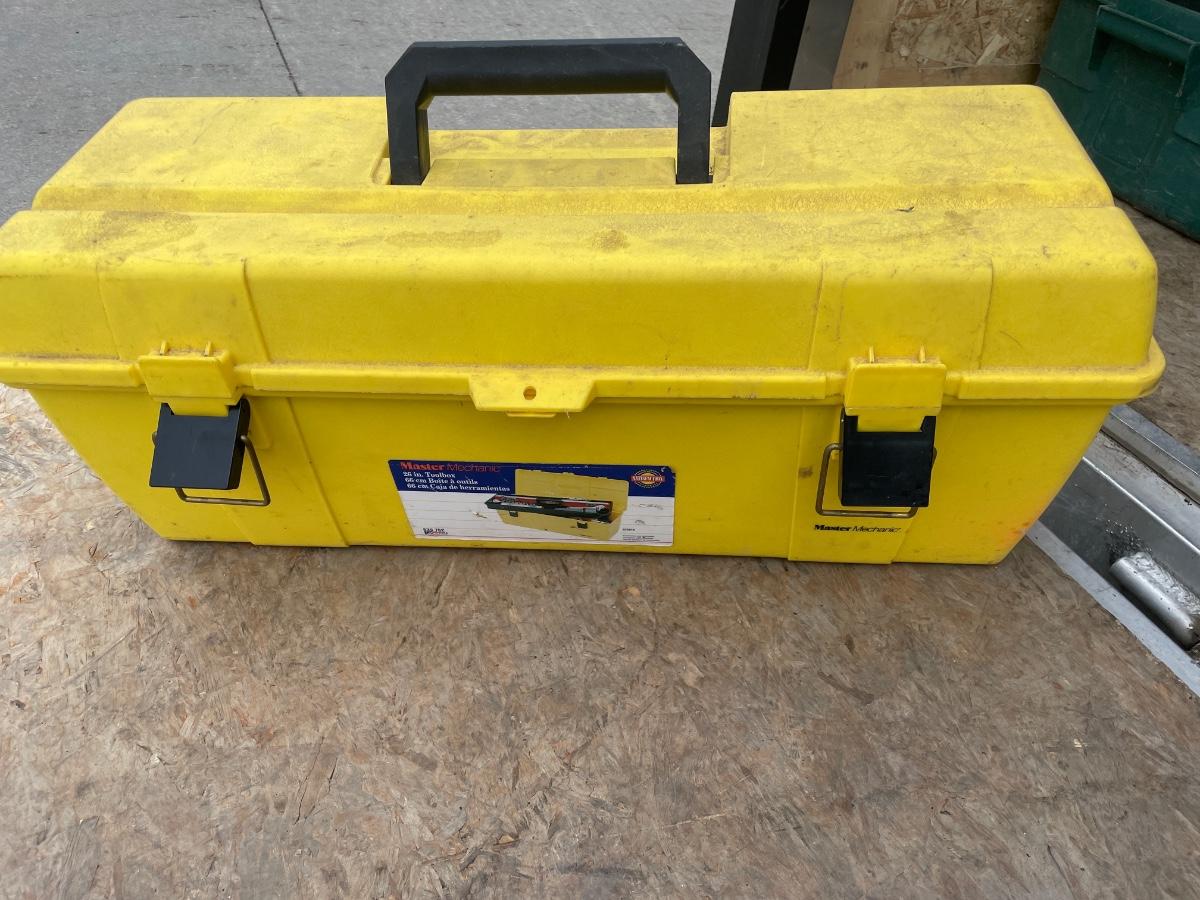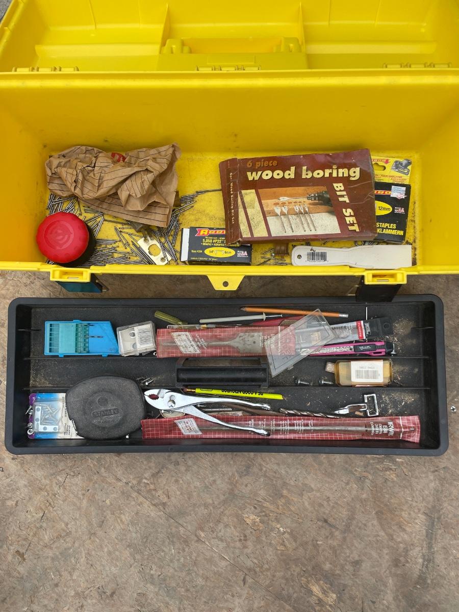 Yellow plastic tool box and tools