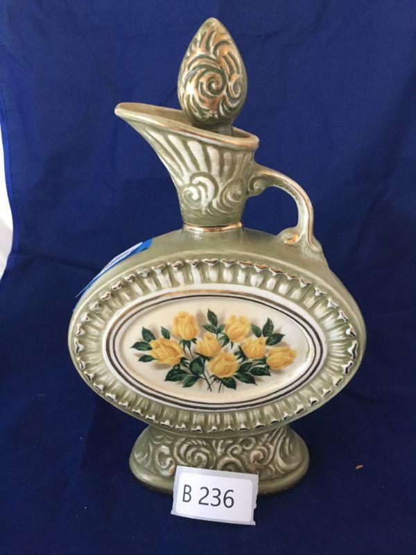 This decanter is in good condition. It's green and has an image of yellow roses.