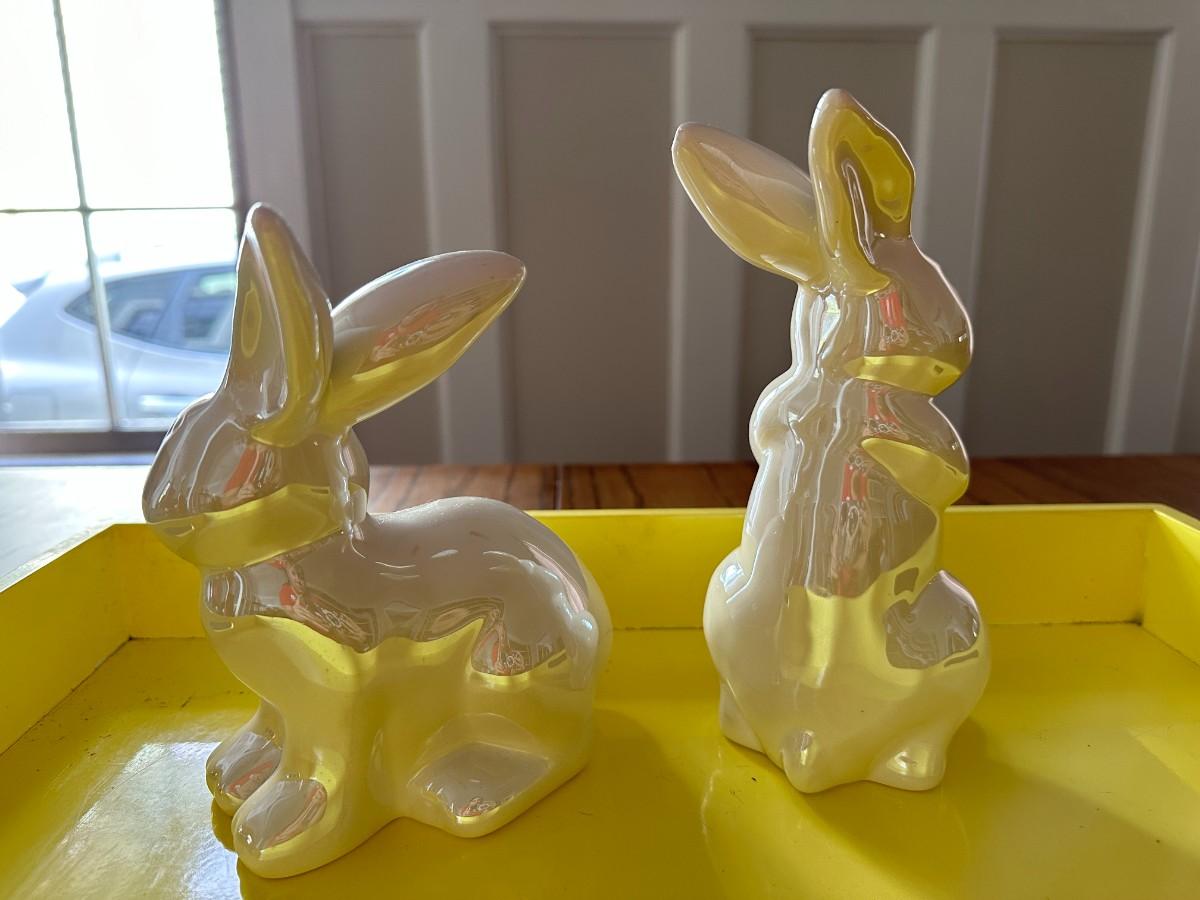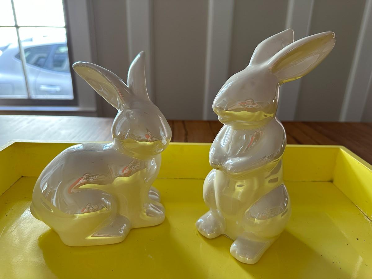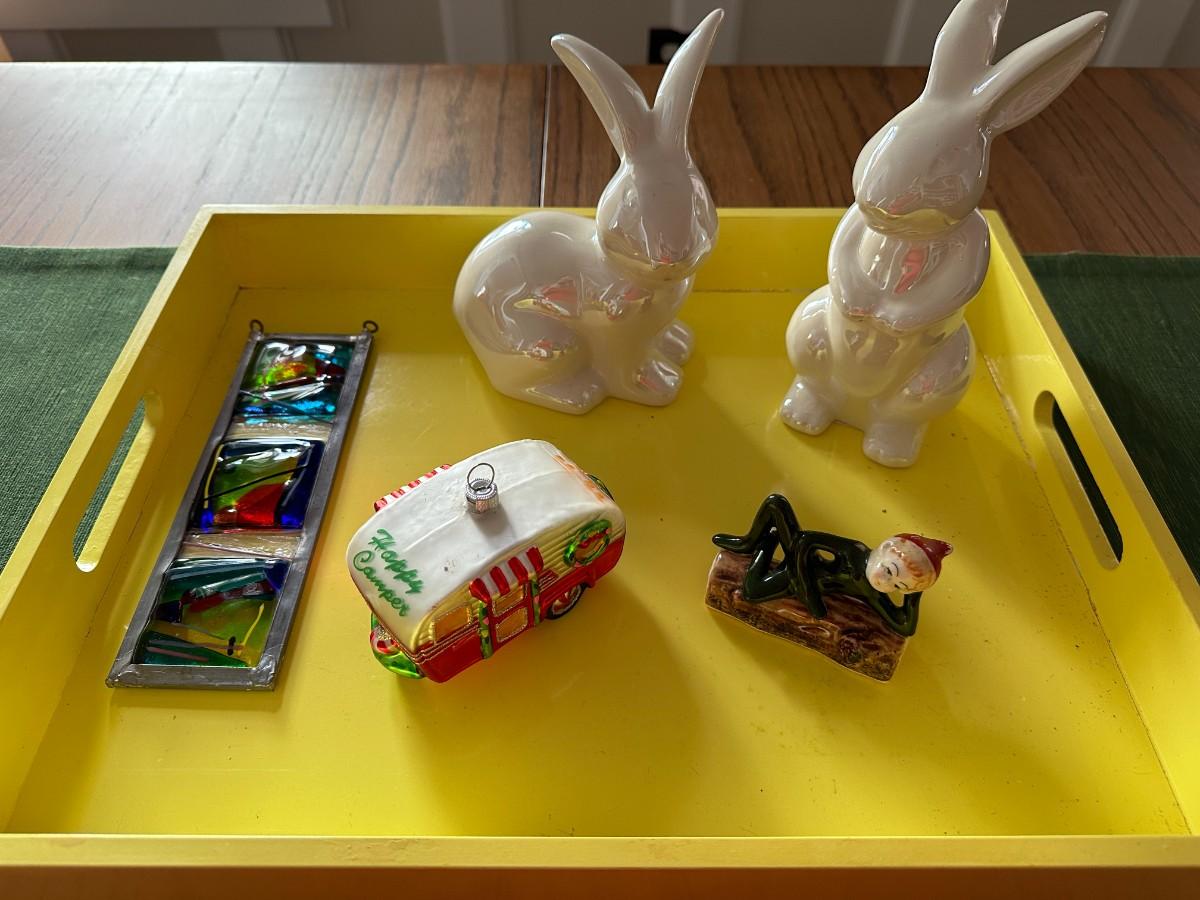 Bright Yellow Tray 18" x 14". Set of 2 White Glazed Bunnies, Elf Figurine - broken foot on back. Colorful Holiday Camper Ornament. Small Stained Glass Art-has small cracks in clear glass
