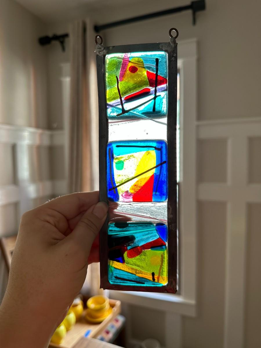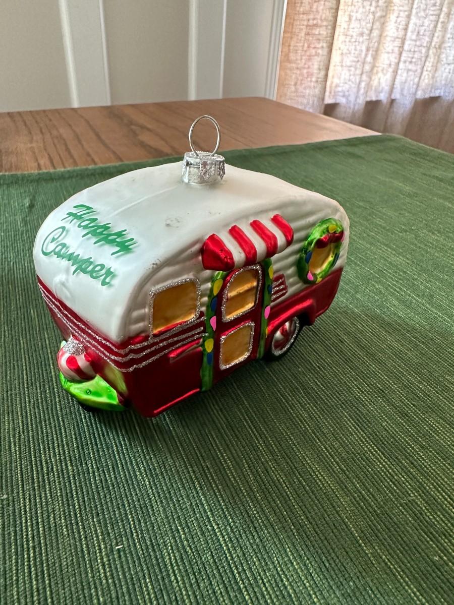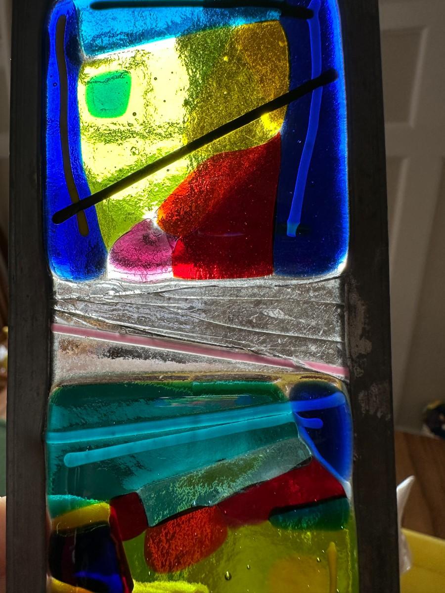 Bright Yellow Tray 18" x 14". Set of 2 White Glazed Bunnies, Elf Figurine - broken foot on back. Colorful Holiday Camper Ornament. Small Stained Glass Art-has small cracks in clear glass
