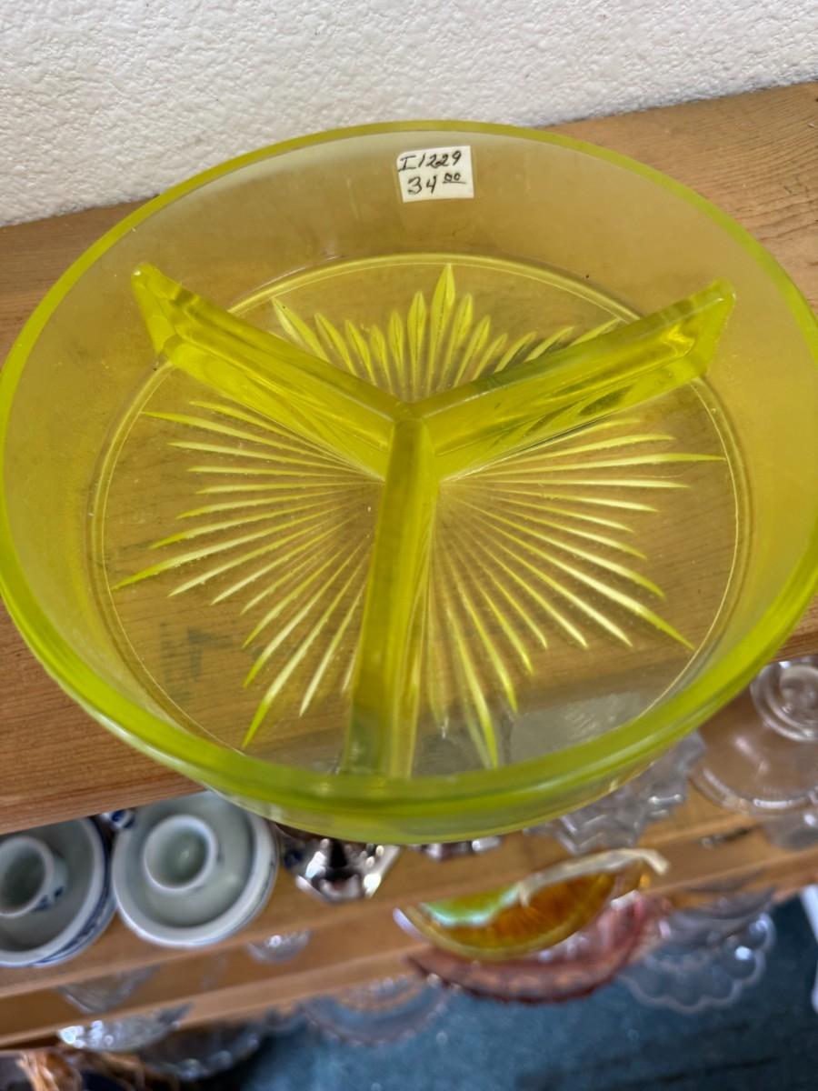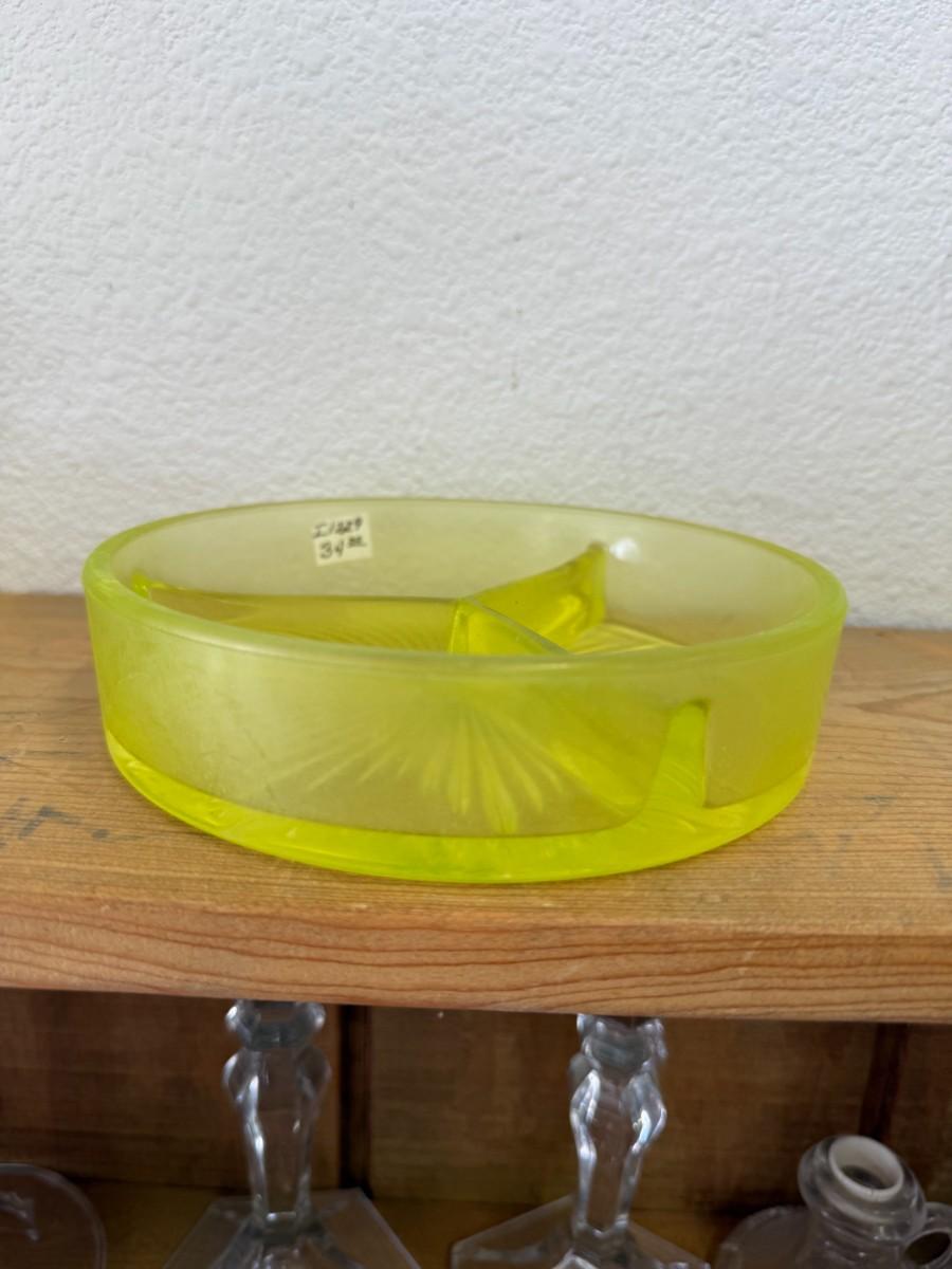 Yellow Uranium Vaseline Glass, Round Divided Candy Nut Dish, Antique