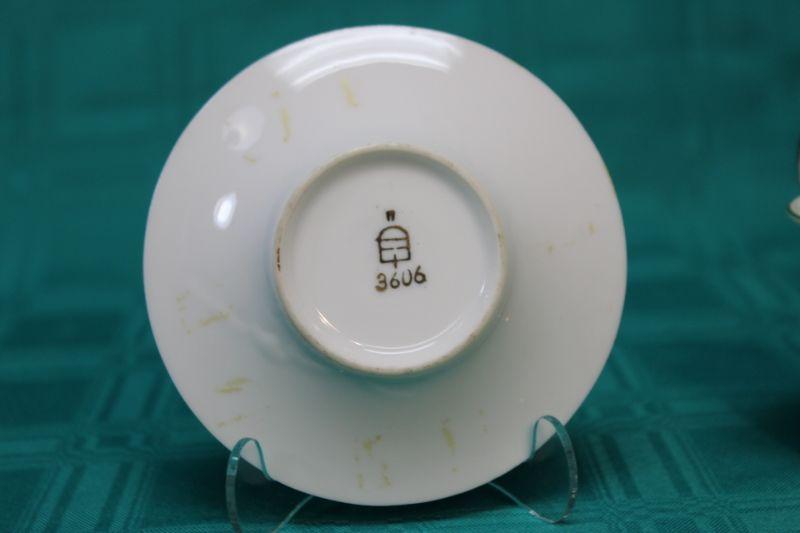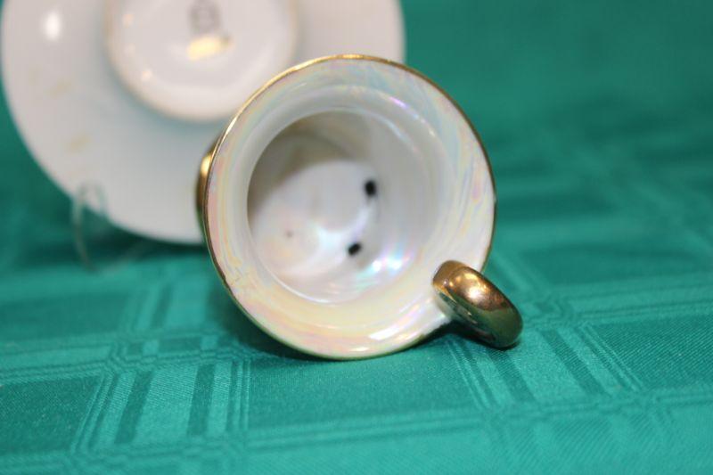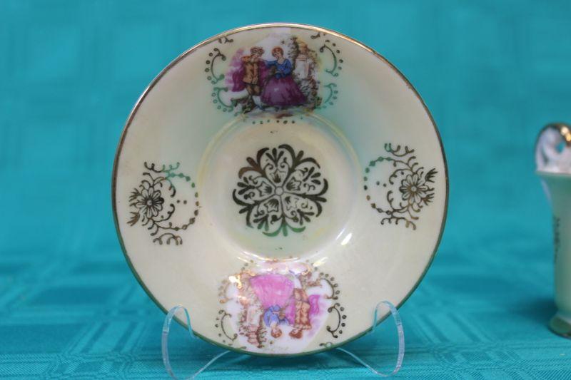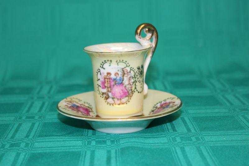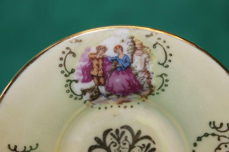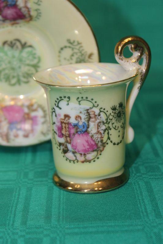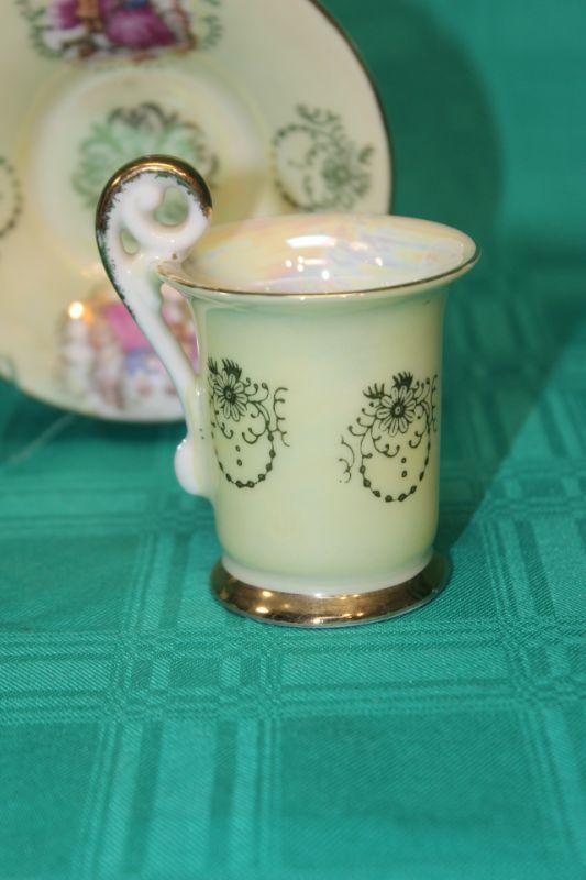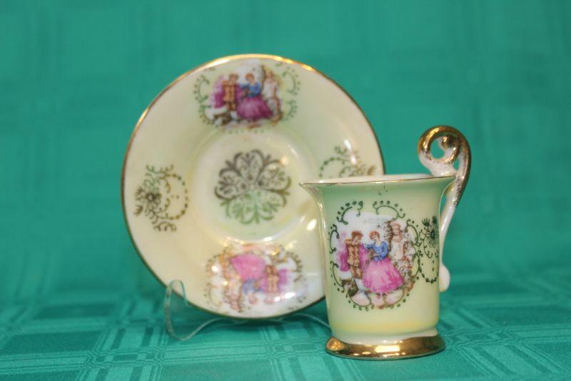 Pale yellow demitasse tea cup and saucer. Gold details. Victorian couple scene on both pieces. Slight iridescent finish. Looks like pieces may have been taped together when looking at the back of saucer. No chips. Maker's mark.