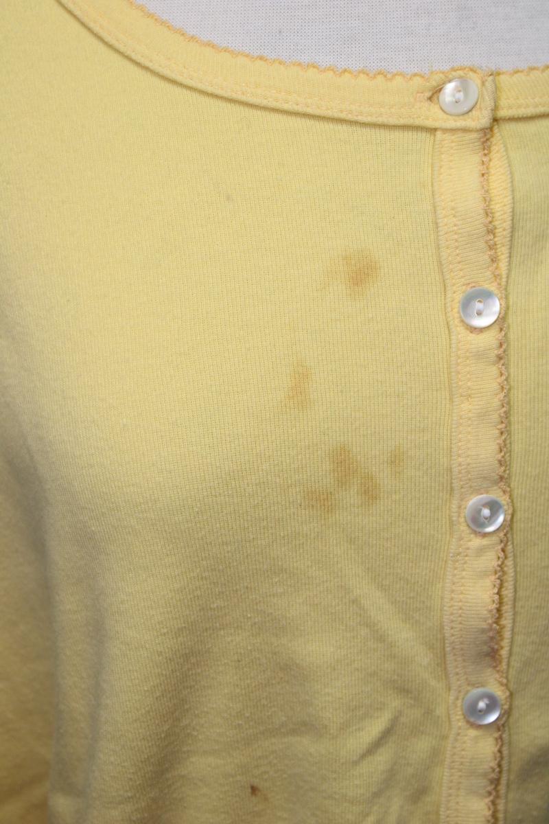 Item has some stains on the front of the shirt and under the upper part of the sleeve. This shirt comes in an XL and is made up if 100% cotton. It comes with shoulder pads but can be easily removed. The button up shirt was made in Thailand.
