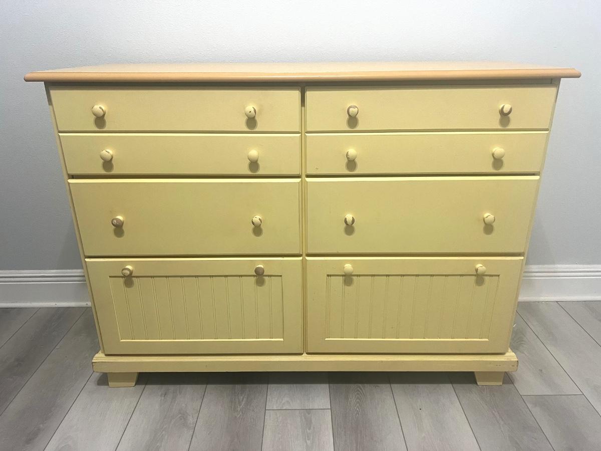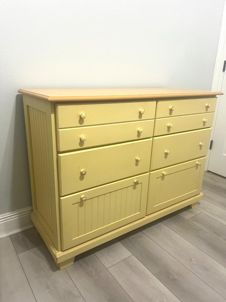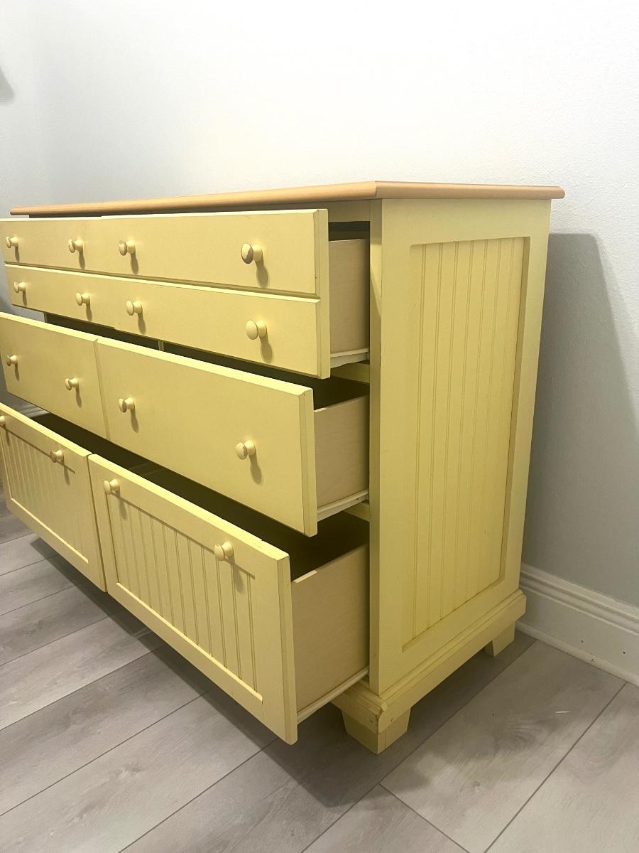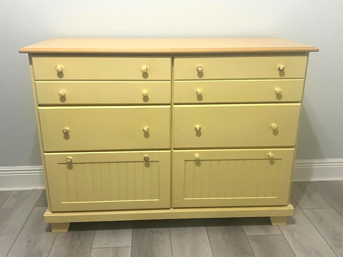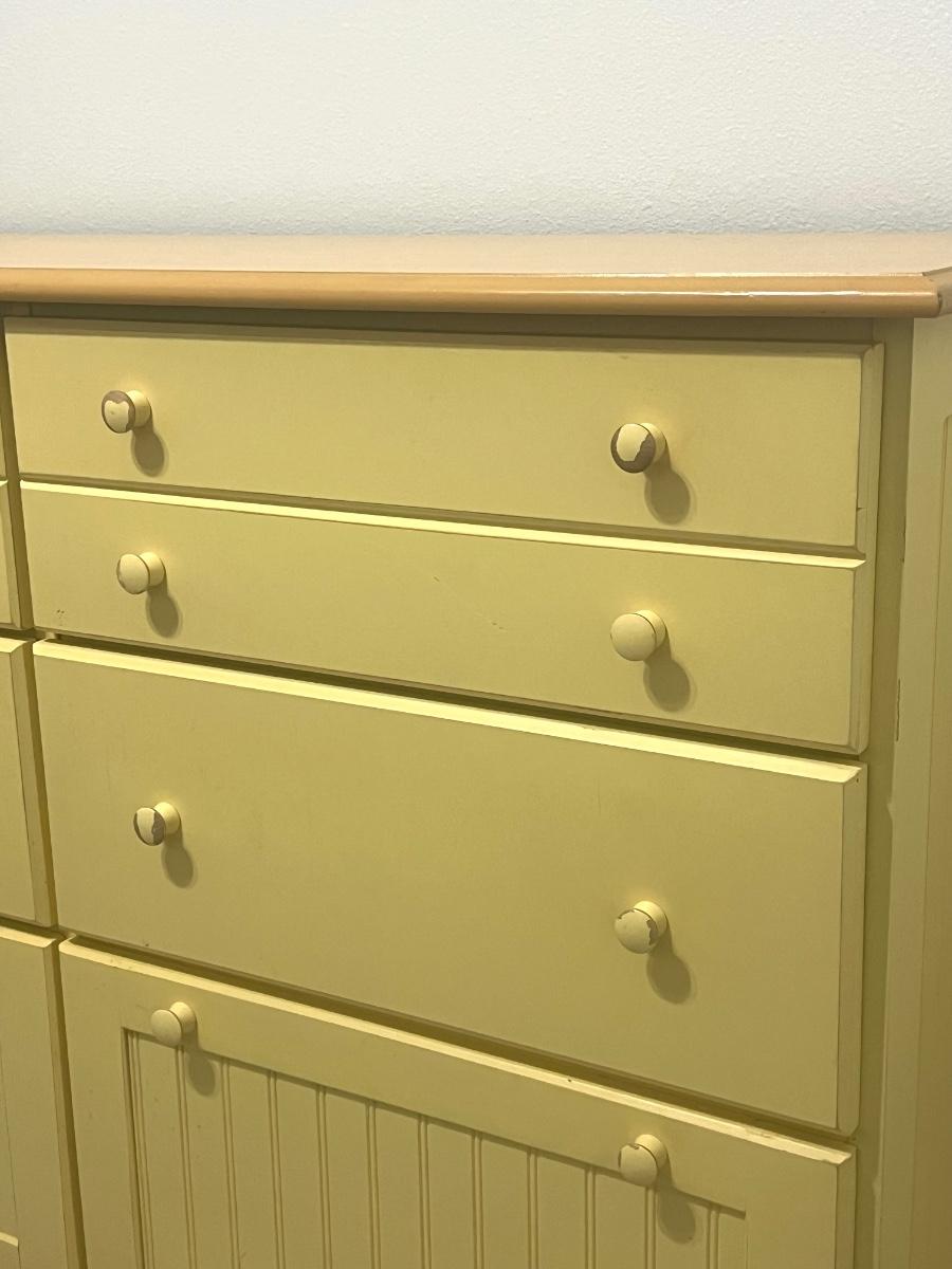 Does have some paint chipping, mostly on knobs but also on corners. Color is a shade of yellow with a light colored wooden top. Please see all pictures. Measures 47”W x 18”D x 34.5”T. All drawers work as they should.