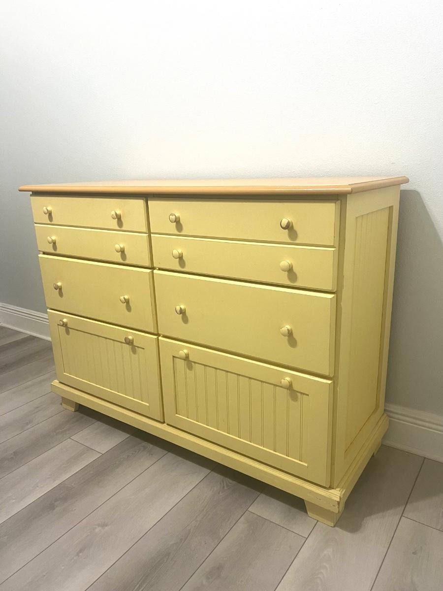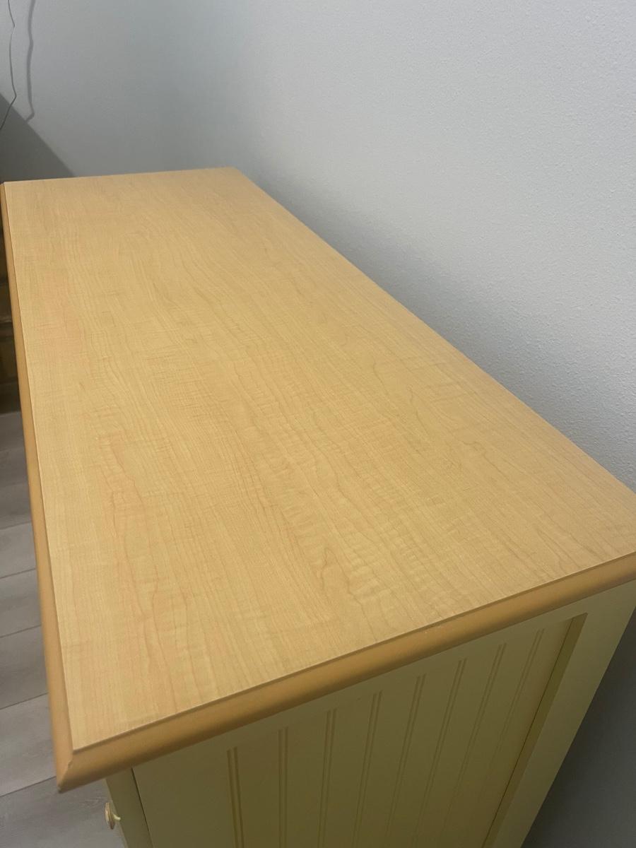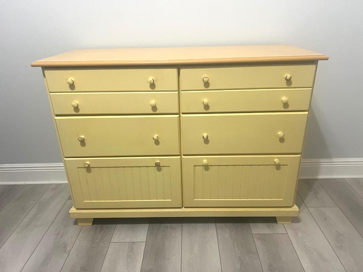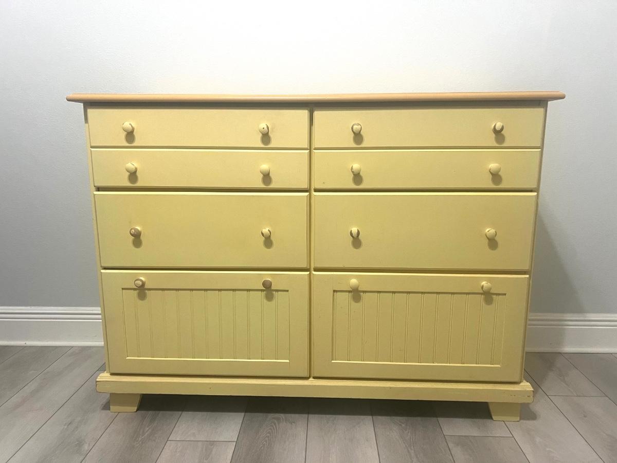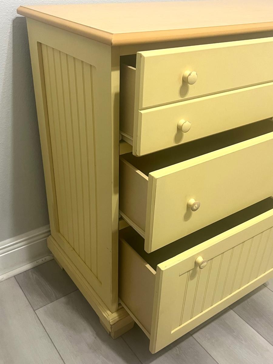 Does have some paint chipping, mostly on knobs but also on corners. Color is a shade of yellow with a light colored wooden top. Please see all pictures. Measures 47”W x 18”D x 34.5”T. All drawers work as they should.