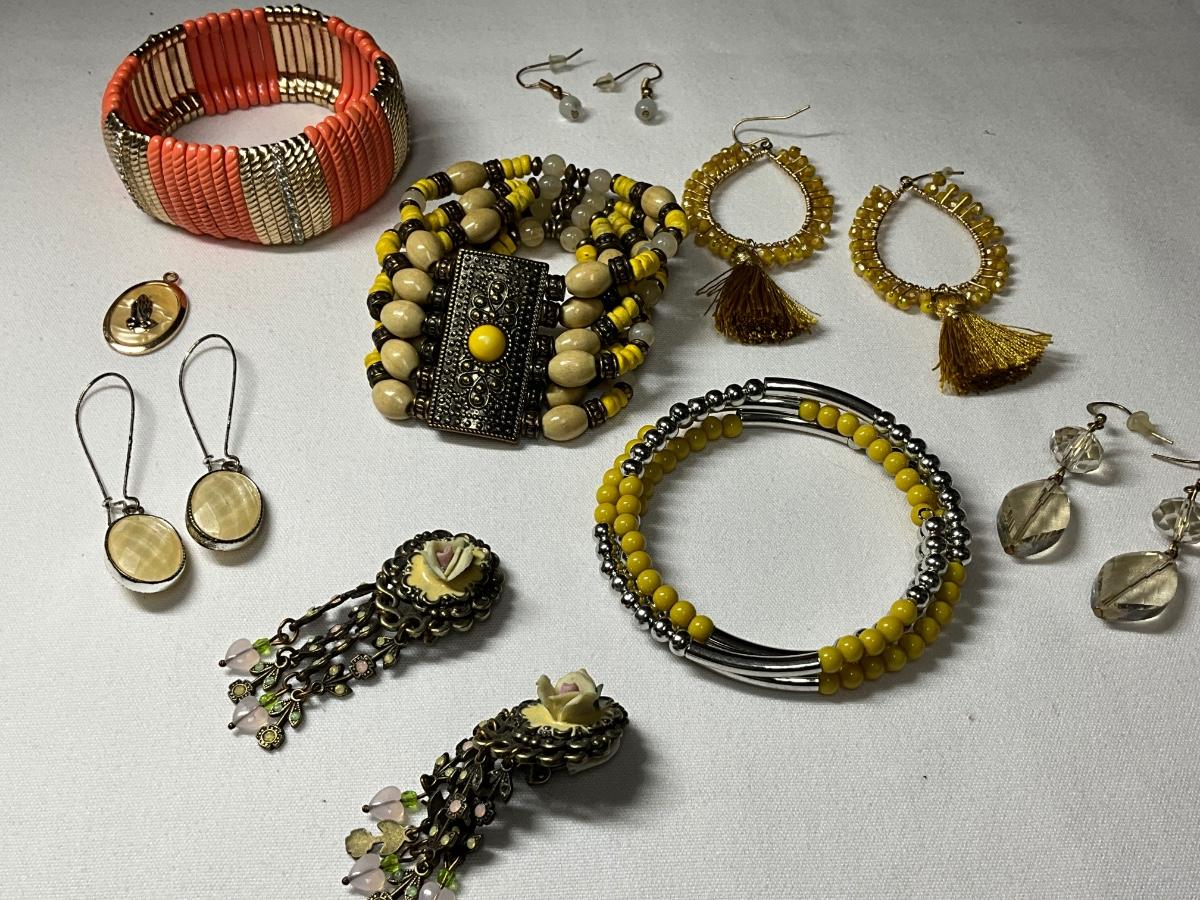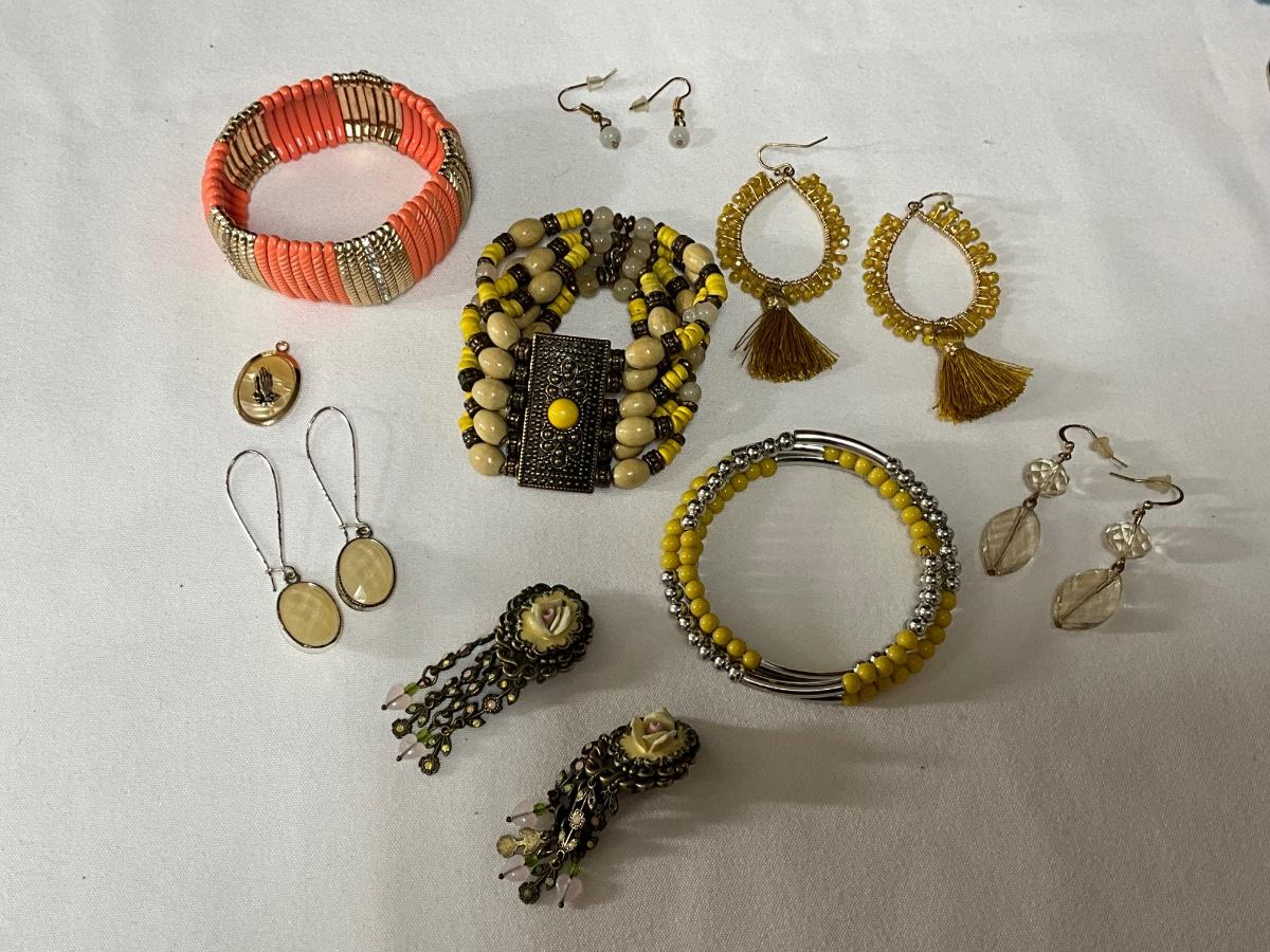 Yellow/silver bracelets, PE, Clip Earrings, & orange/gold bracelet