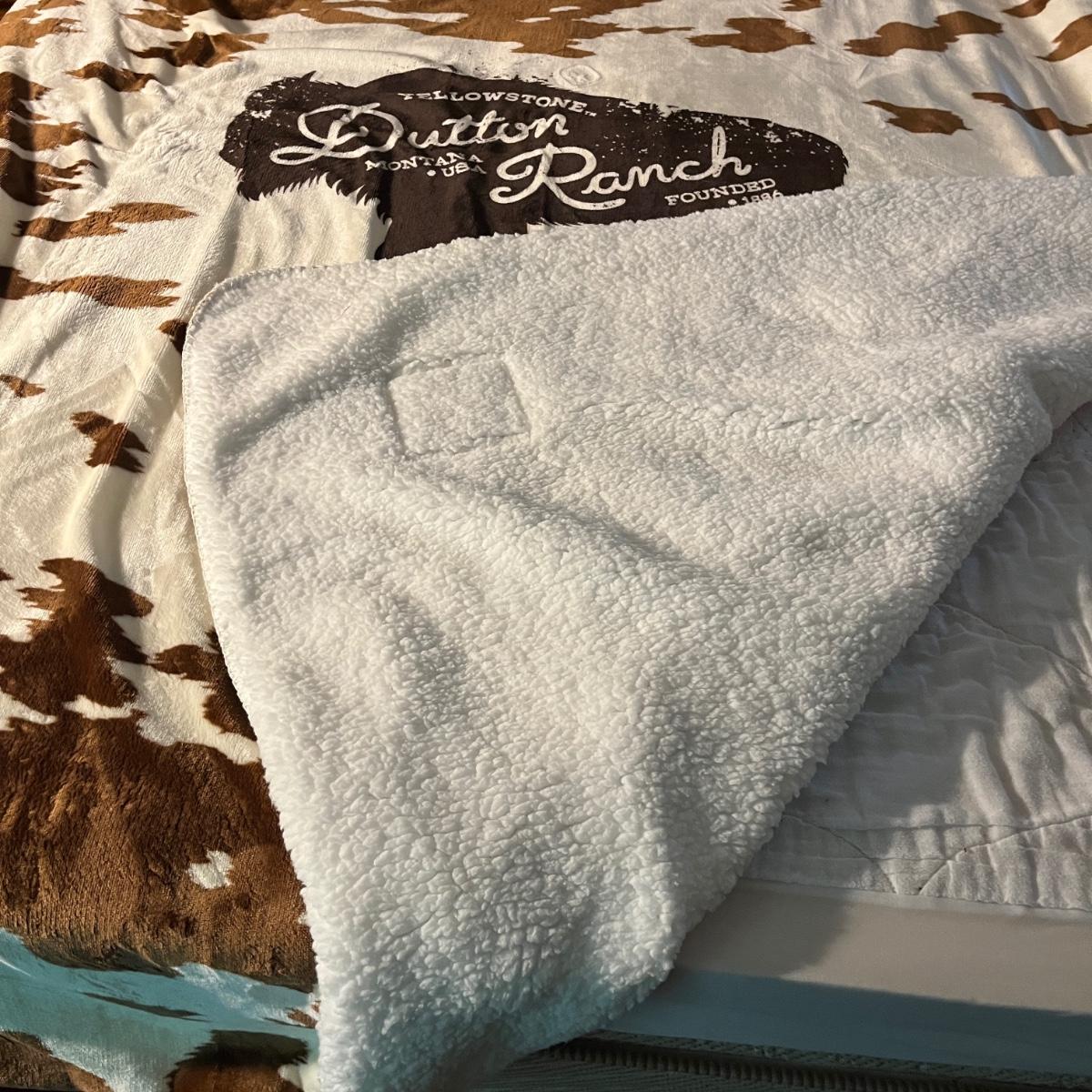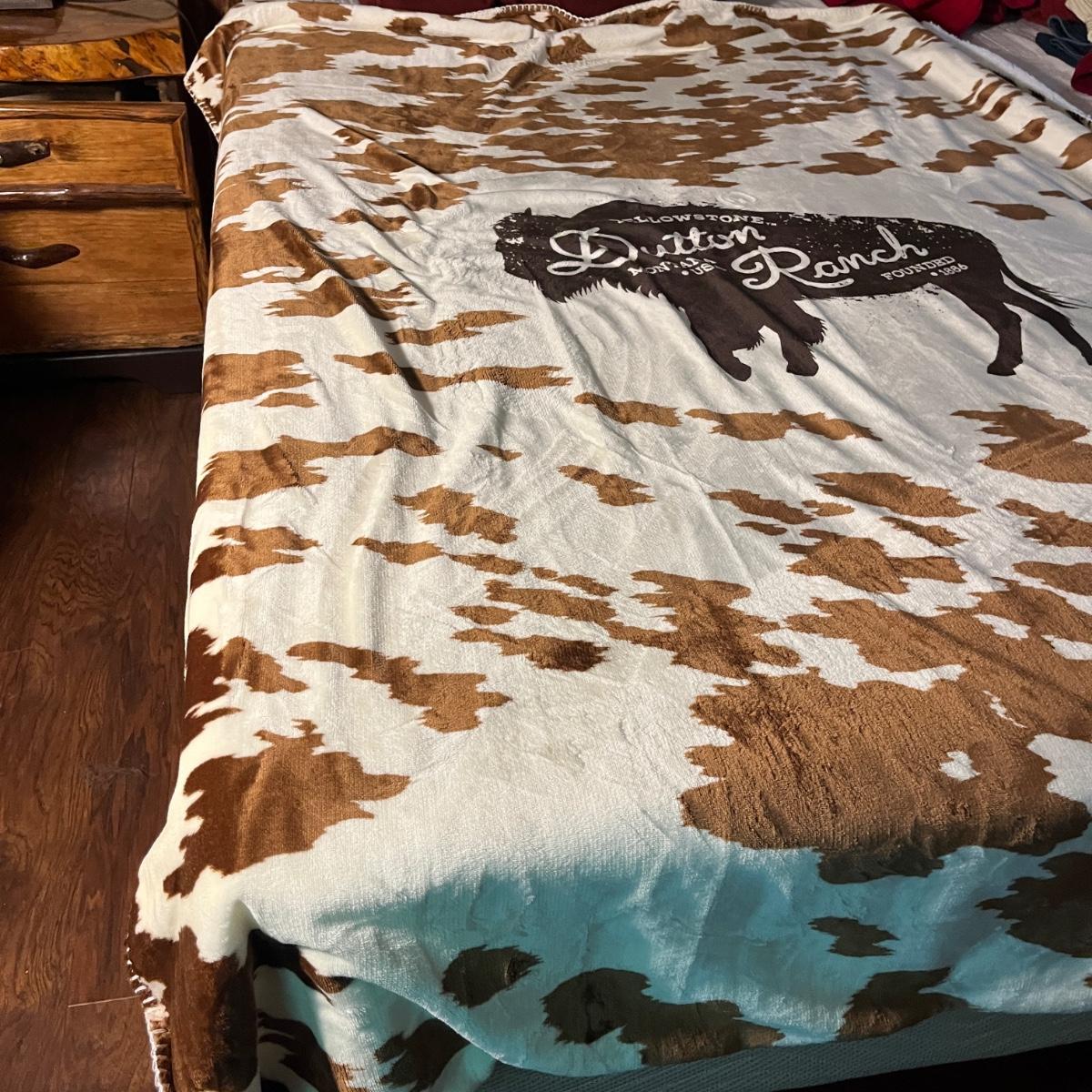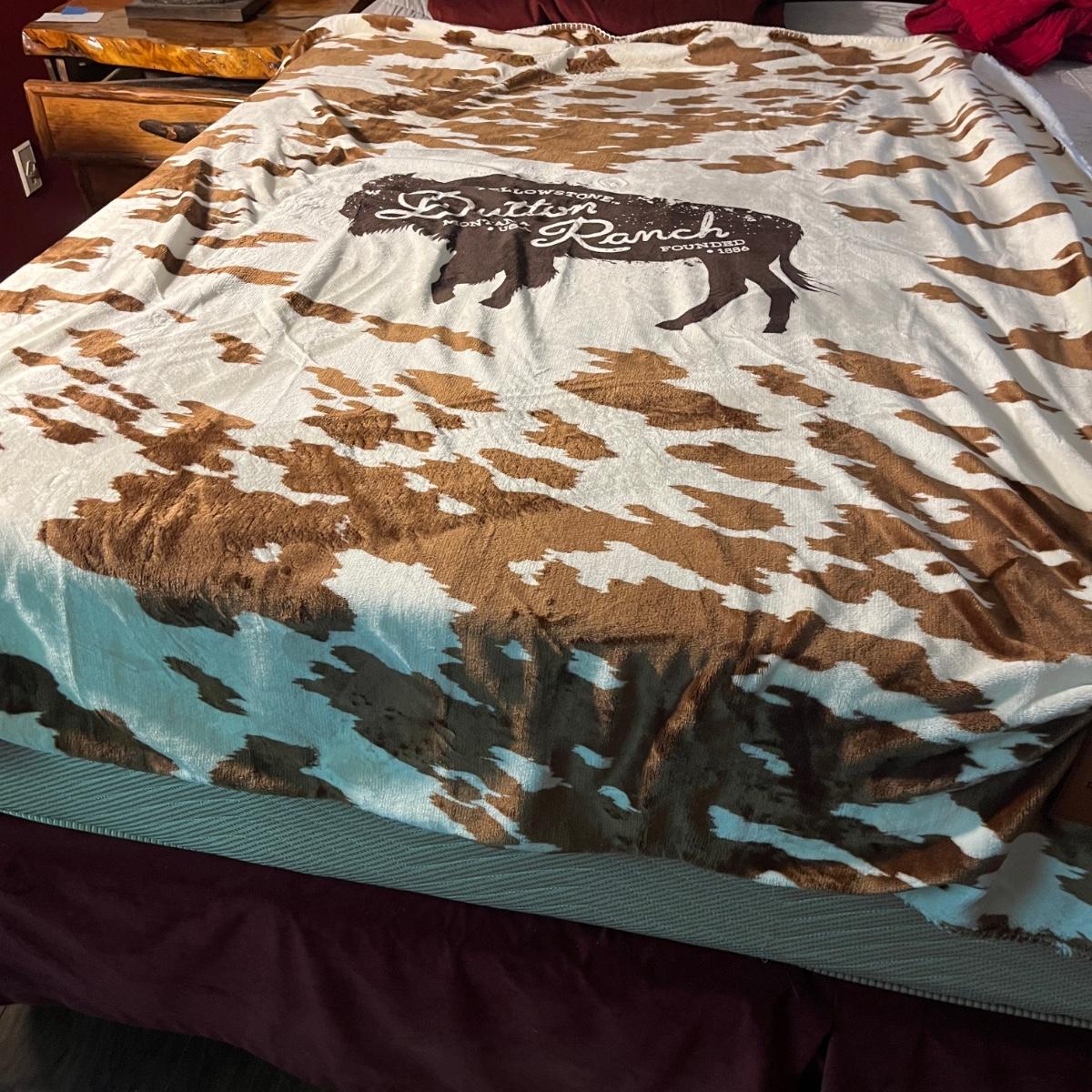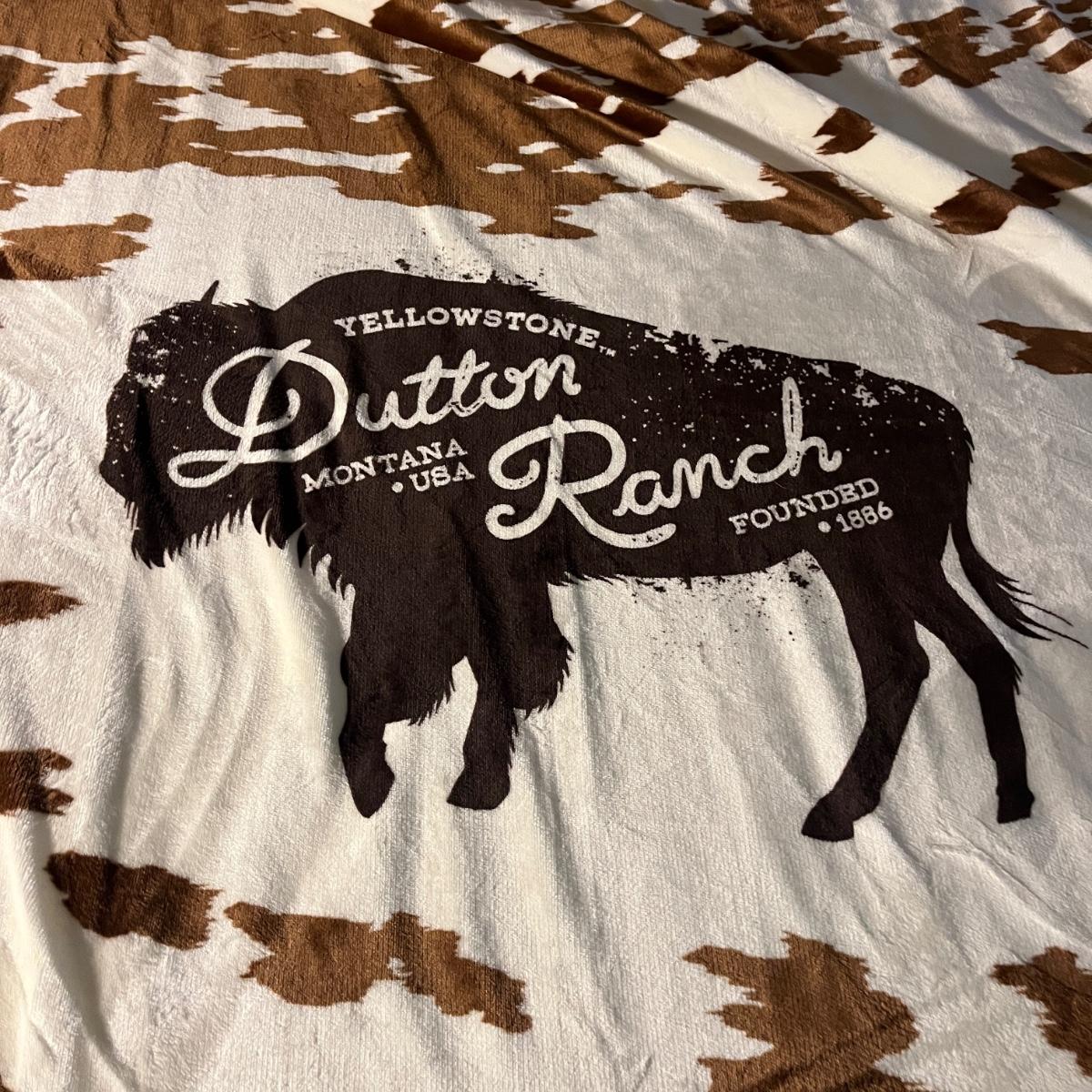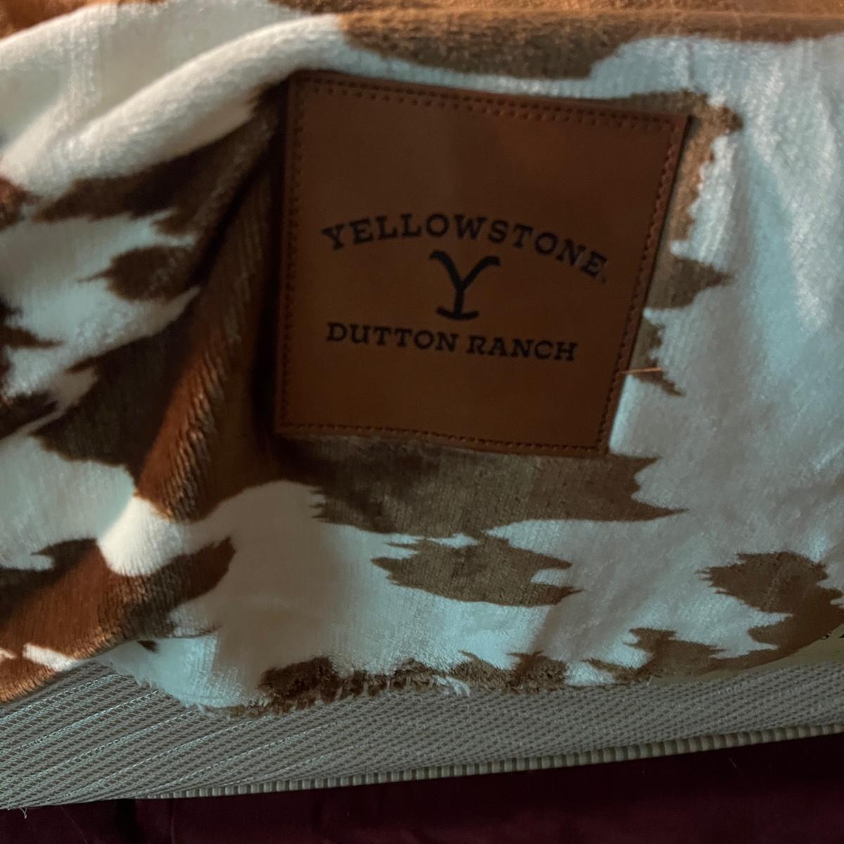 Lot includes a Yellowstone Dutton Ranch accent pillow and throw, both items appear unused. Throw measures 58” x 72”.