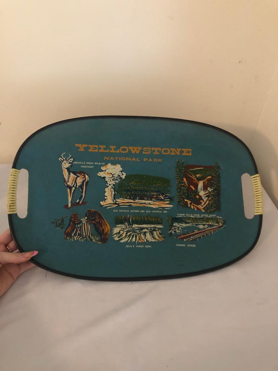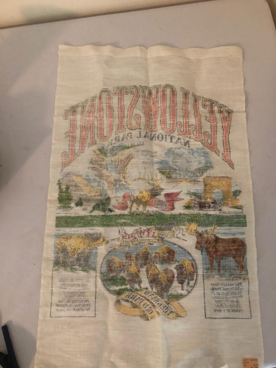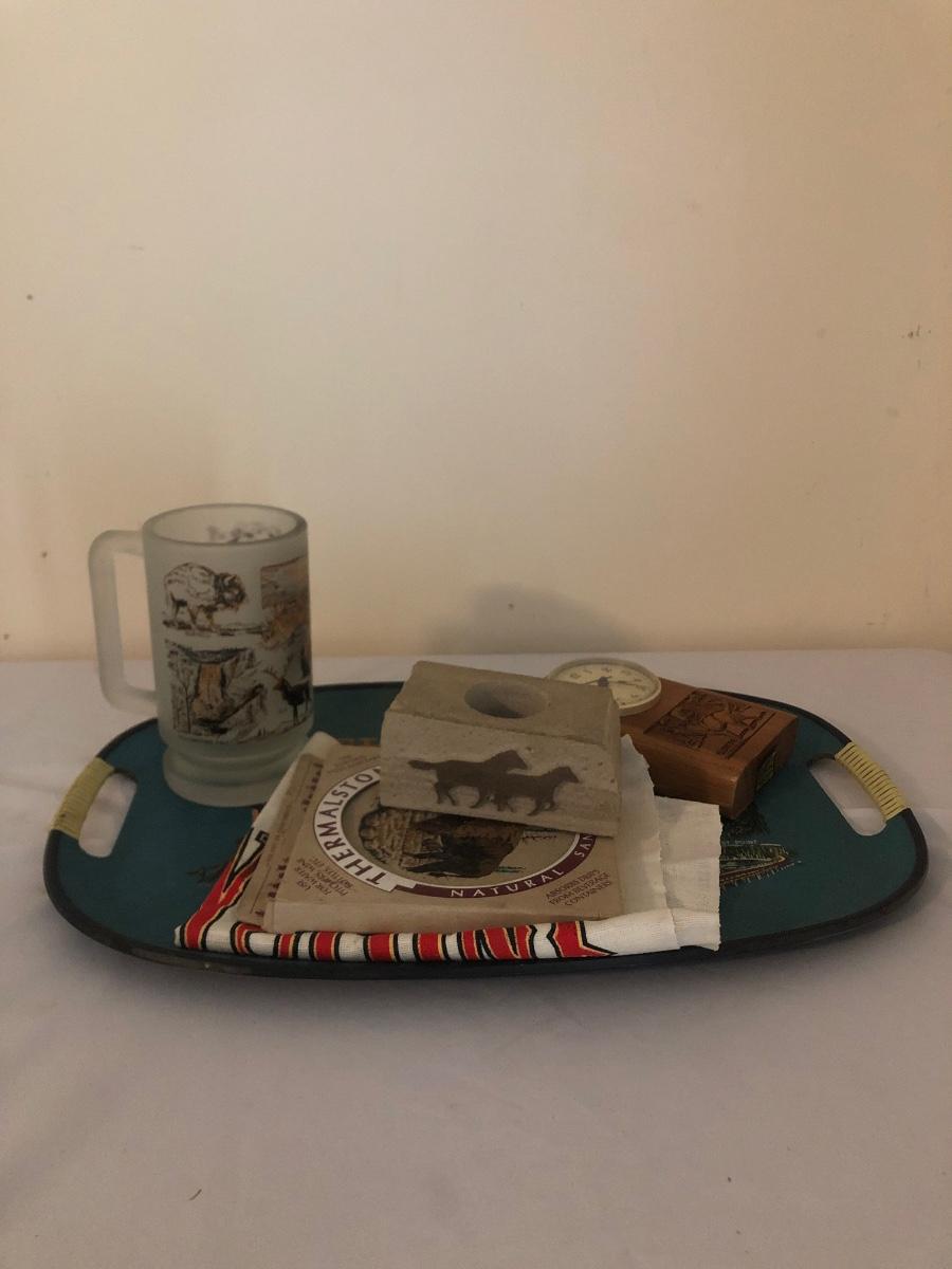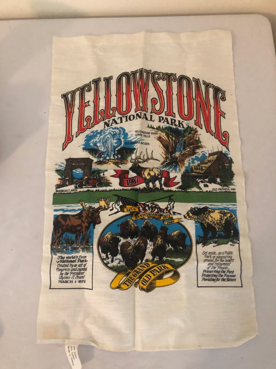 All of these items are related to Yellowstone National Park. Lot includes souvenirs. Beautiful tea towel, tray, frosted stein, wooden clock as well two sandstone pieces.