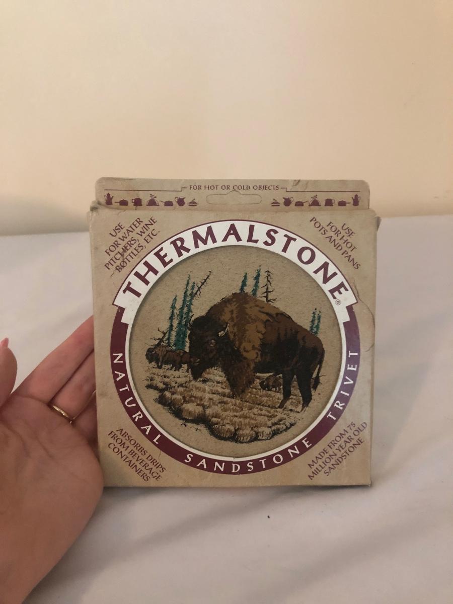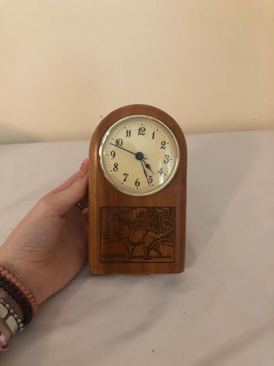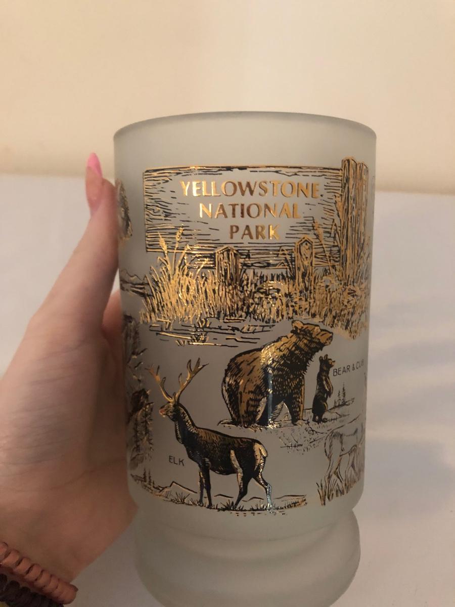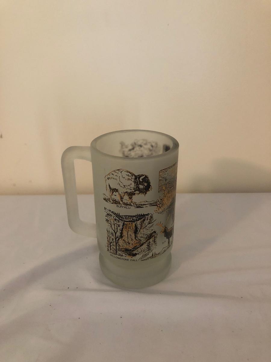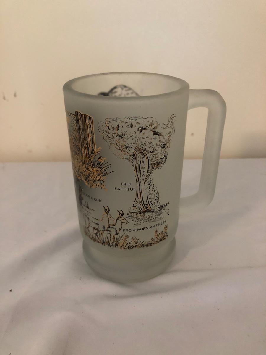 All of these items are related to Yellowstone National Park. Lot includes souvenirs. Beautiful tea towel, tray, frosted stein, wooden clock as well two sandstone pieces.