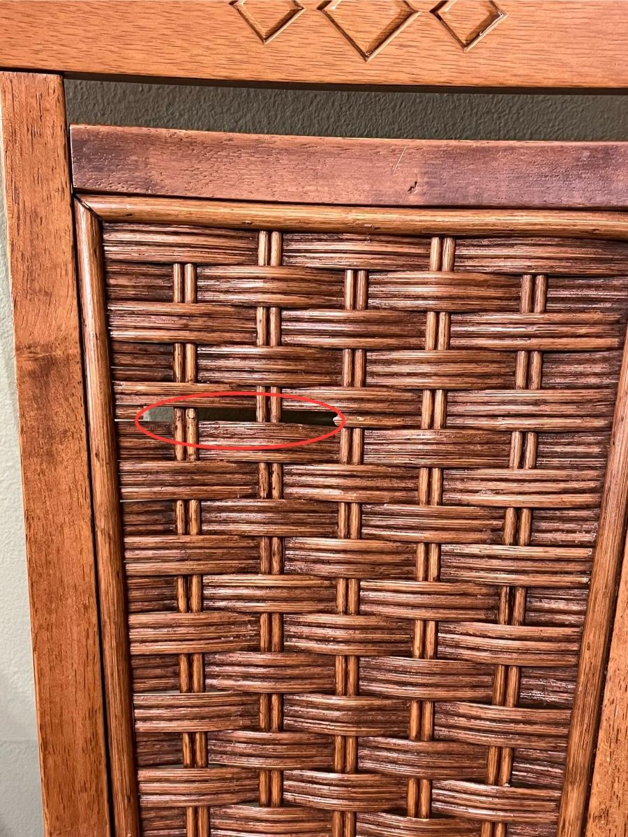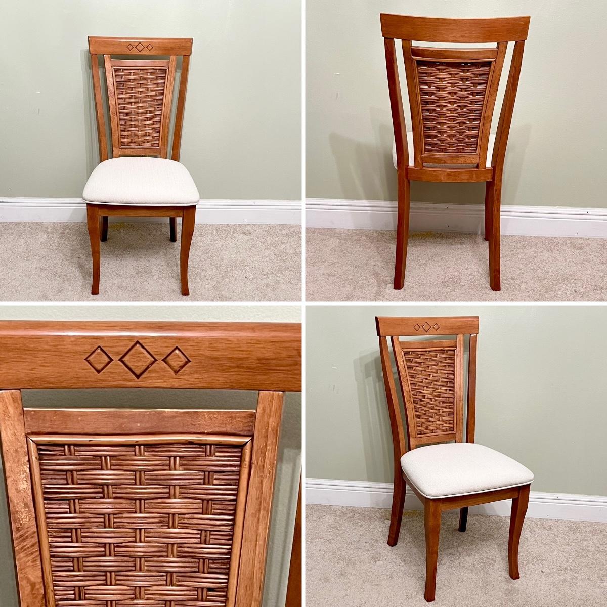 Table 30” H x 59” W x 35” D ~ (3) Chairs 37” H x 17” W x 18” D ~ Seat 19” H ~ One chair has piece missing on woven back as seen in photo