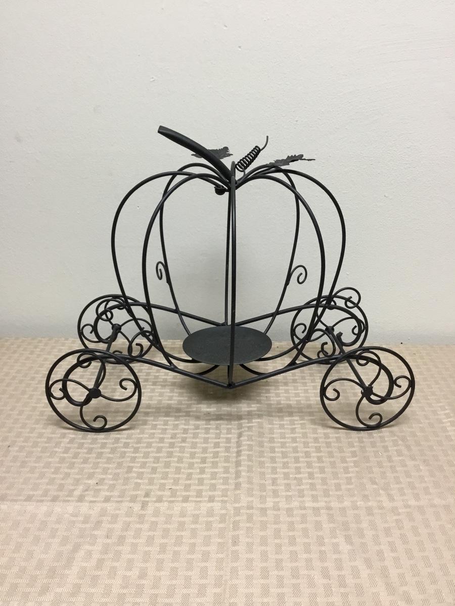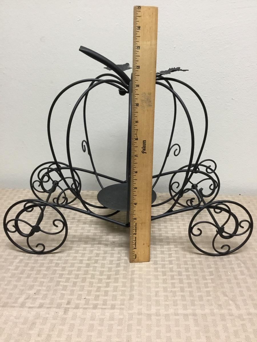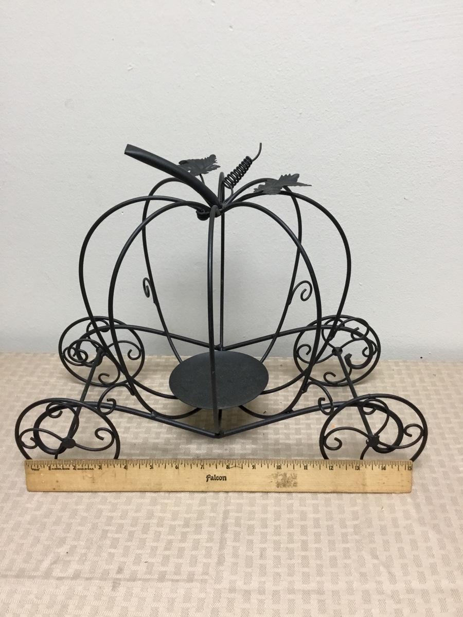 Black Metal Pumpkin Carriage Candle Holder. One of the pumpkin bars moves for easy placement of candle. In good condition. About 16" size.