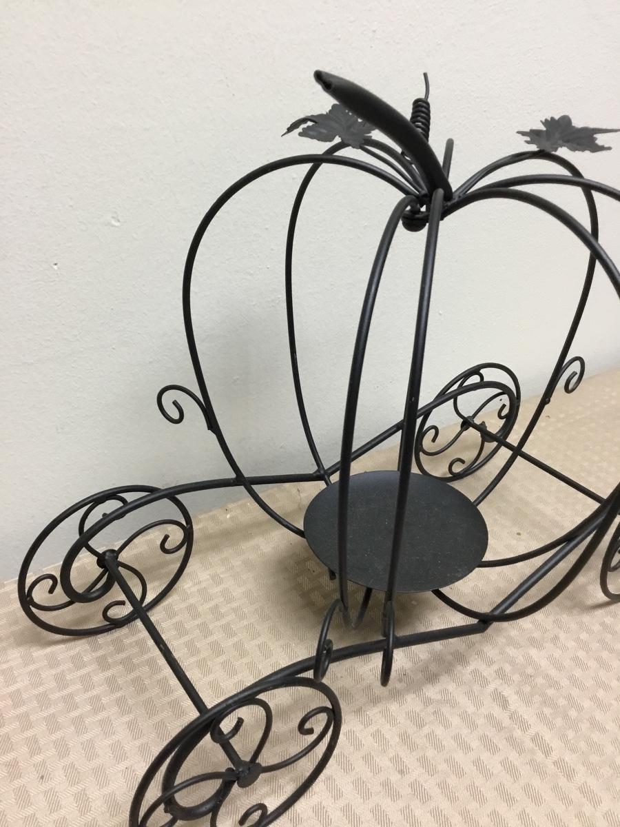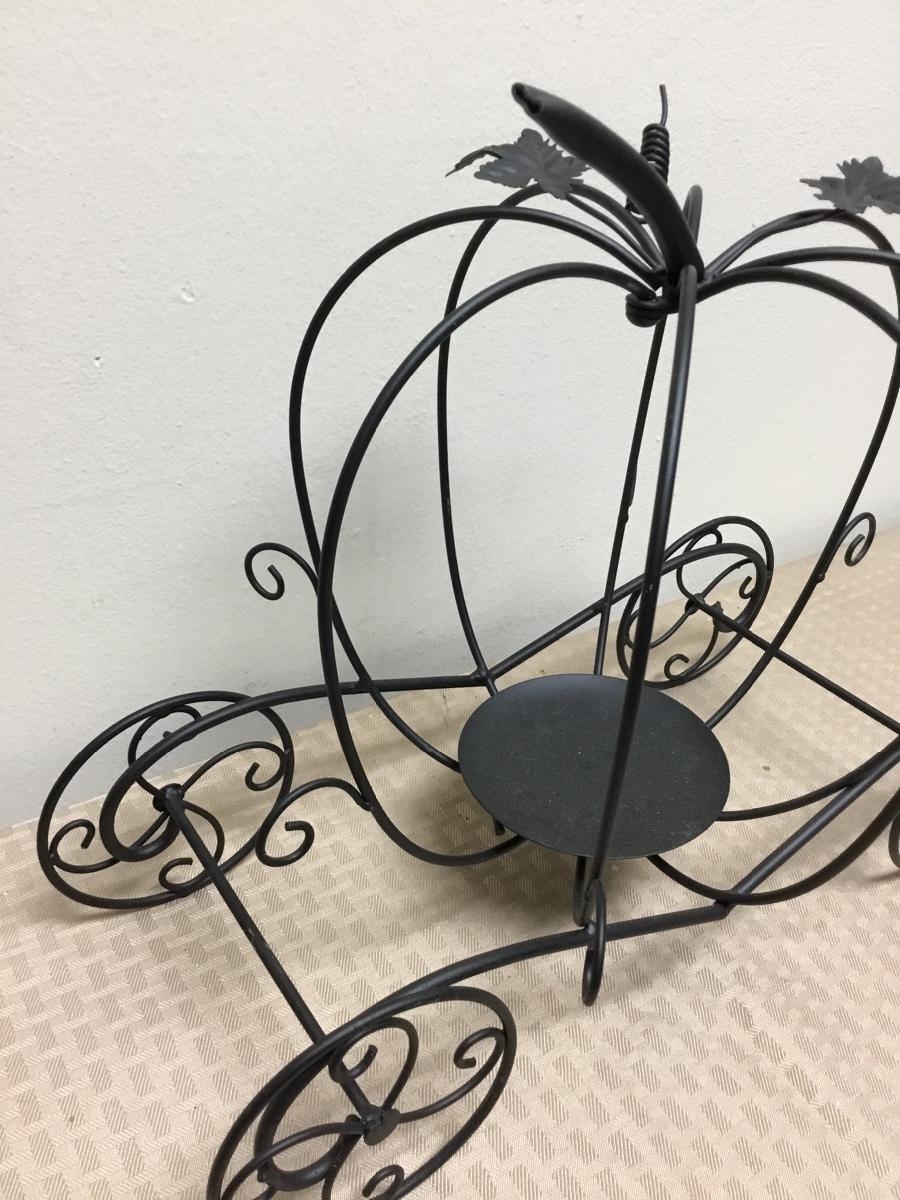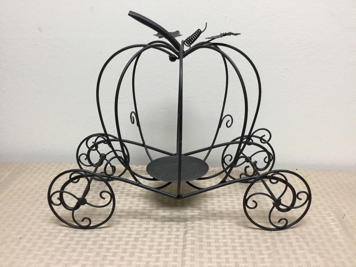 Black Metal Pumpkin Carriage Candle Holder. One of the pumpkin bars moves for easy placement of candle. In good condition. About 16" size.