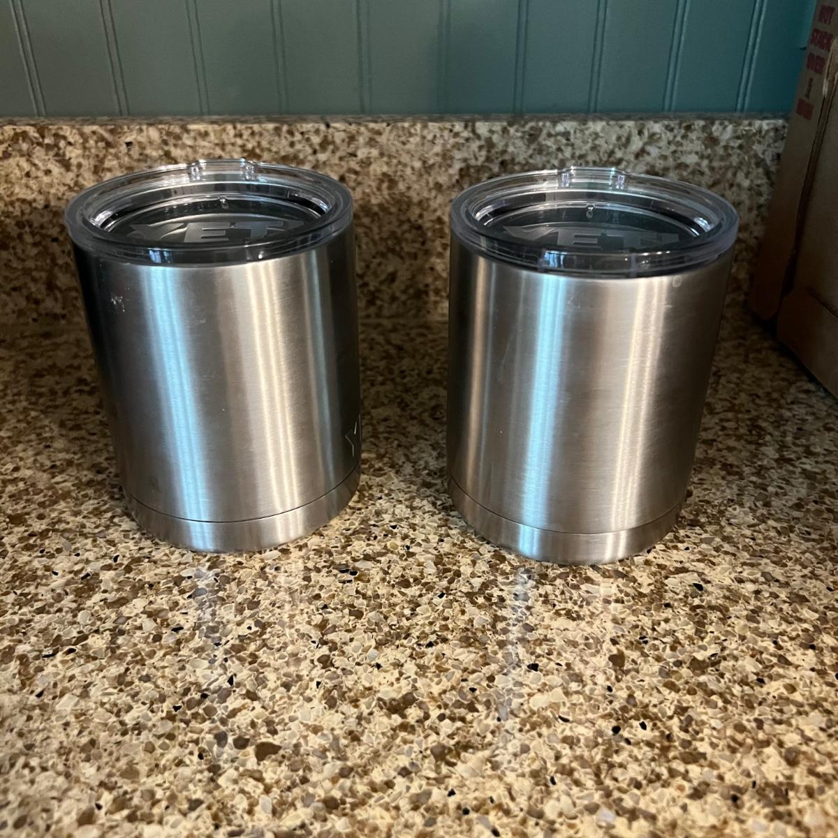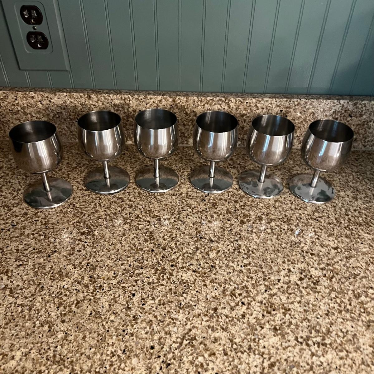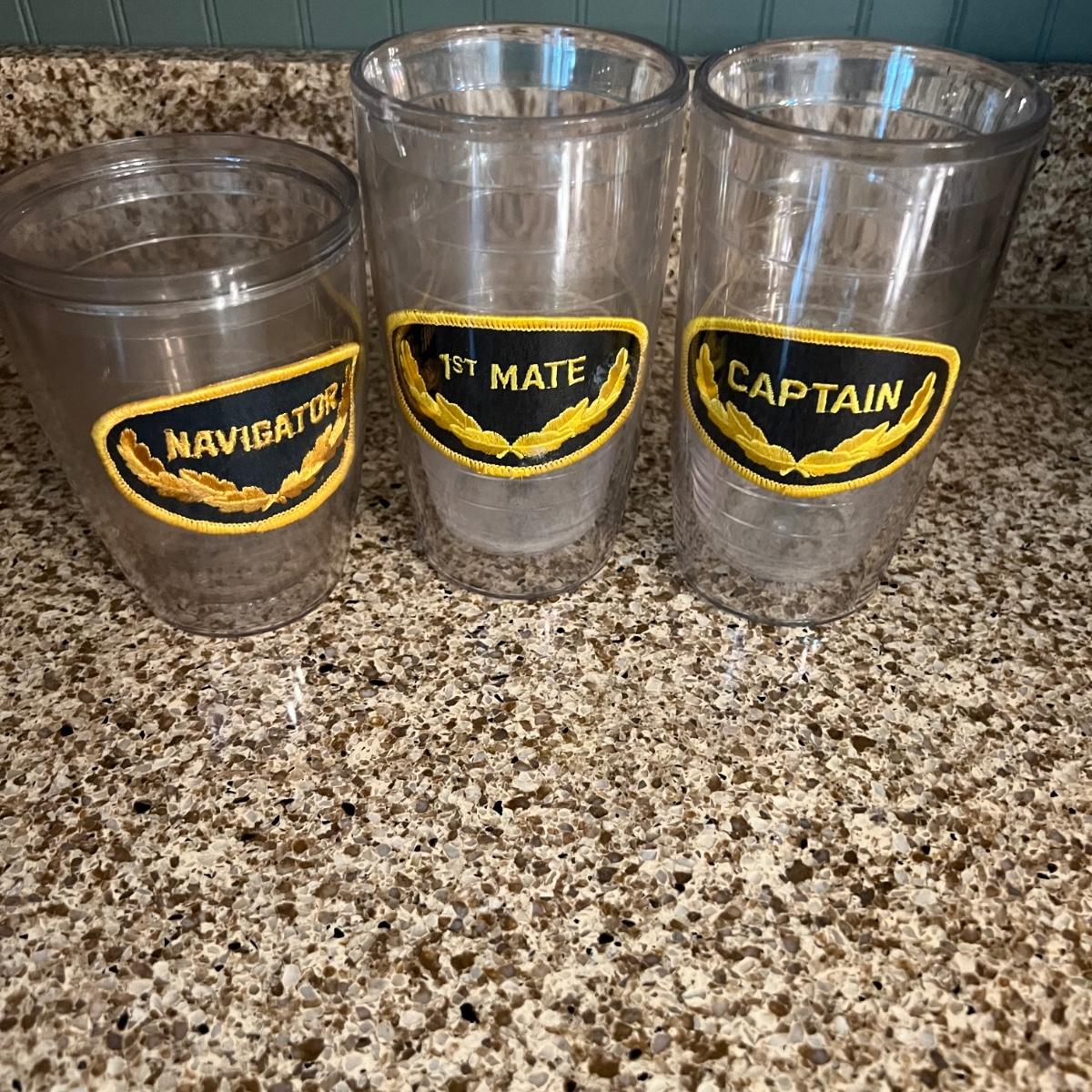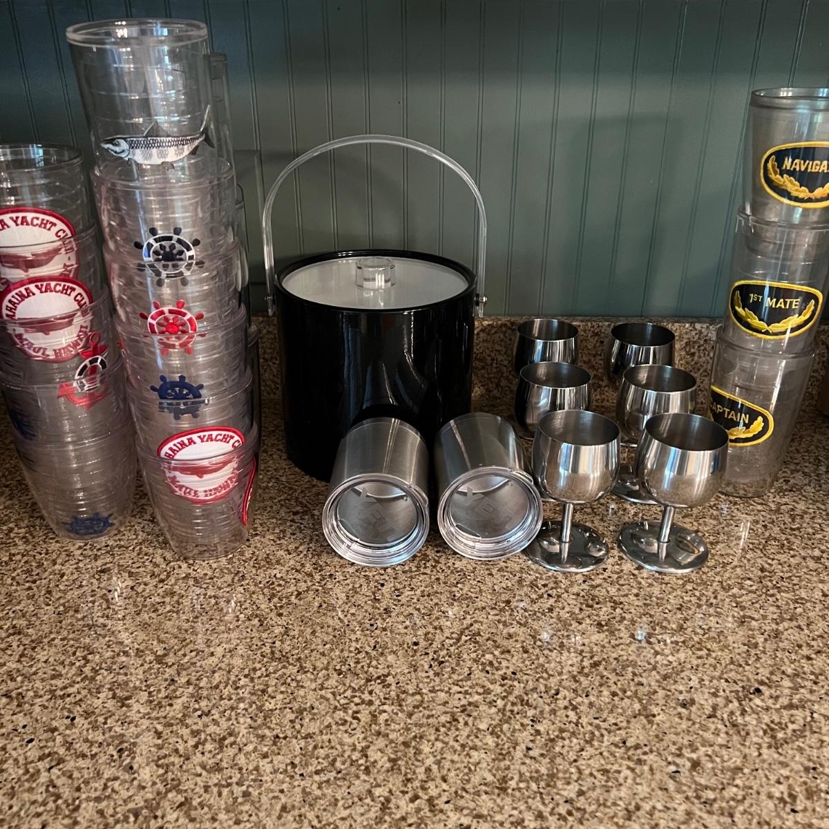 Two insulated Yeti cups each 3.5”D x 4.25”H. An ice bucket 7.6”D x 7”H. Sixteen nautical themed insulated cups. Six metal wine cups measure 2.5”D x 4.5”H.
