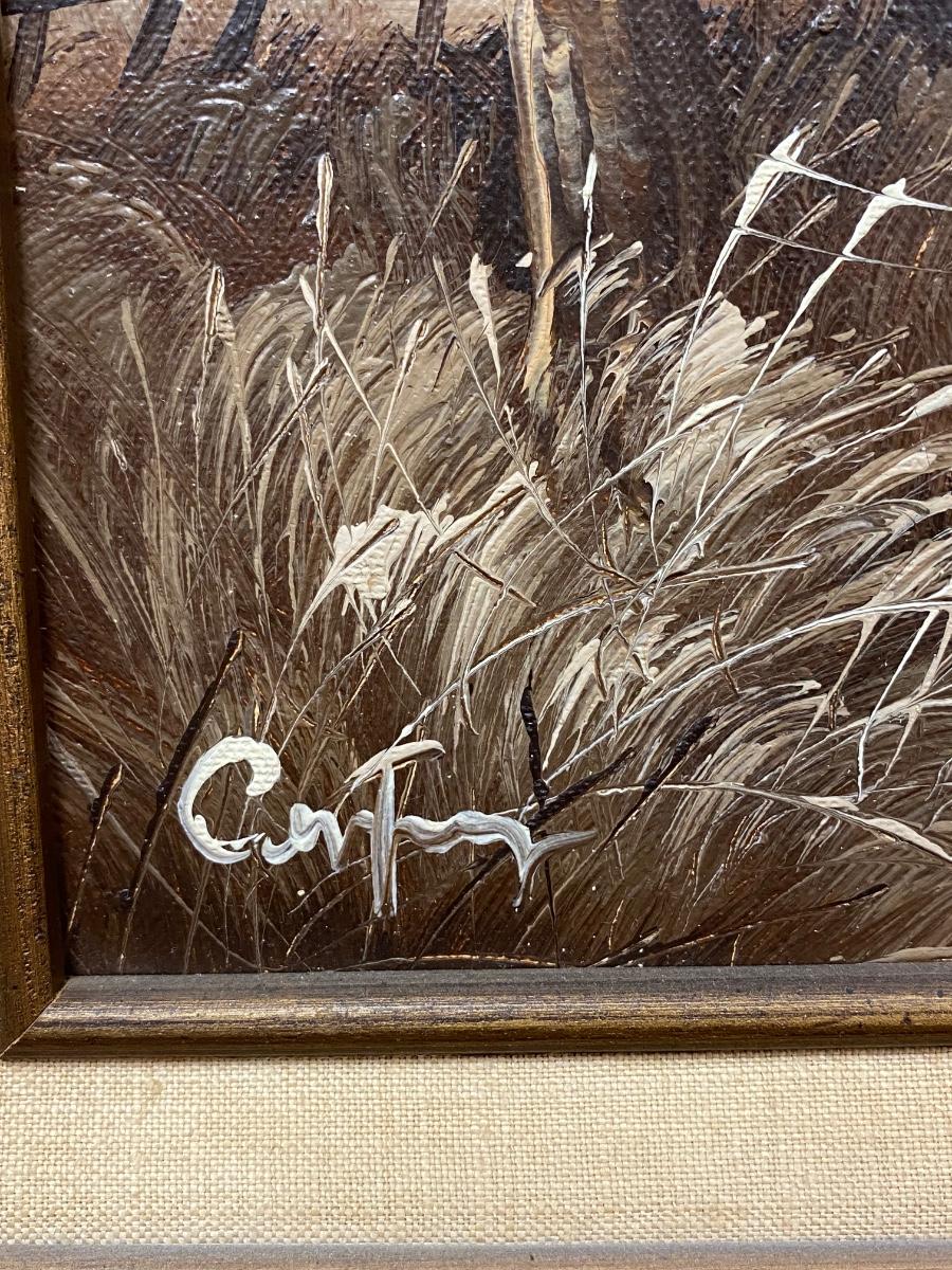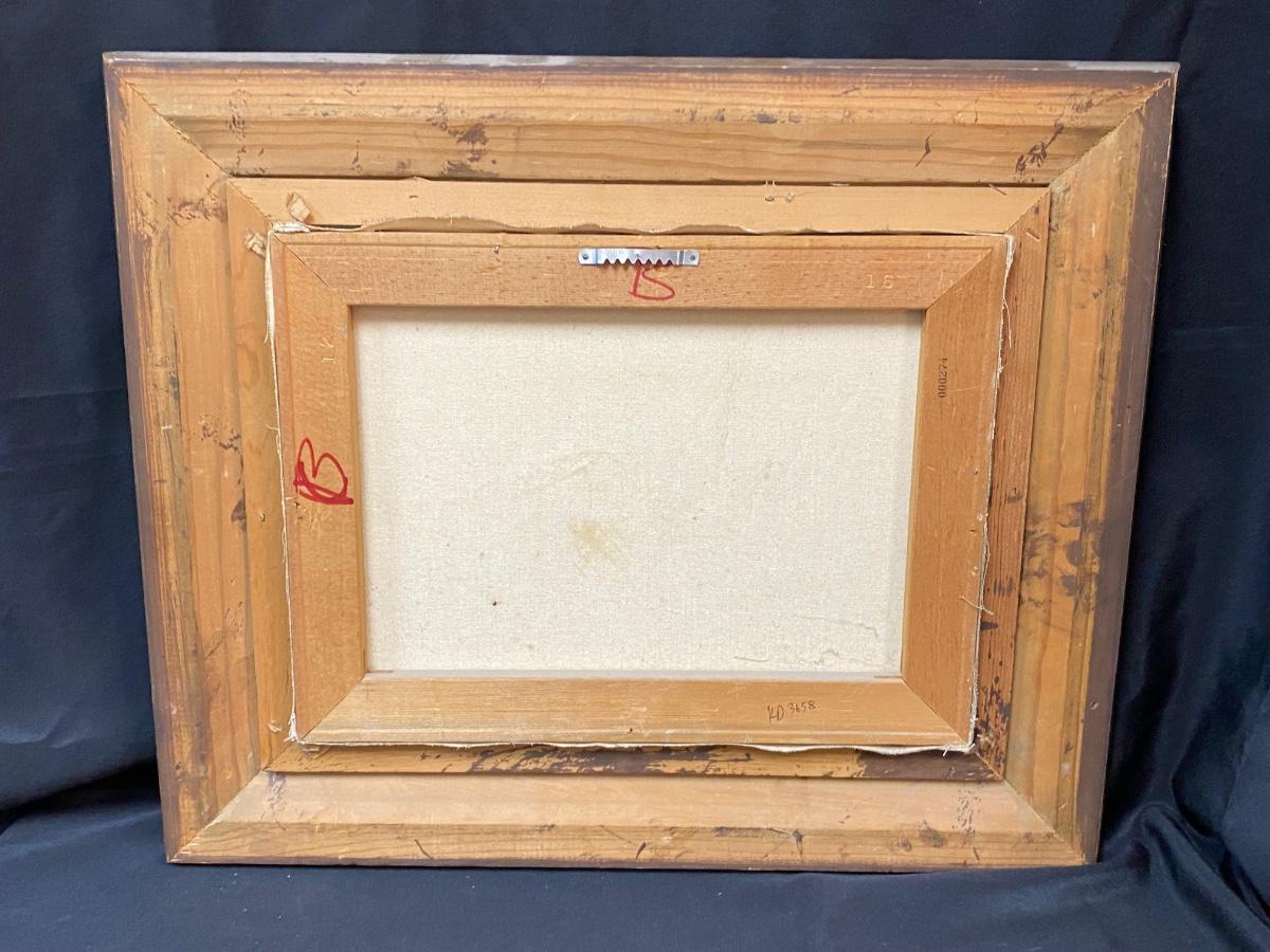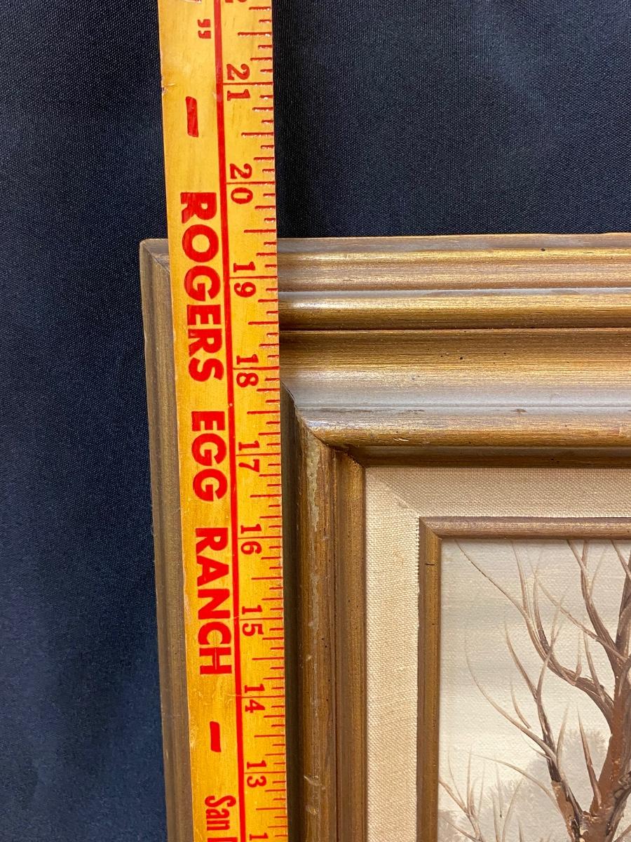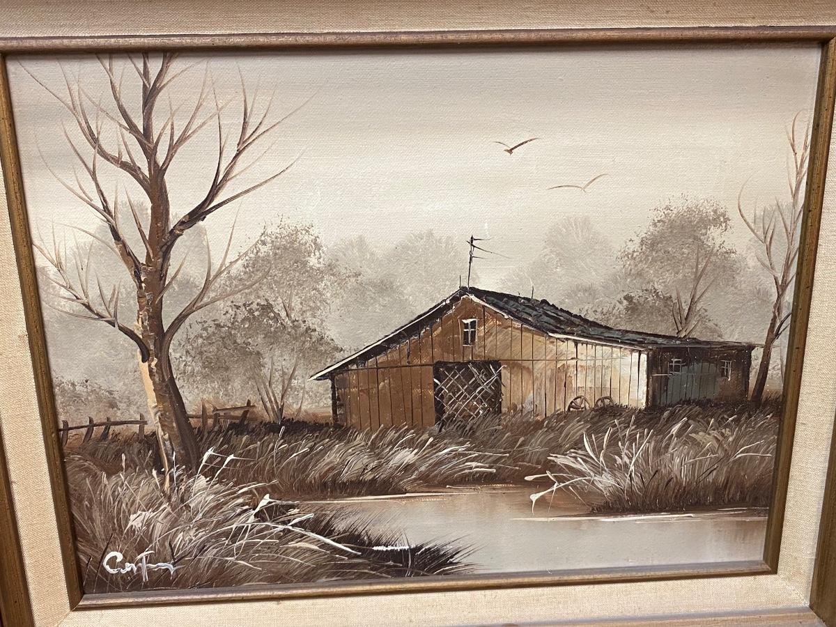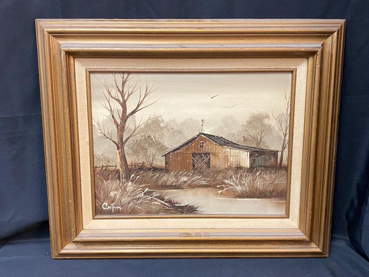 Vintage Rustic Old Barn by Pond with Dead Tree Oil Painting. In good vintage condition. A little bit of a sepia color palette used. About 19x23. Artist signed in left lower corner.