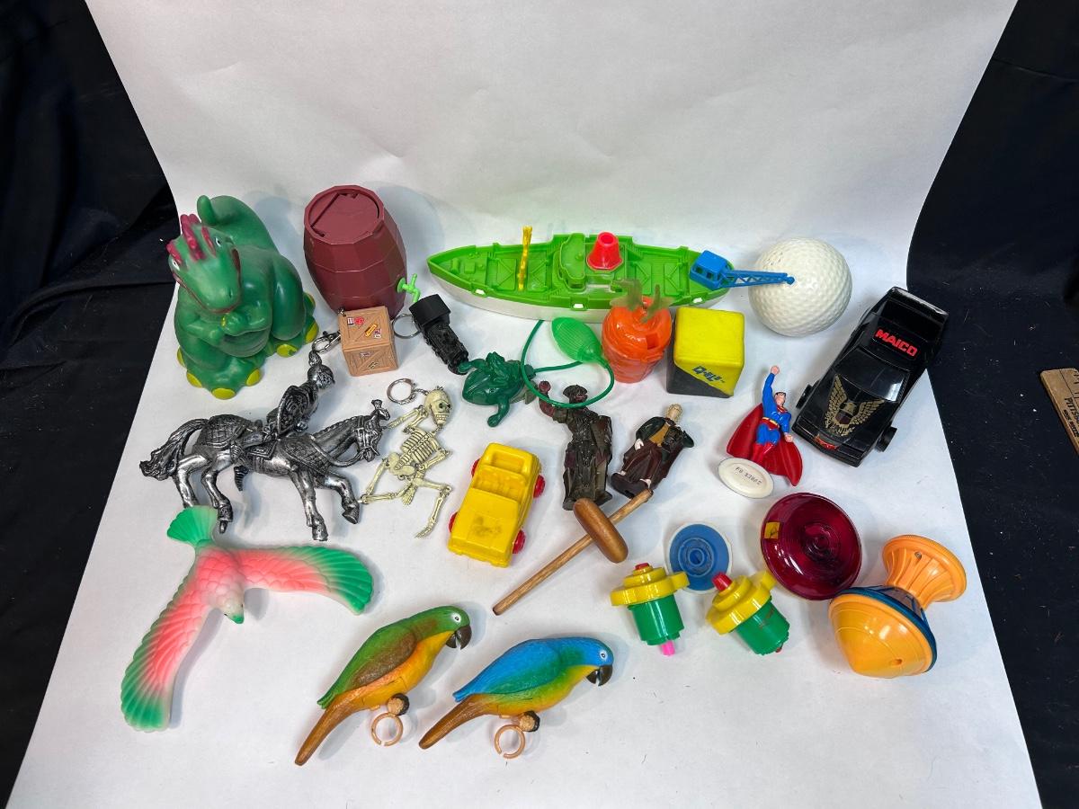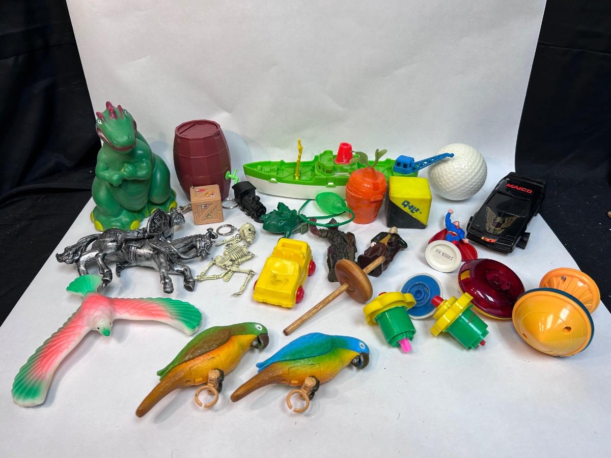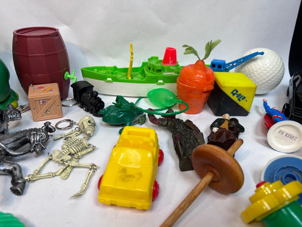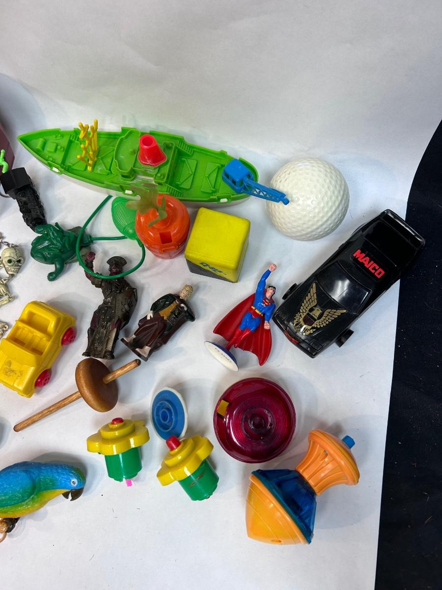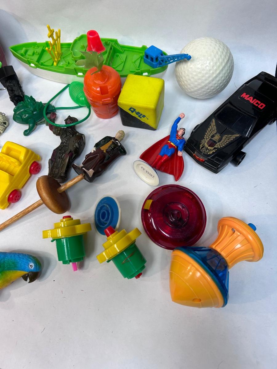 Random Plastic Toy Knick Knack Lot. Mixed lot of various tops, keychains, plastic toys and more. In good played with condition.