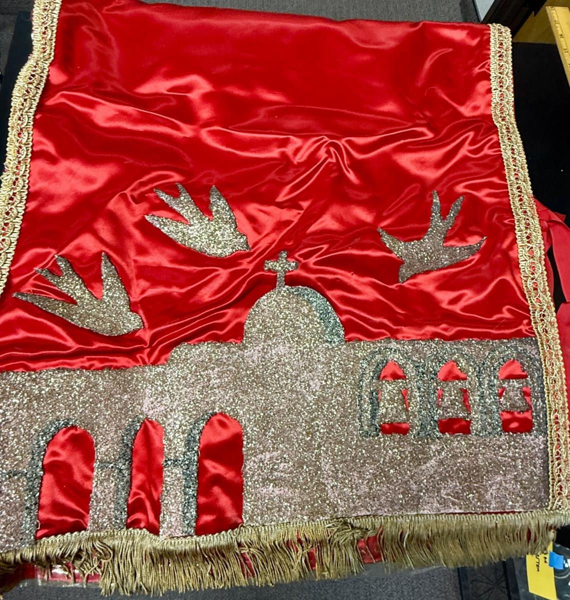 Beautiful red satin with gold trim. Images of the San Juan Capistrano and swallows. Backed with heavy clear vinyl or plastic on the back side. Approx. 88" x 22".